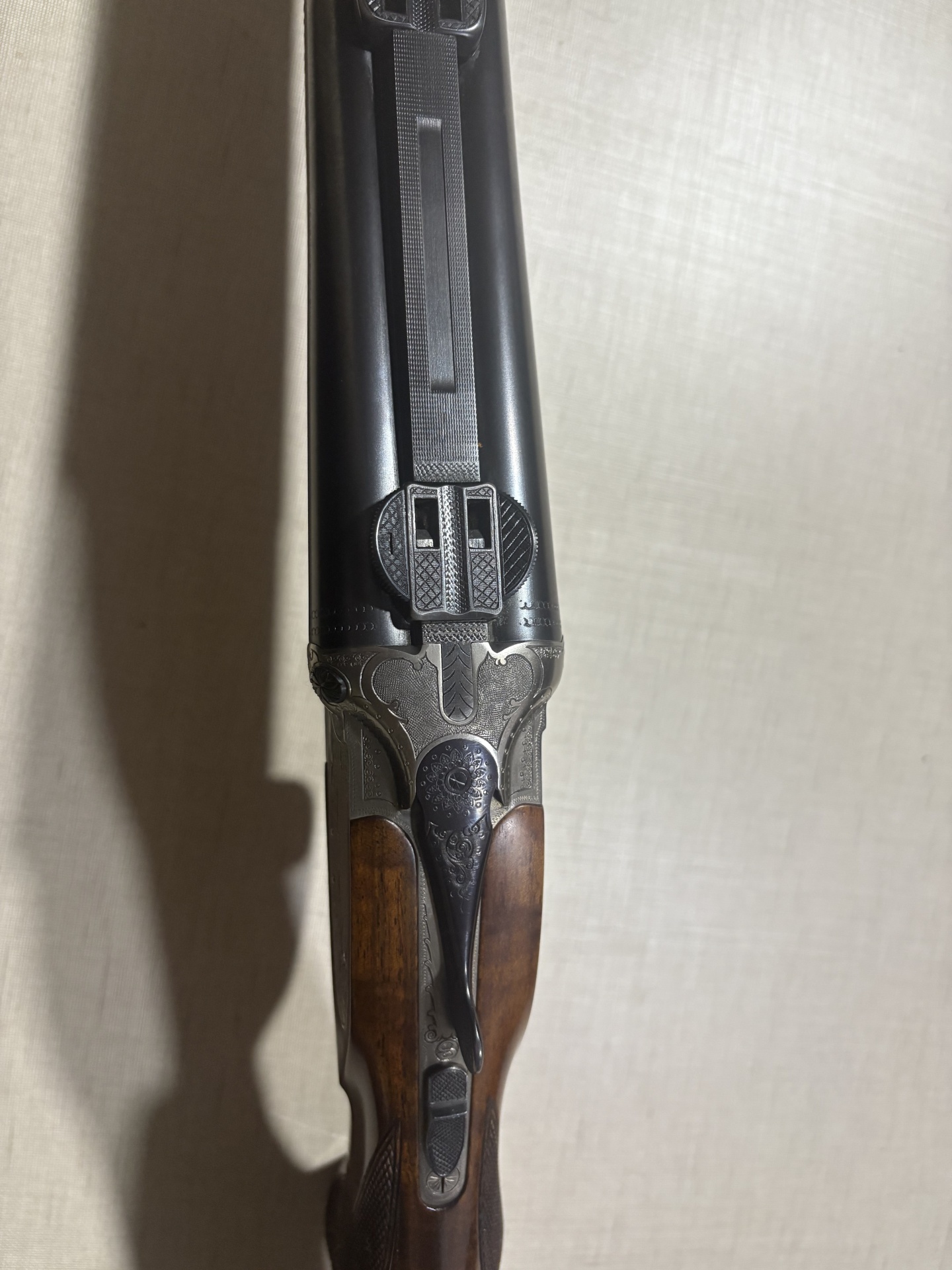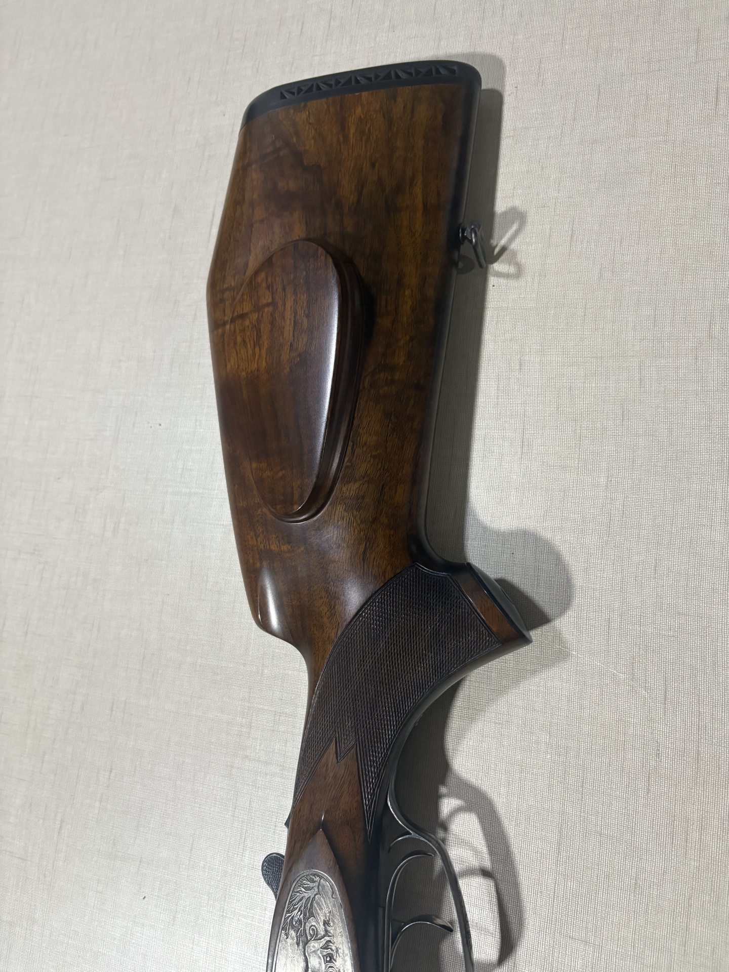 Espingarda de canos duplos com empunhadura de madeira e detalhes metálicos