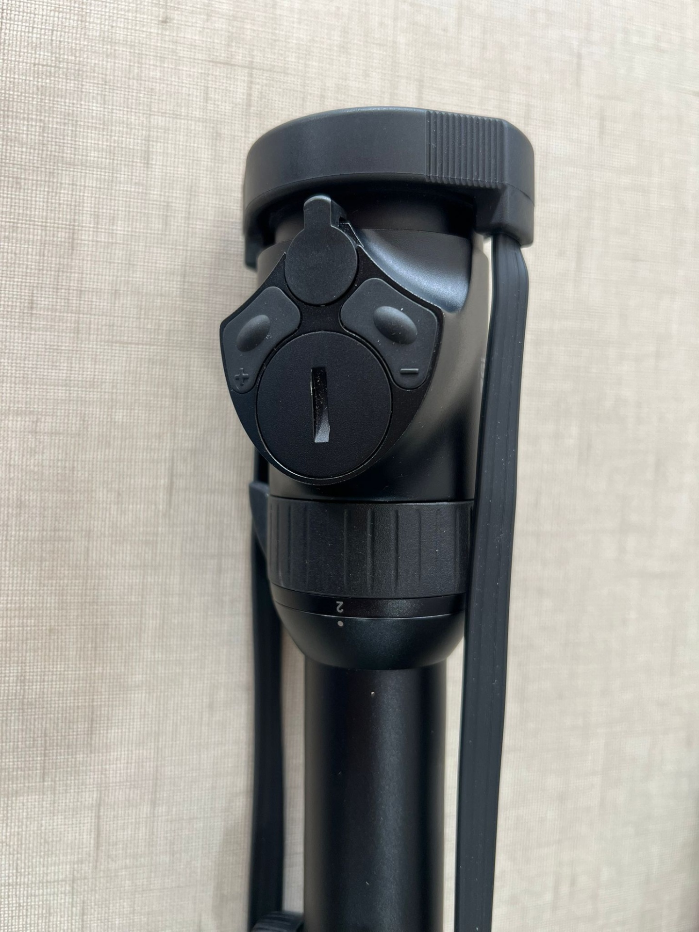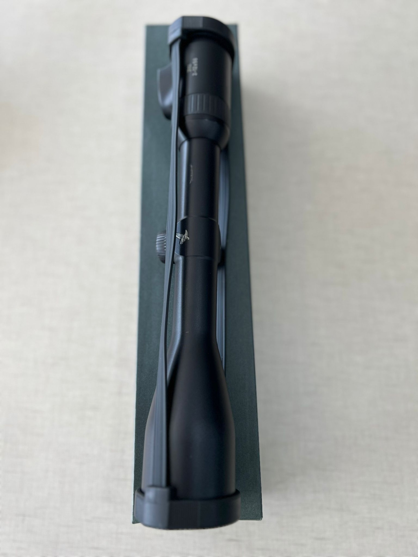Mira telescópica preta sobre superfície cinza de tecido