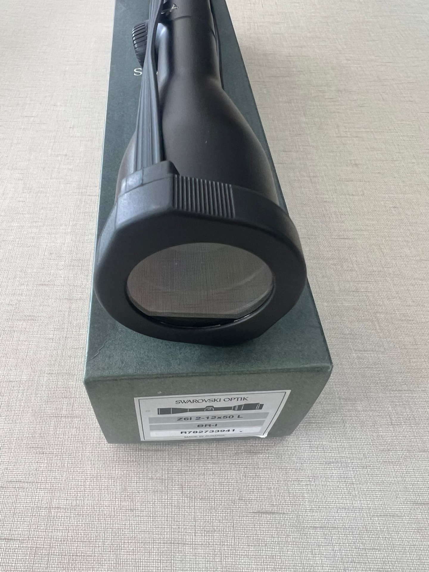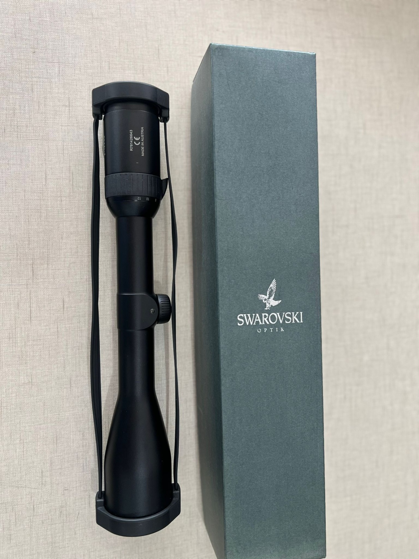 Luneta óptica preta ao lado de caixa verde com logotipo Swarovski Optik