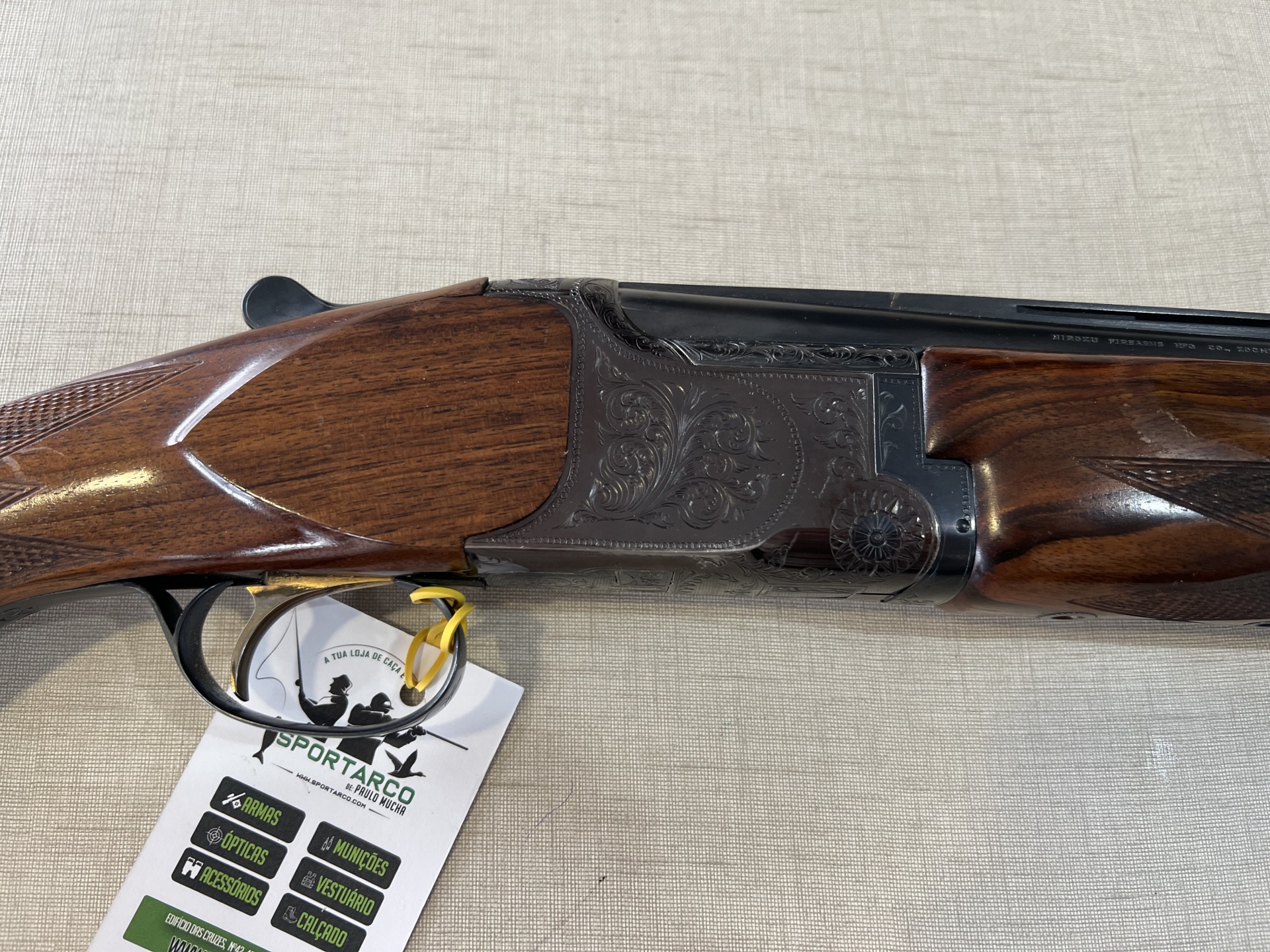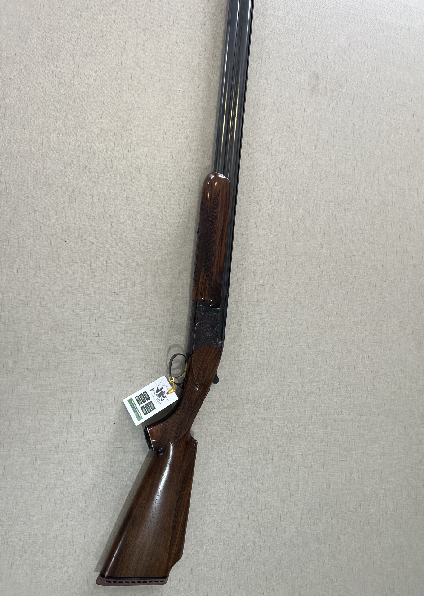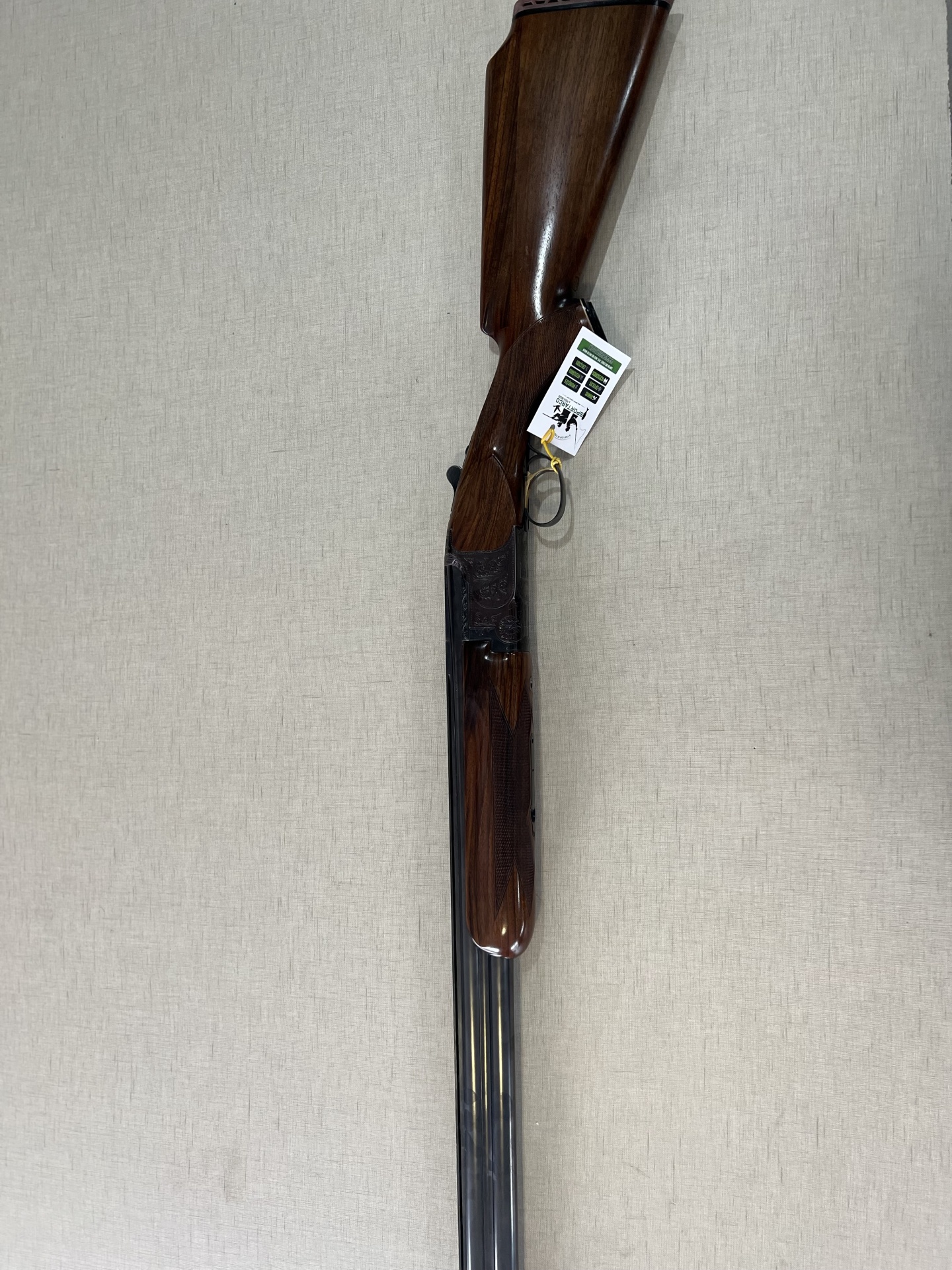 Espingarda de canos duplos em madeira castanho escuro e metal preto com etiqueta próxima ao gatilho