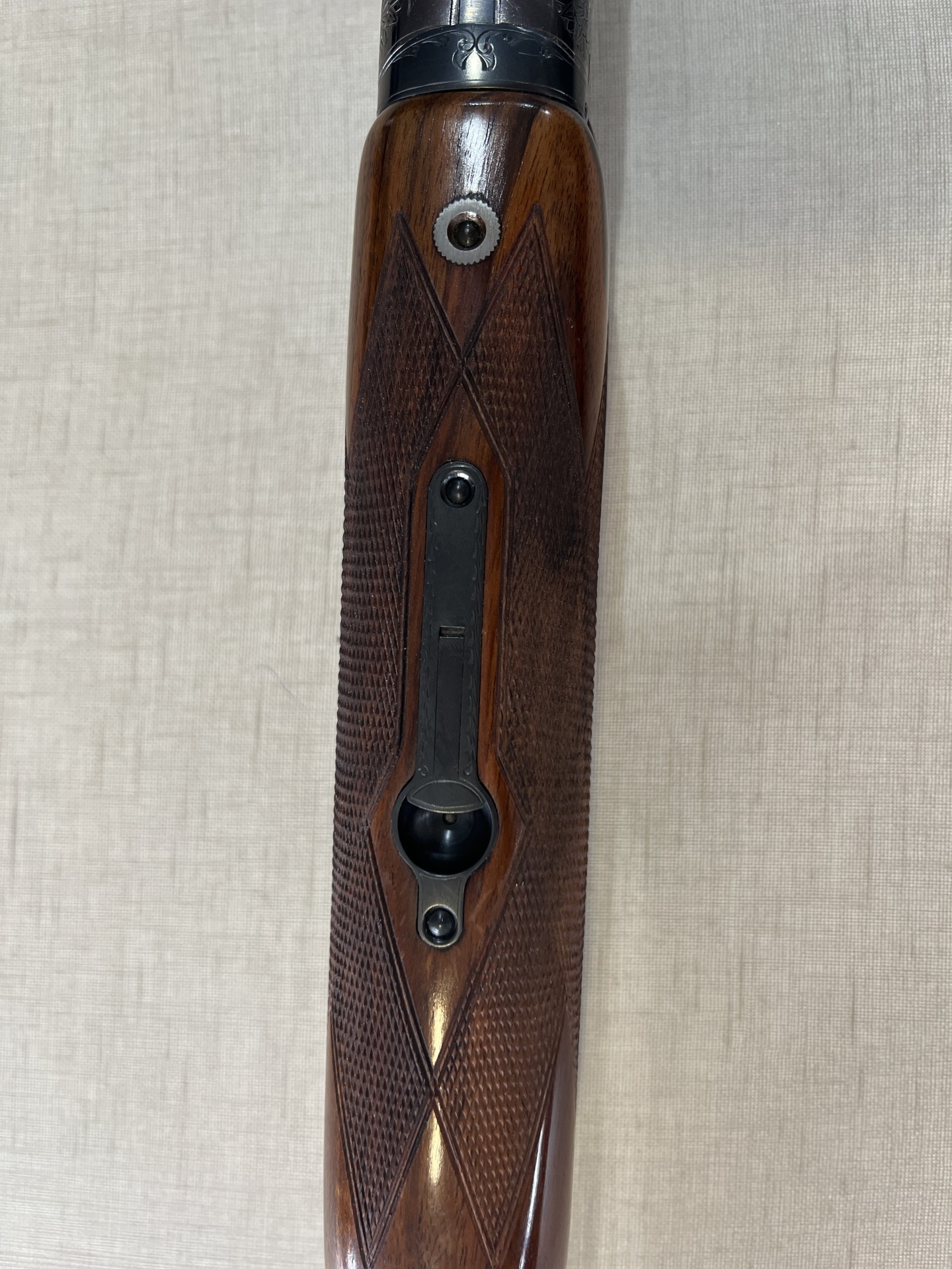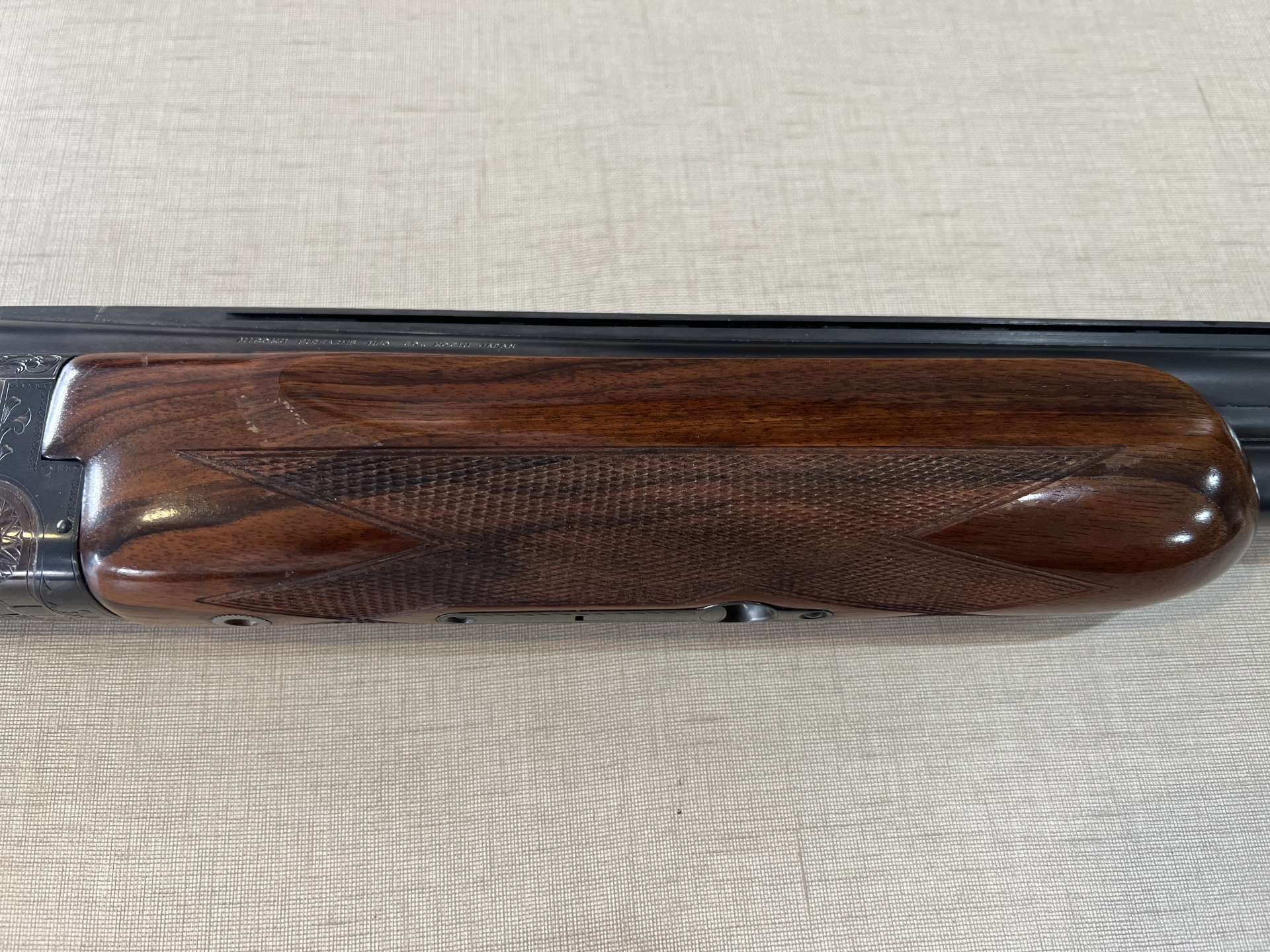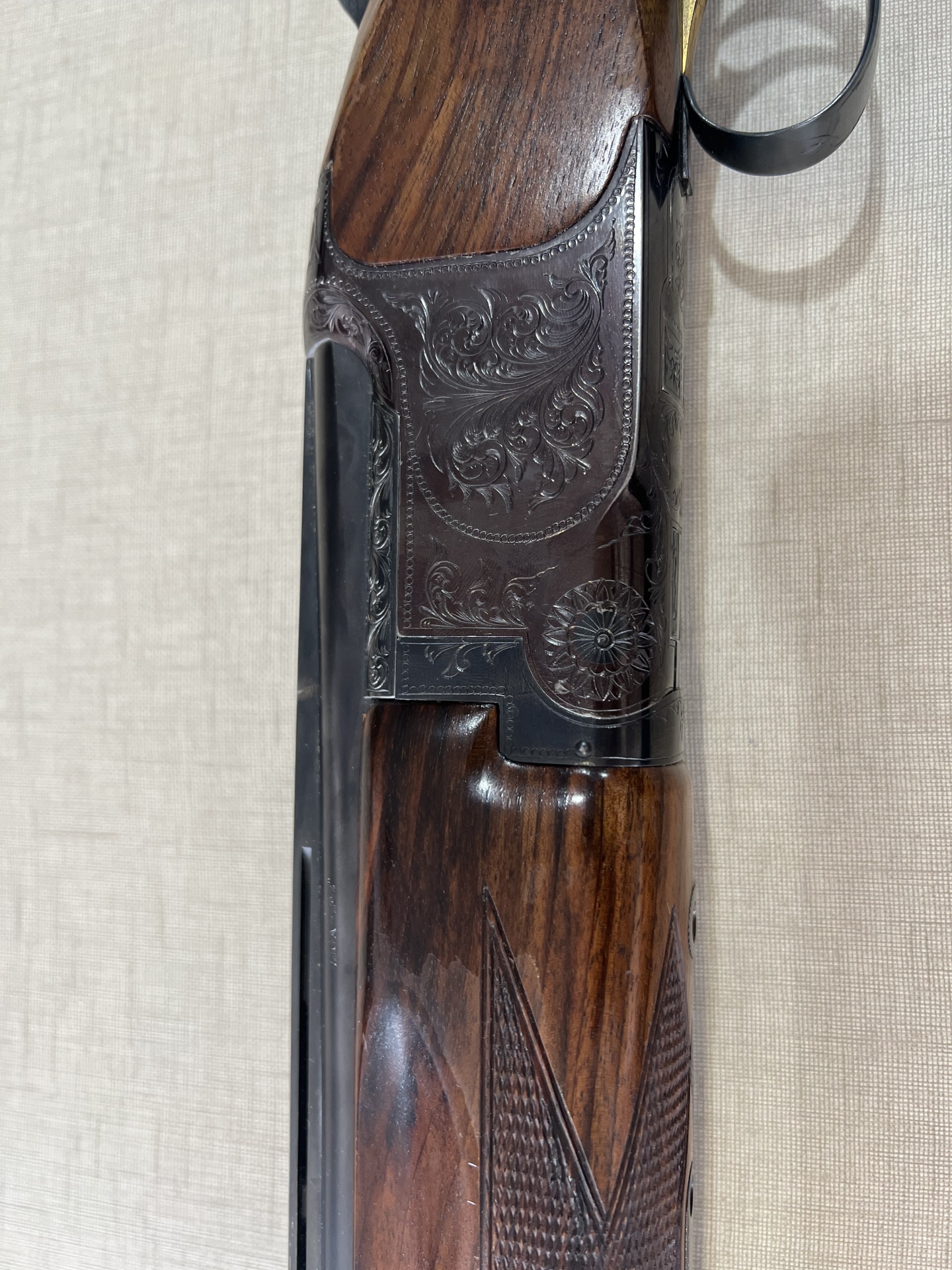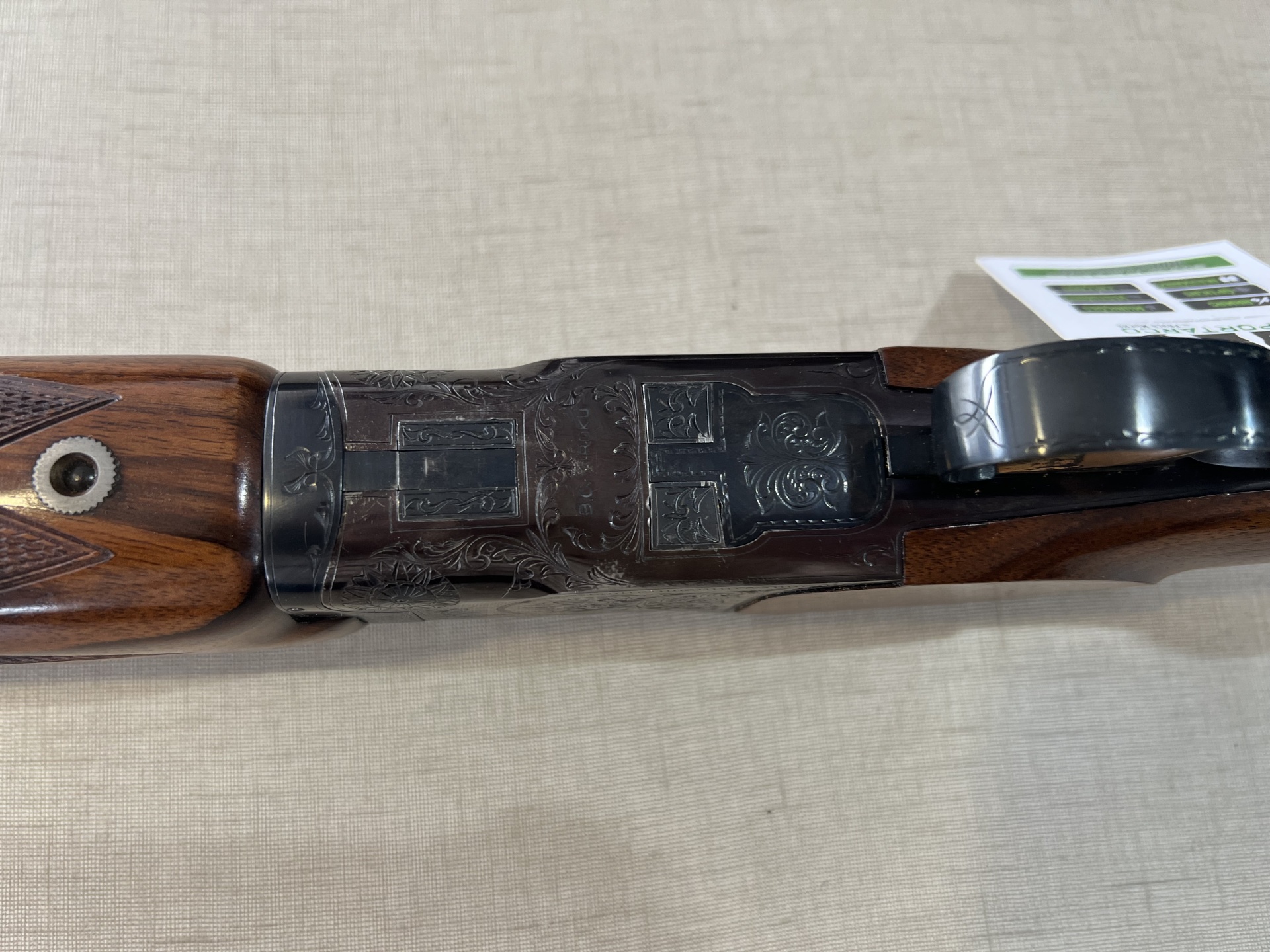 Espingarda de canos sobrepostos com madeira trabalhada e metal gravado