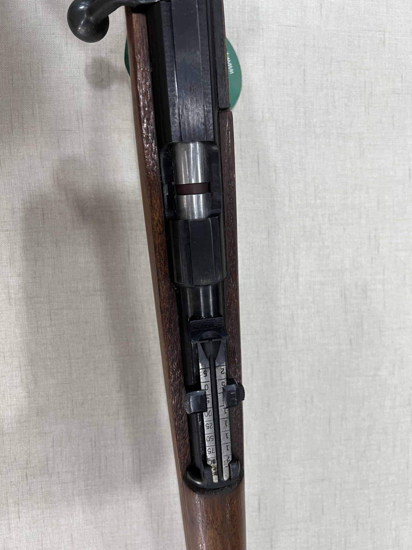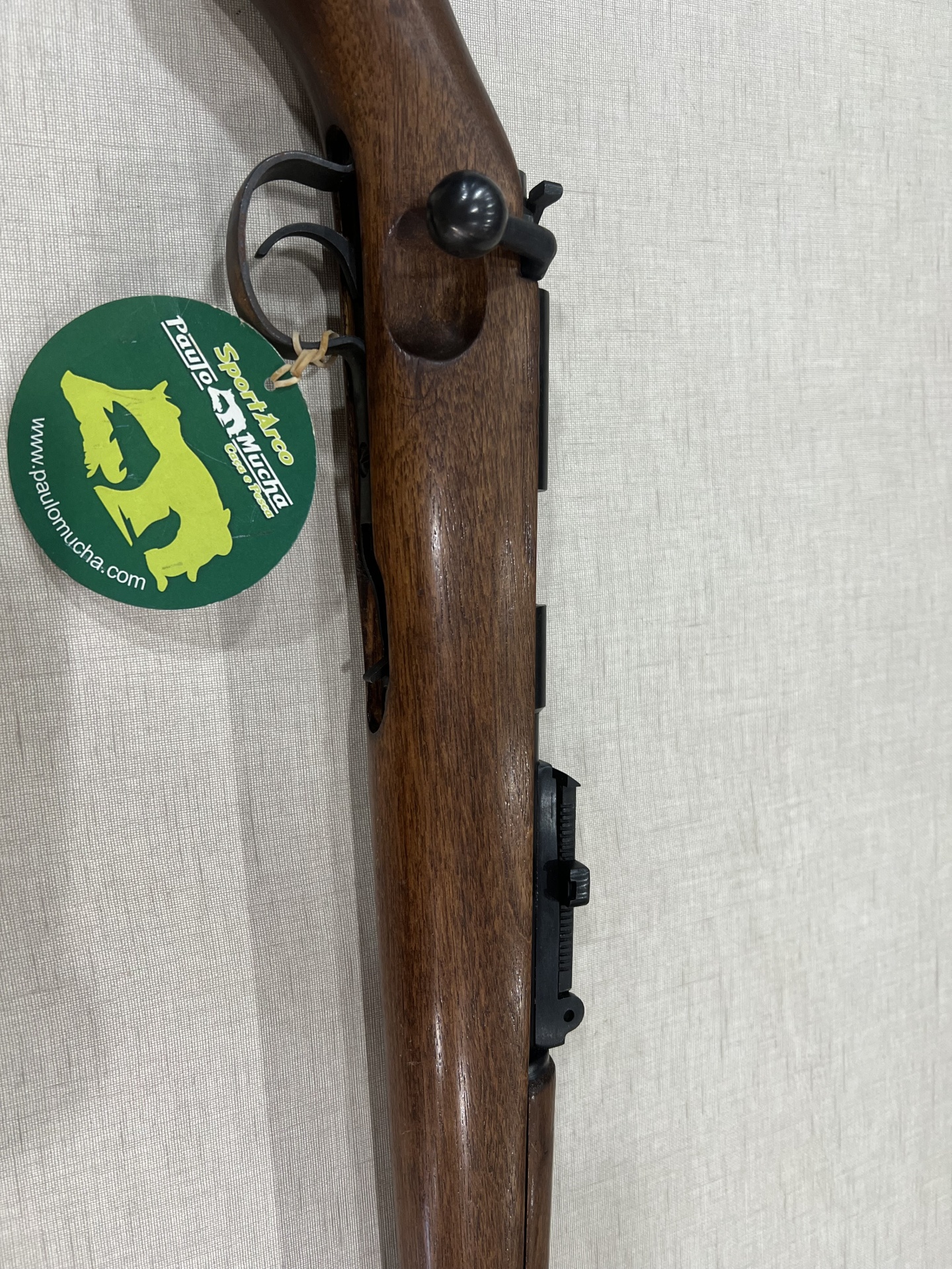 Rifle de madeira e metal com manípulo de ferrolho esférico e etiqueta verde