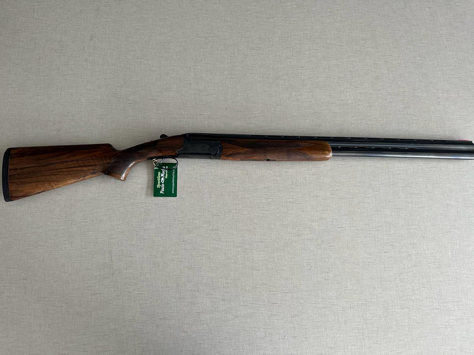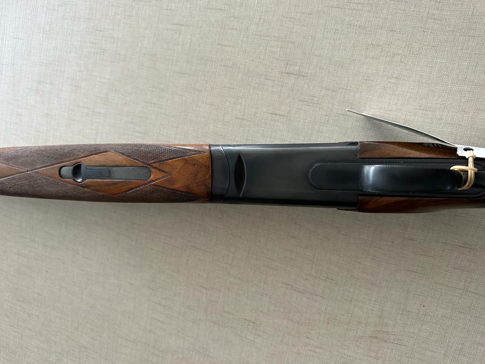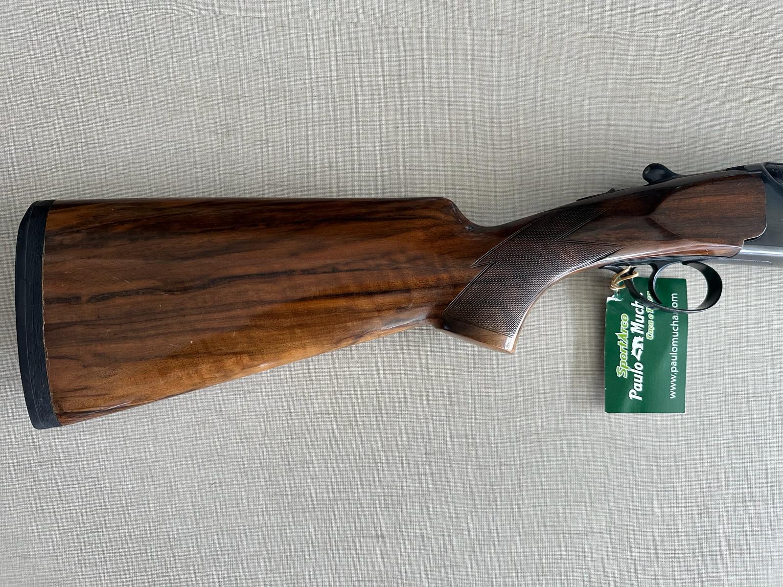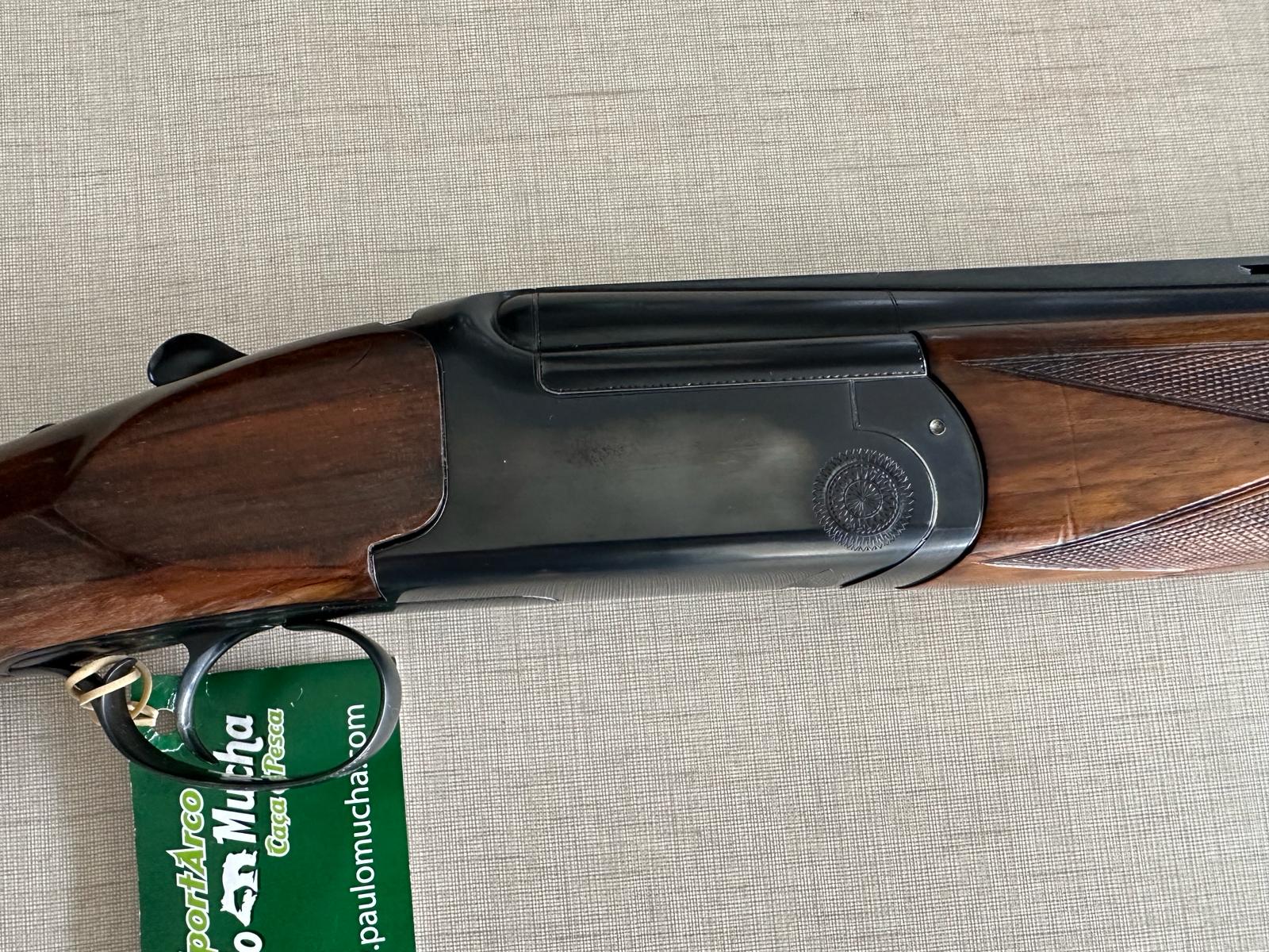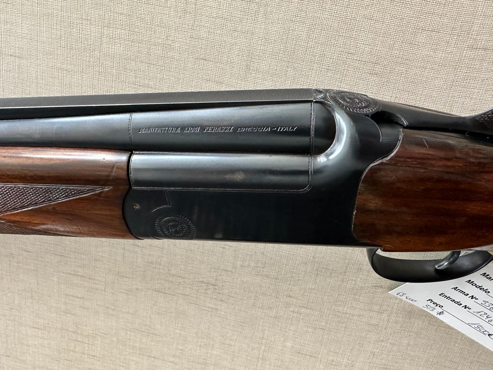 Carabina de canos paralelos em madeira e metal com etiqueta verde pendurada