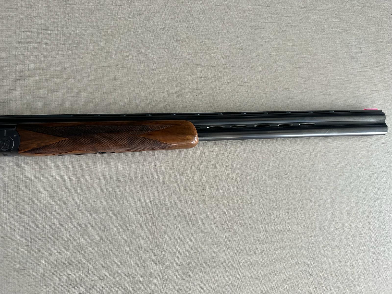 Espingarda com cano duplo preto e madeira escura sobre superfície clara