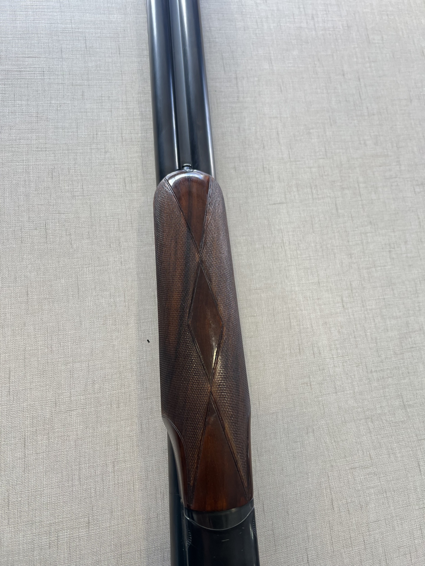 Arma de fogo com canos pretos e empunhadura de madeira escura em tecido cinzento