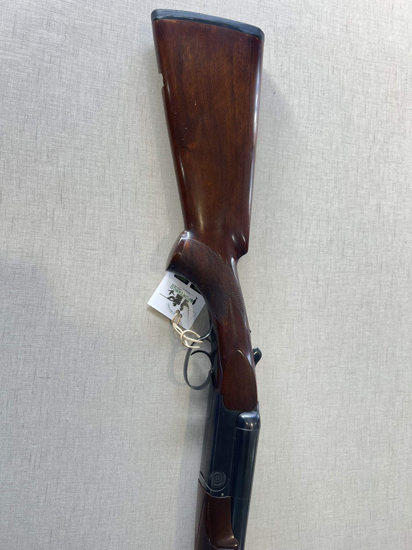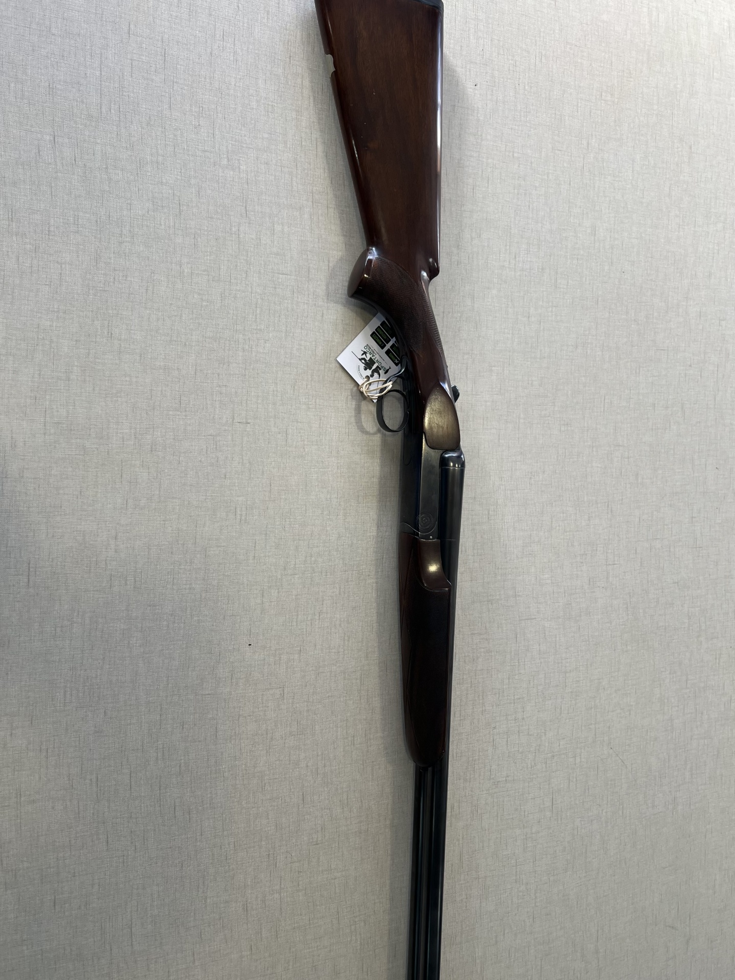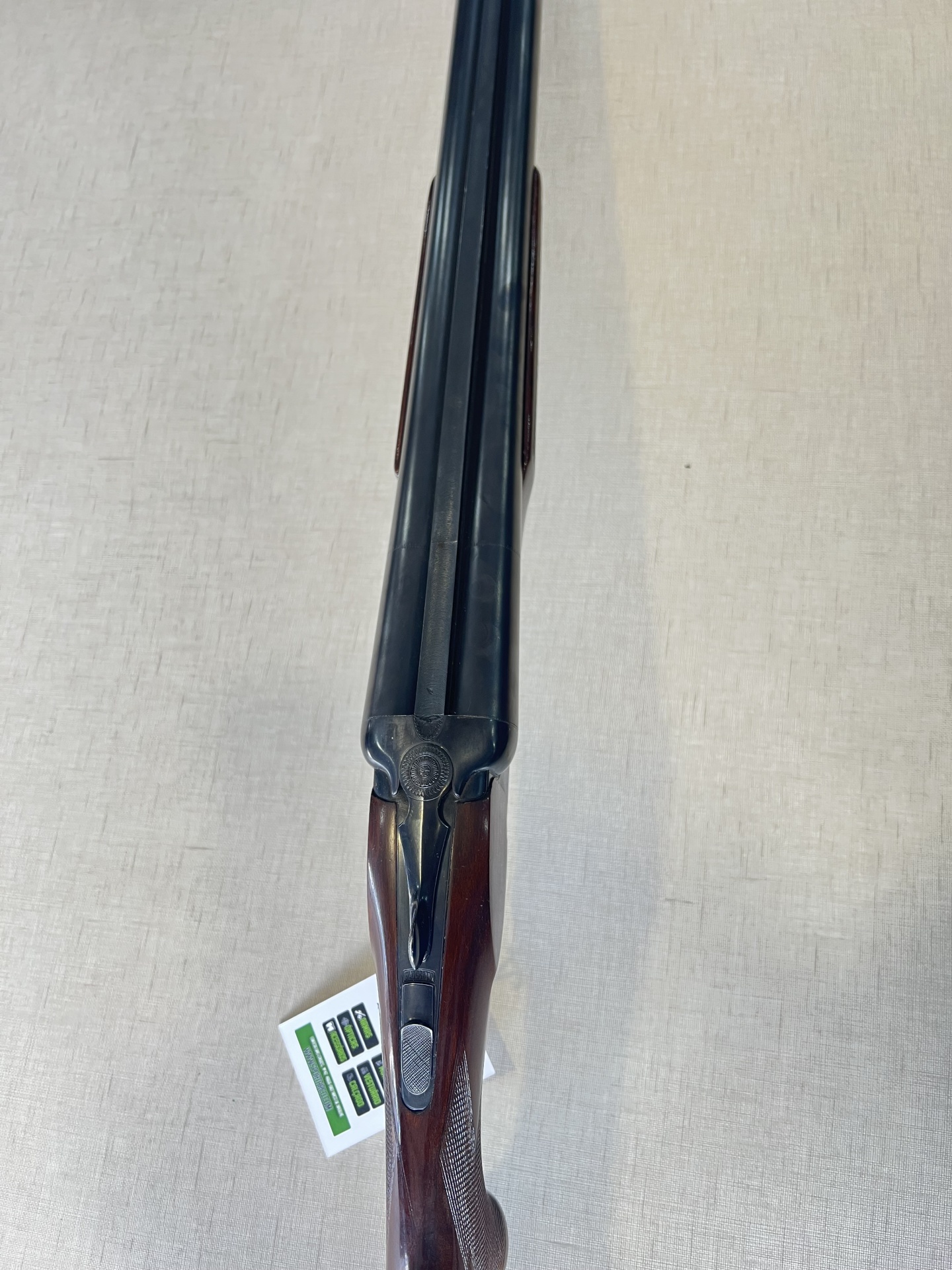 Espingarda de canos paralelos com madeira escura e canos pretos, com etiqueta branca