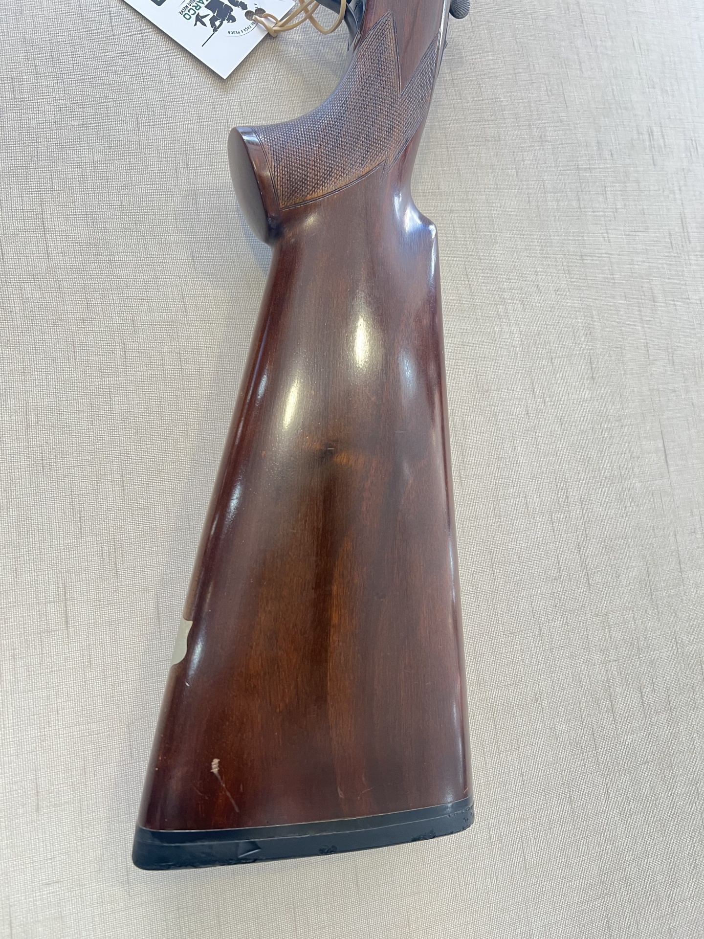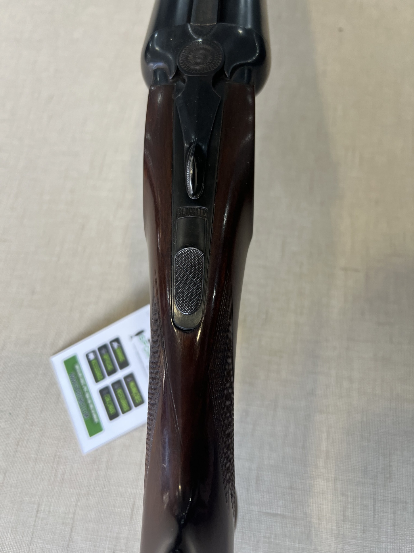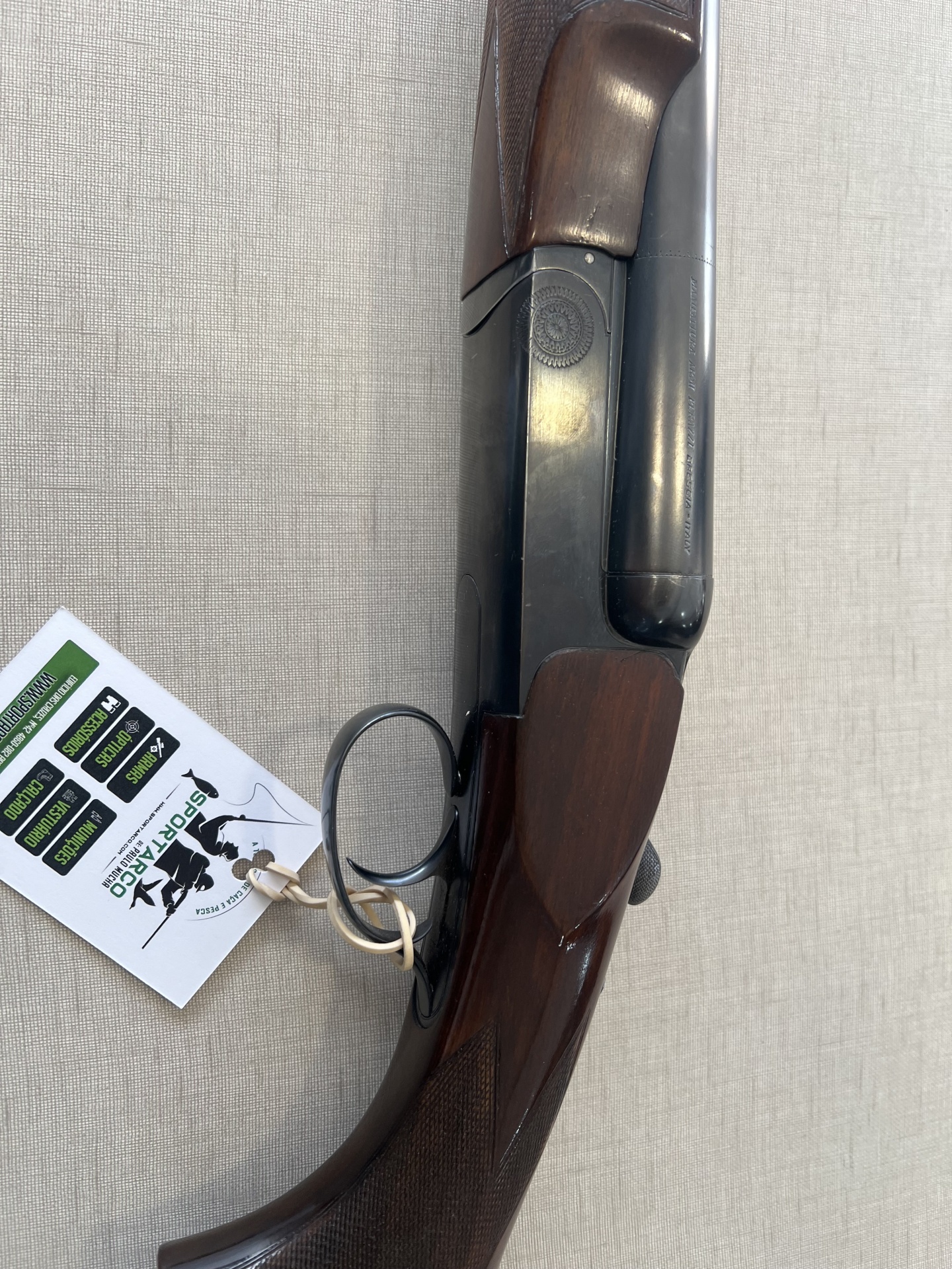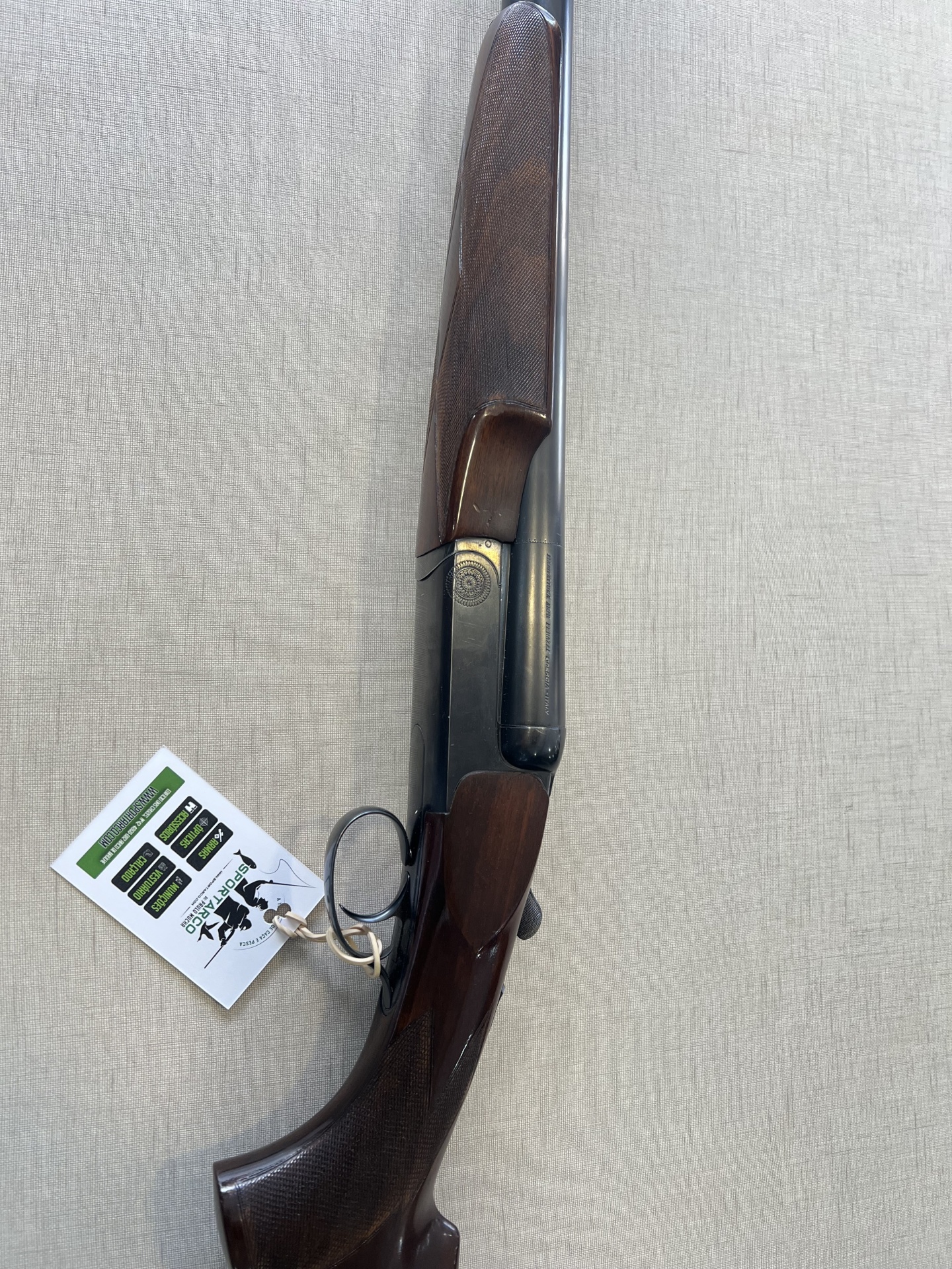Espingarda de canos paralelos com madeira escura e canos pretos, com etiqueta branca