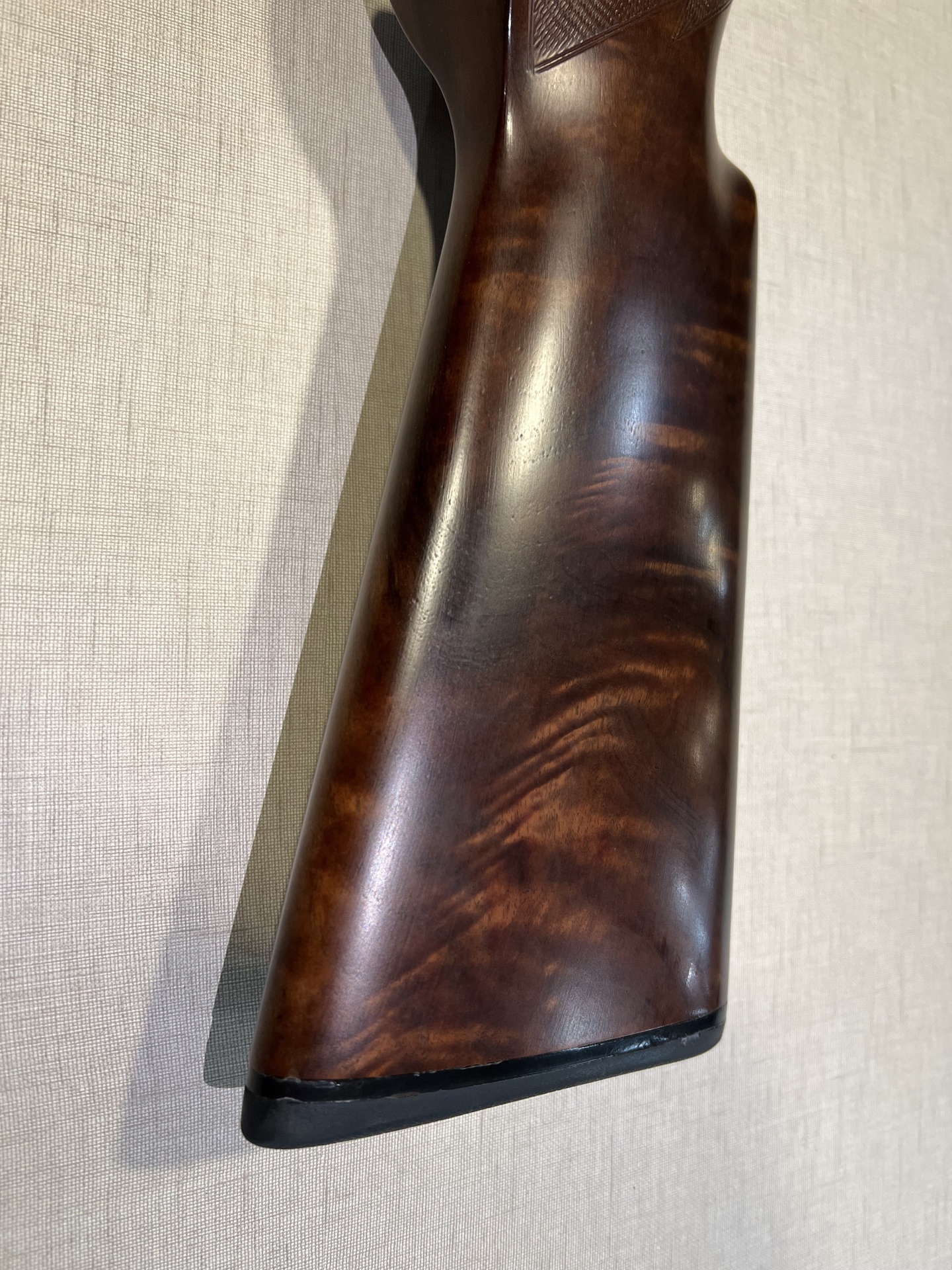 Cabo de espingarda em madeira castanha polida com padrão natural próximo a uma parede bege texturizada