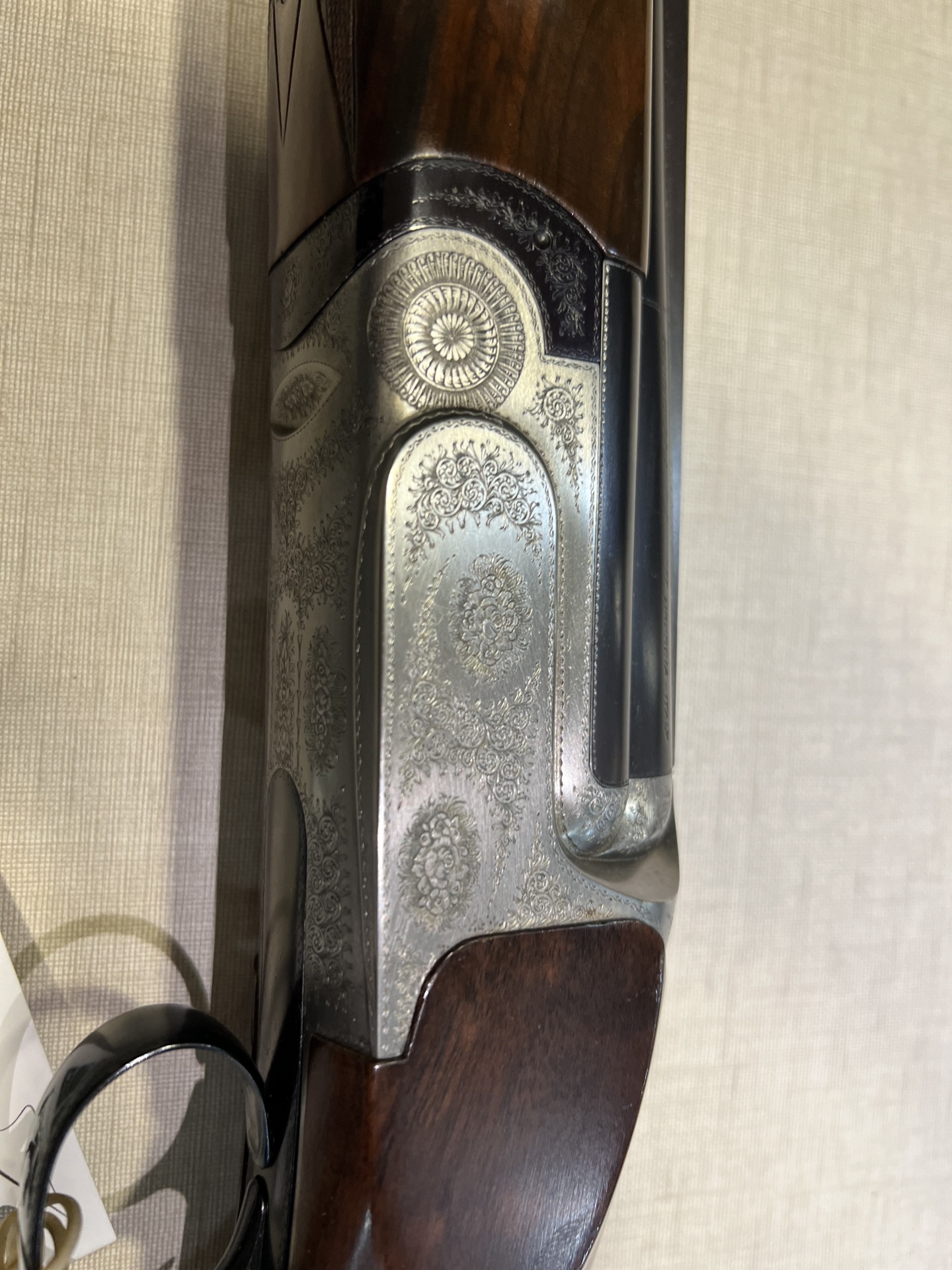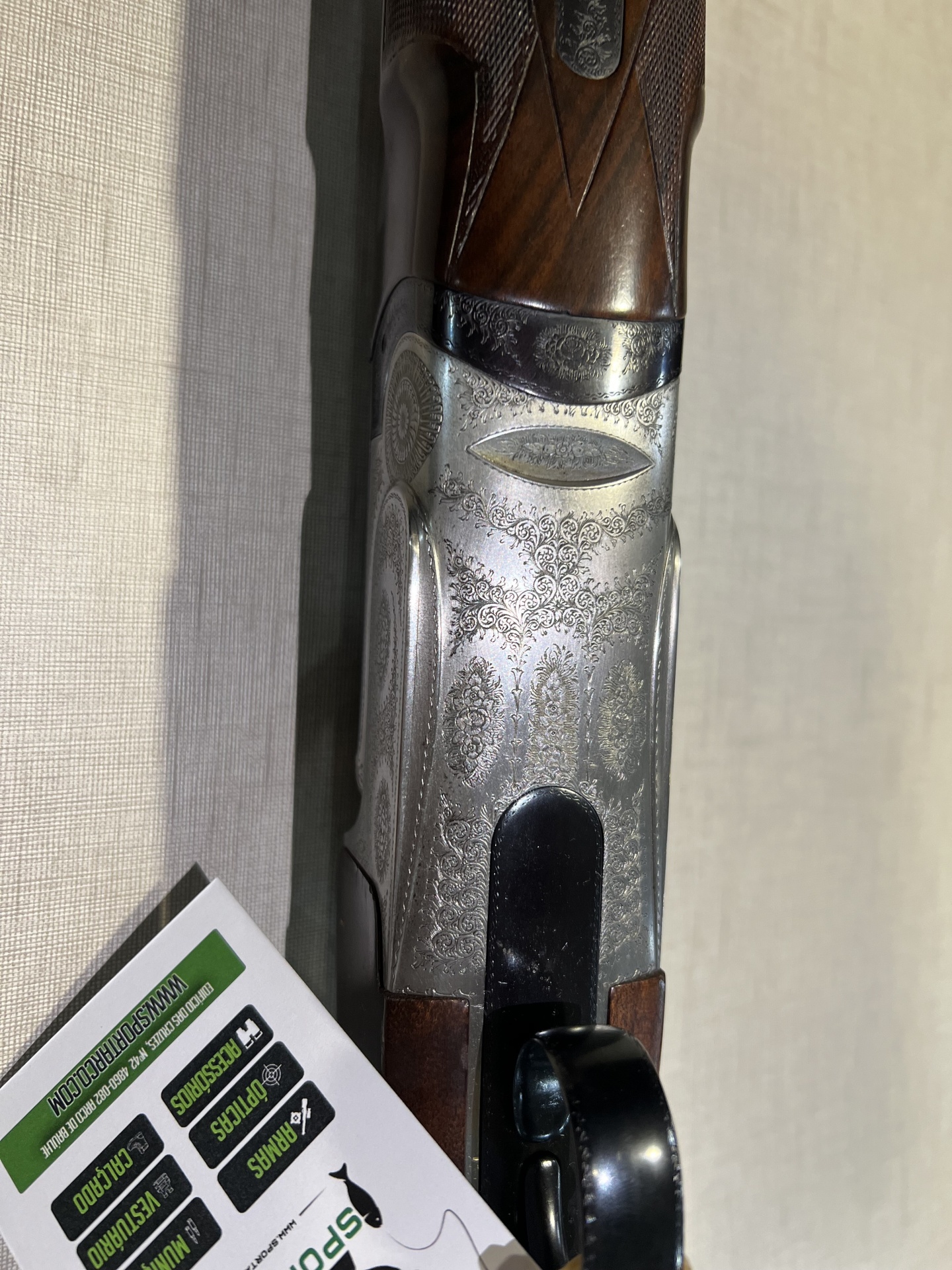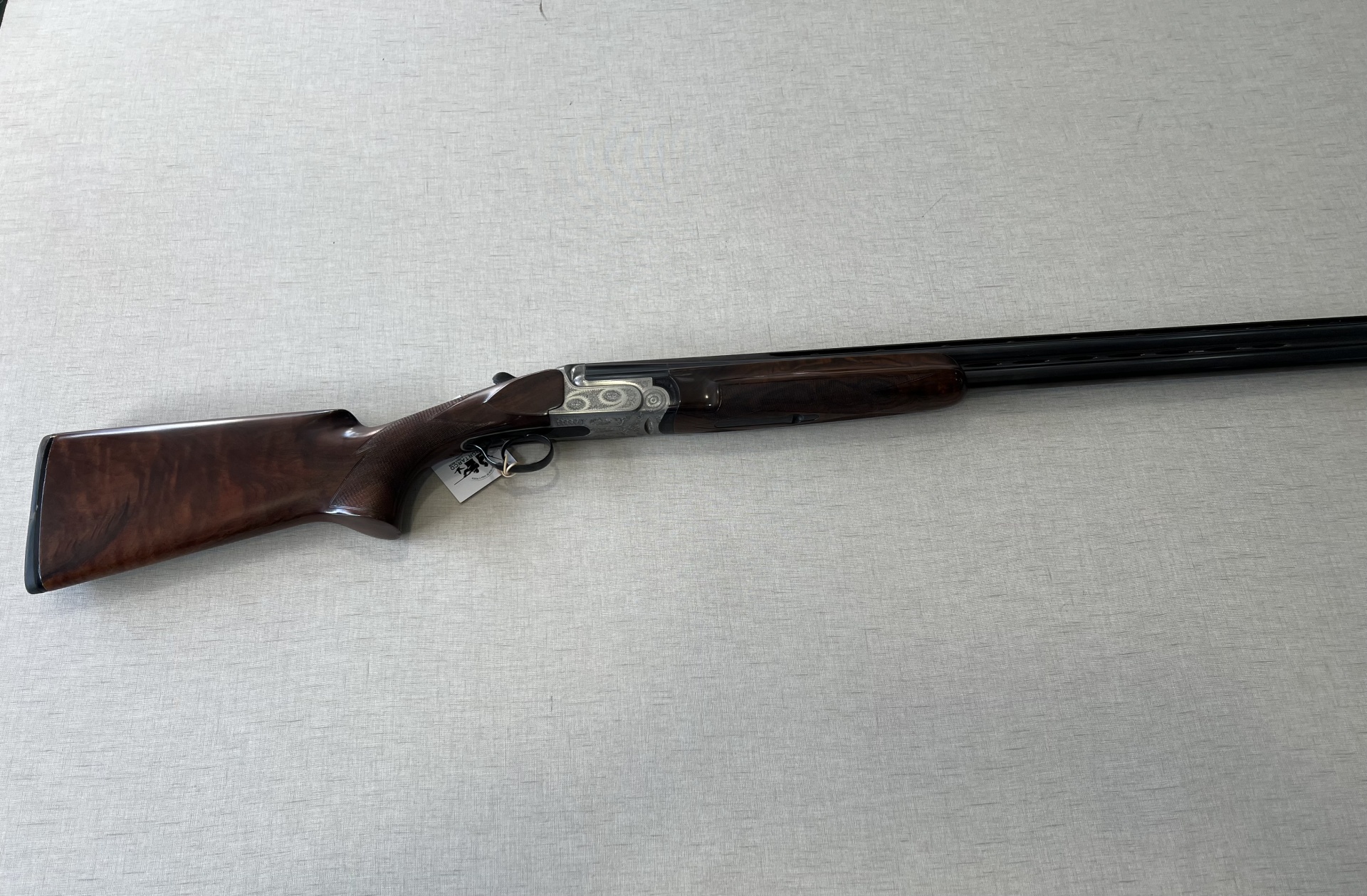 Espingarda de canos duplos com madeira castanha e metal preto sobre fundo cinza claro