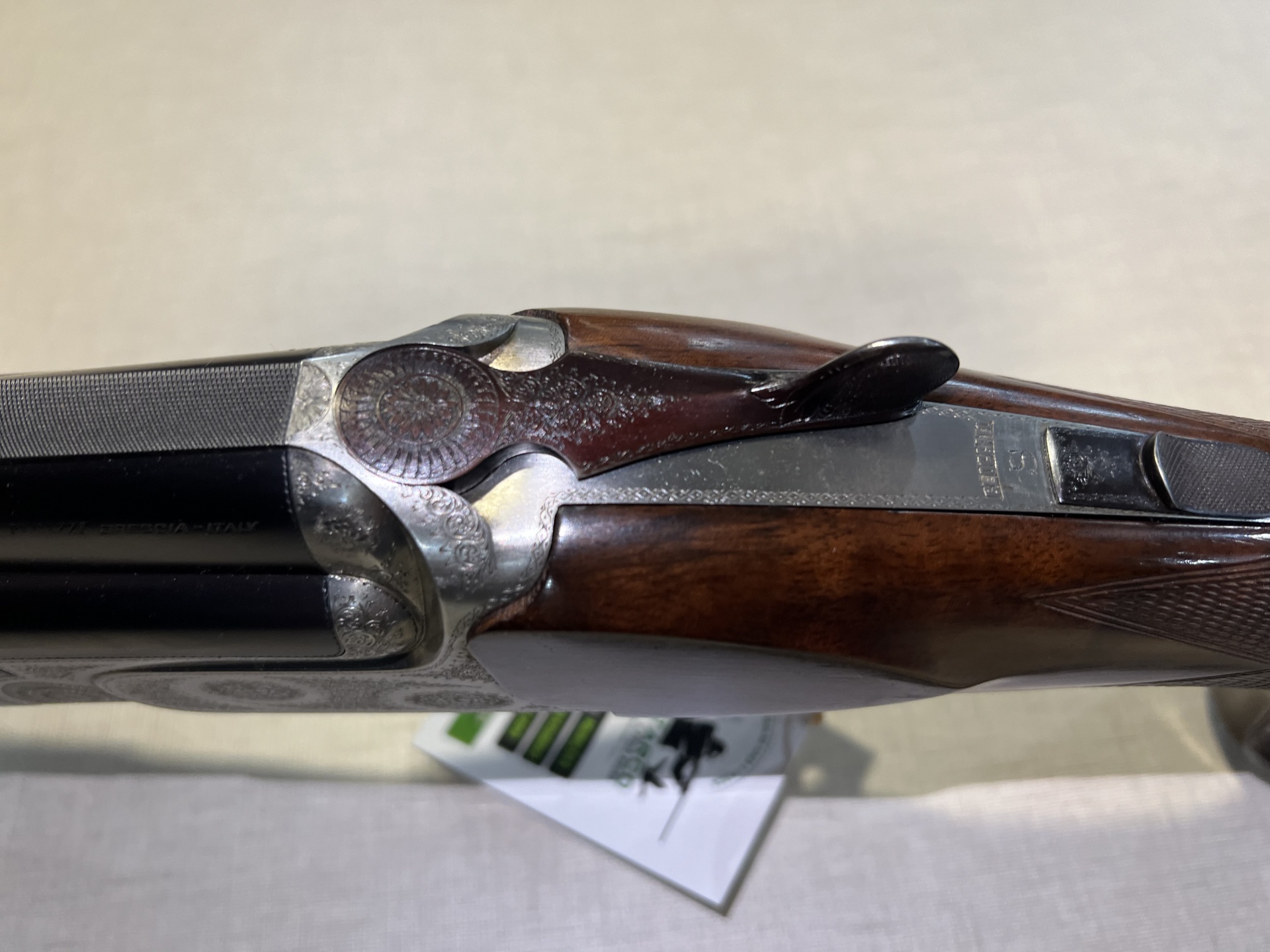 Arma de fogo de cano duplo com coronha de madeira e mecanismo metálico com etiqueta