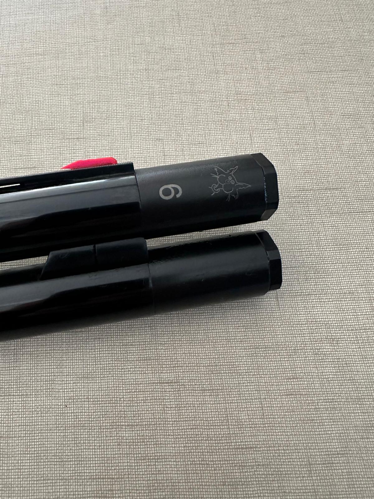 Duas canetas pretas sobre superfície bege com número 6 e símbolo gravado na tampa