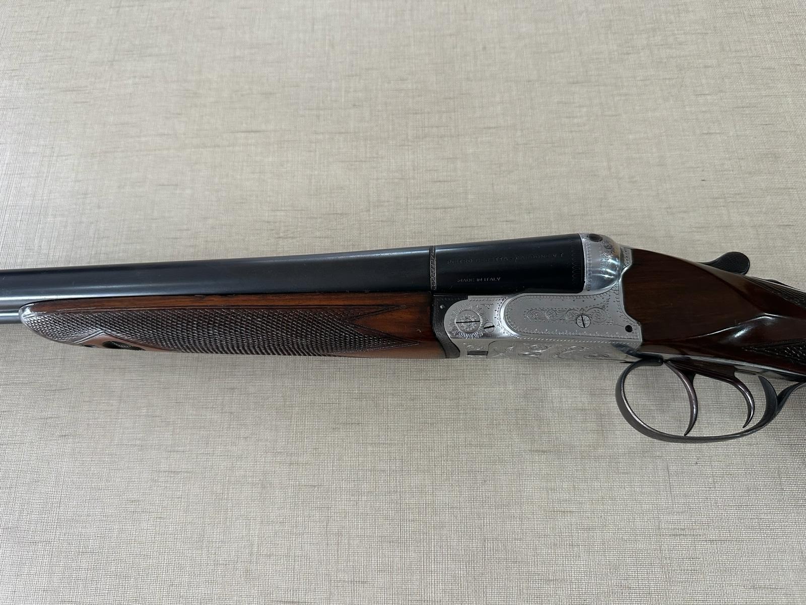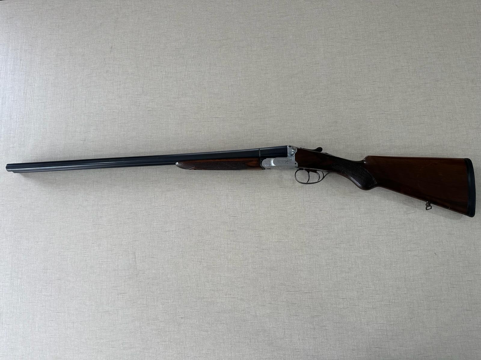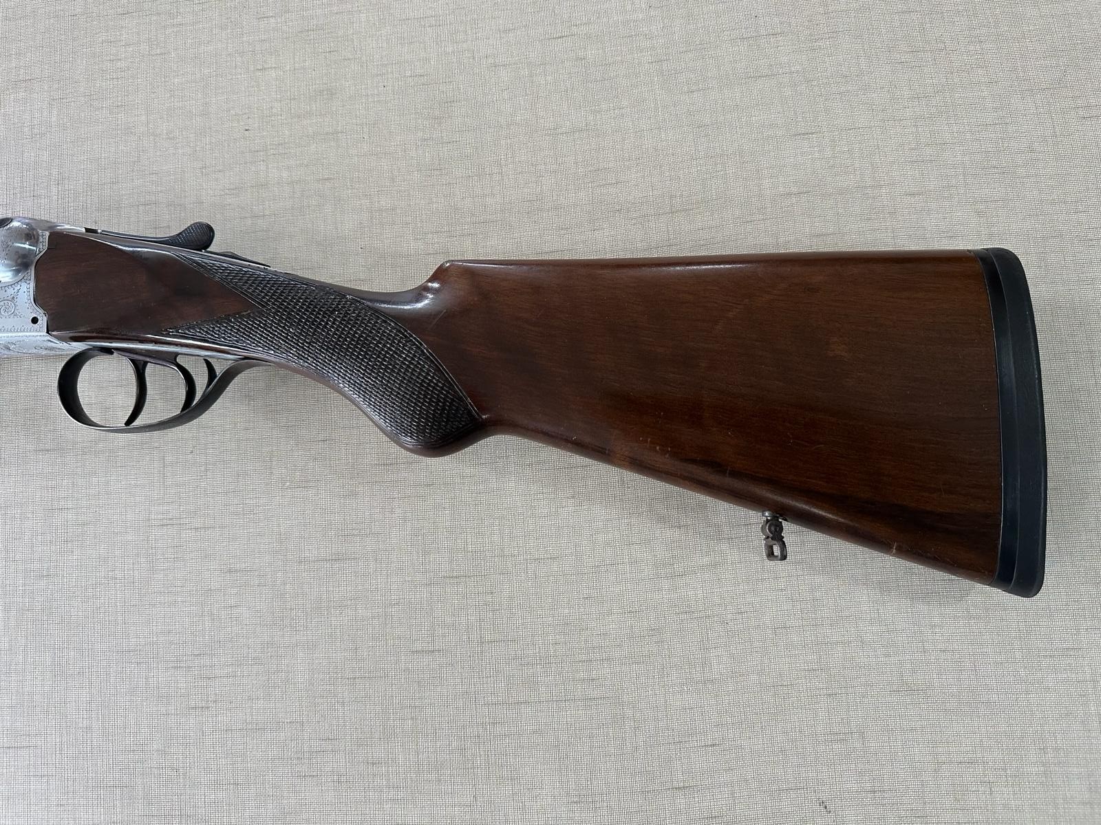 Espingarda de cano duplo com detalhes em madeira e metal.