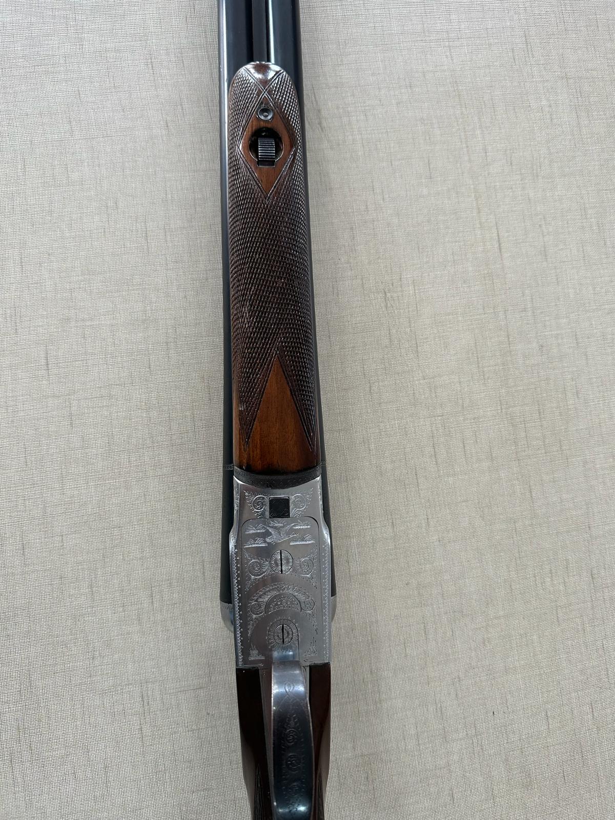 Espingarda de canos duplos com acabamento em madeira e metal gravado