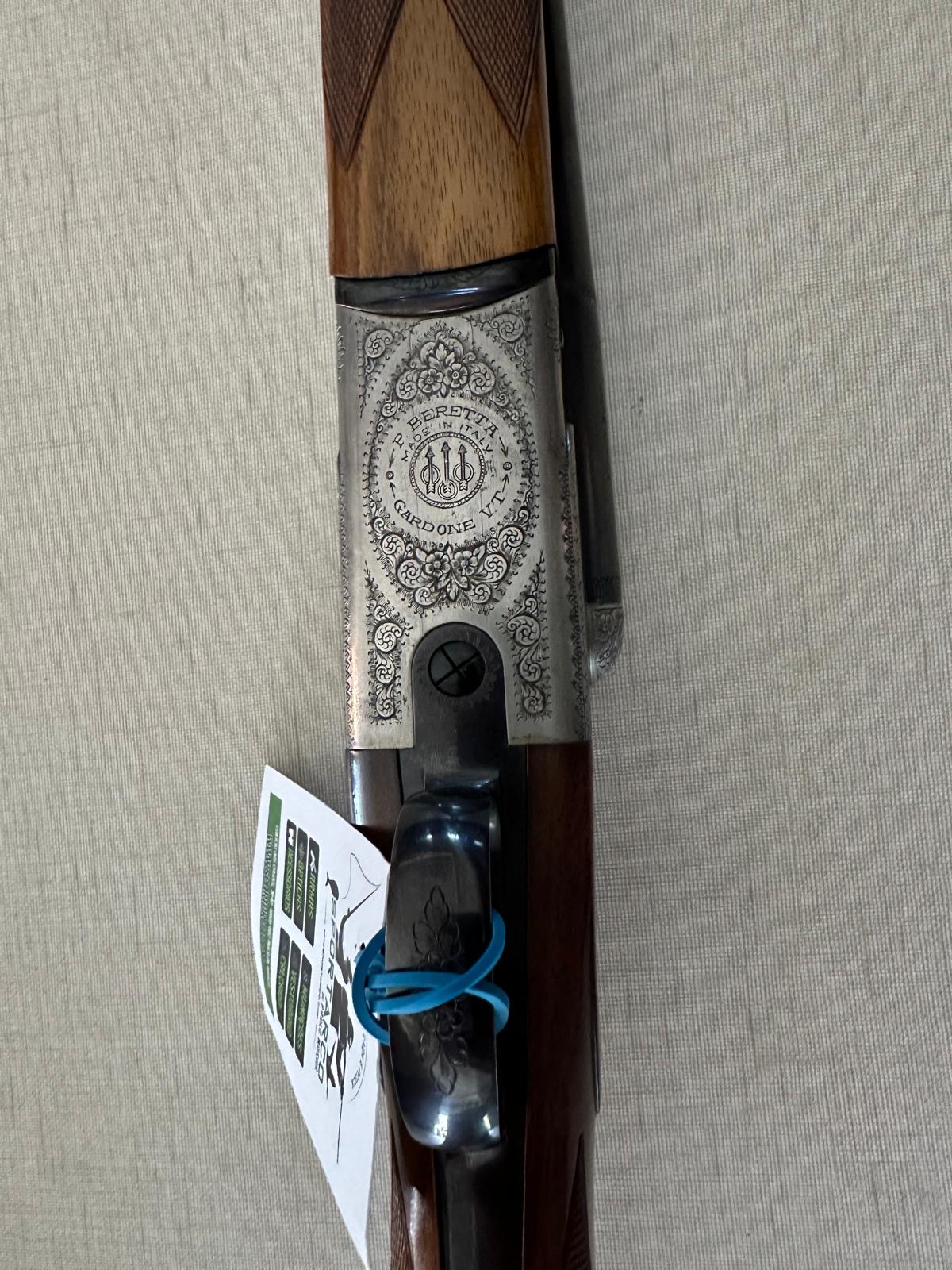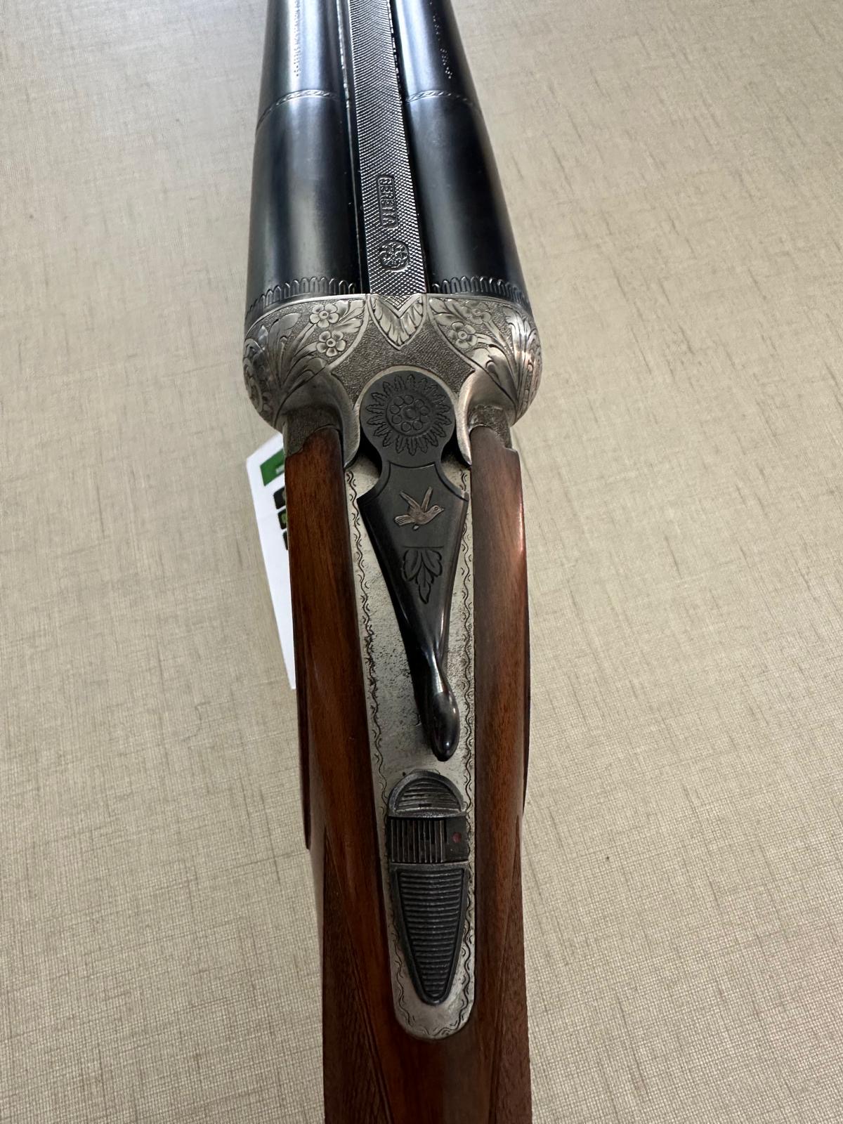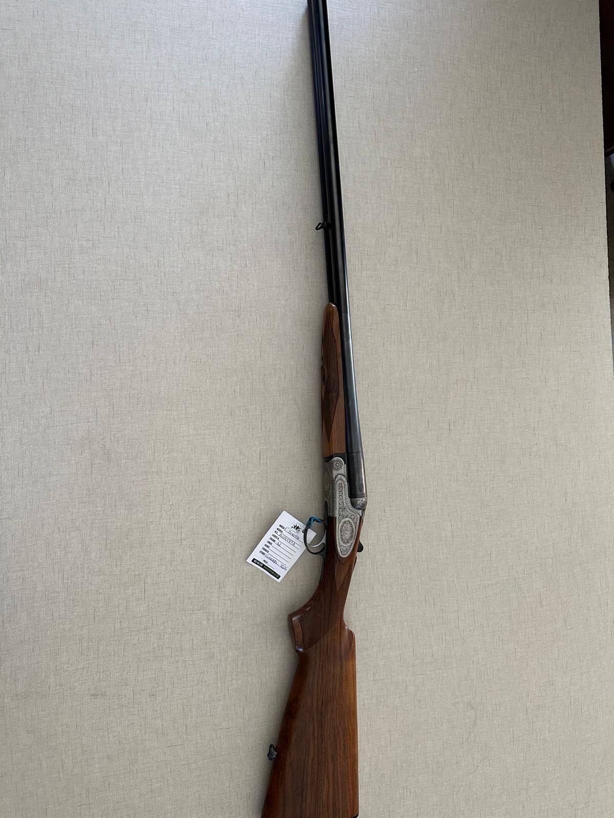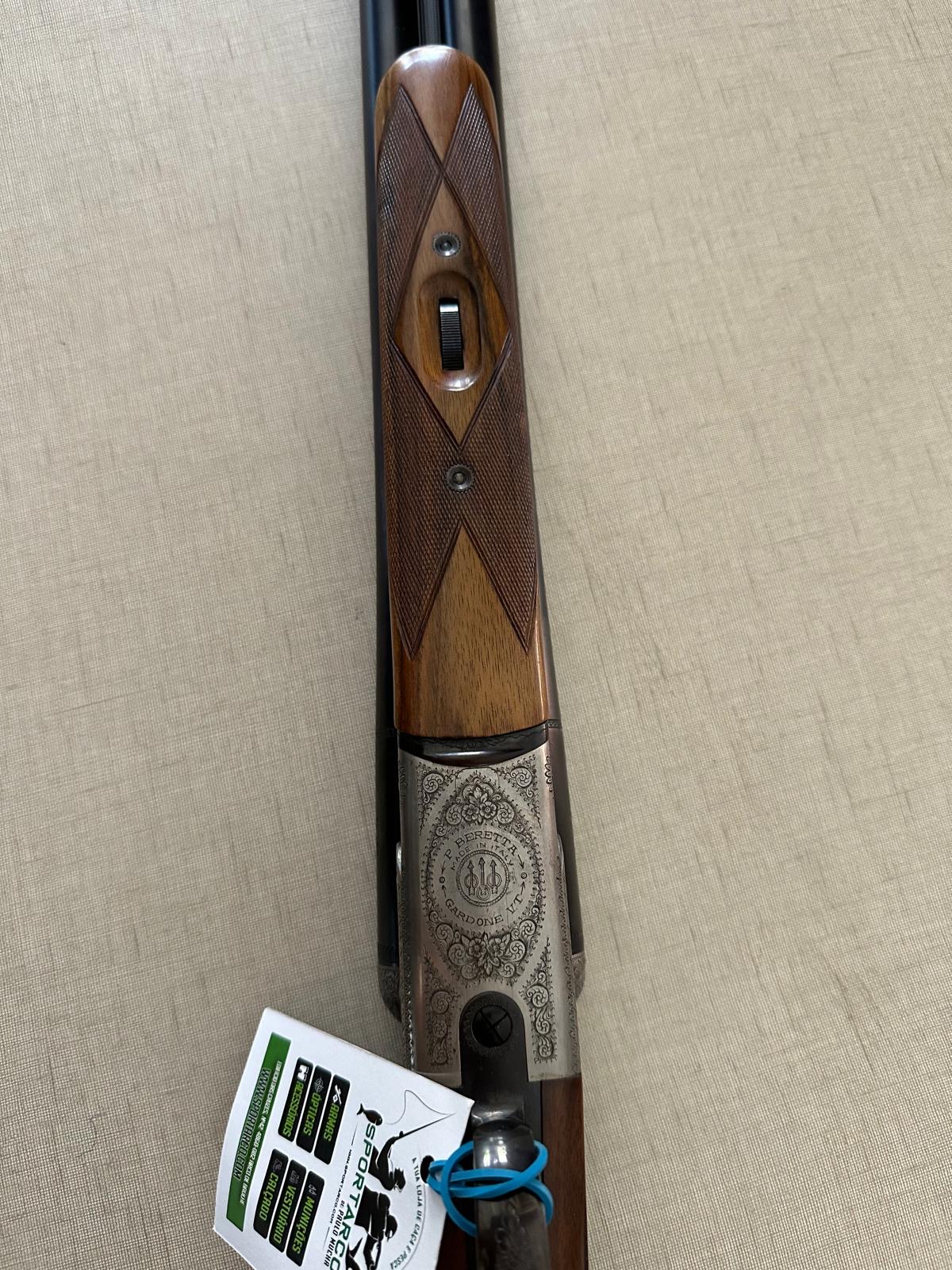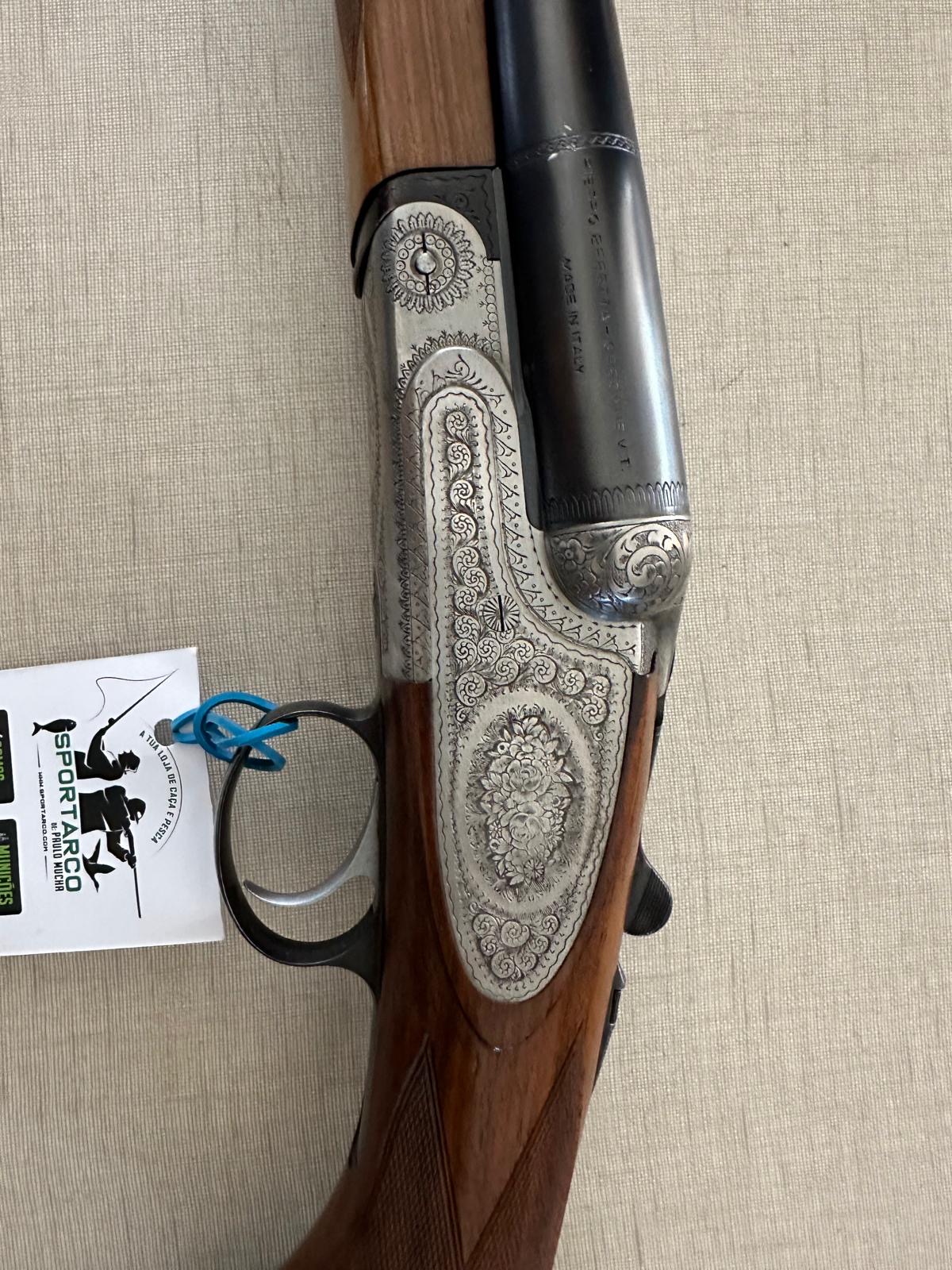 Espingarda de cano duplo com coronha de madeira e metal gravado, etiqueta Sportarno