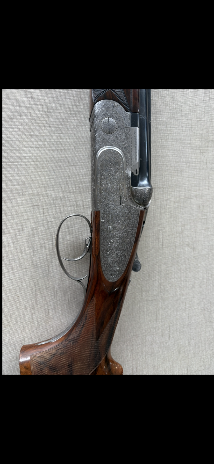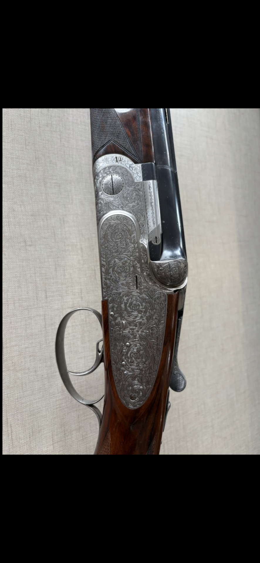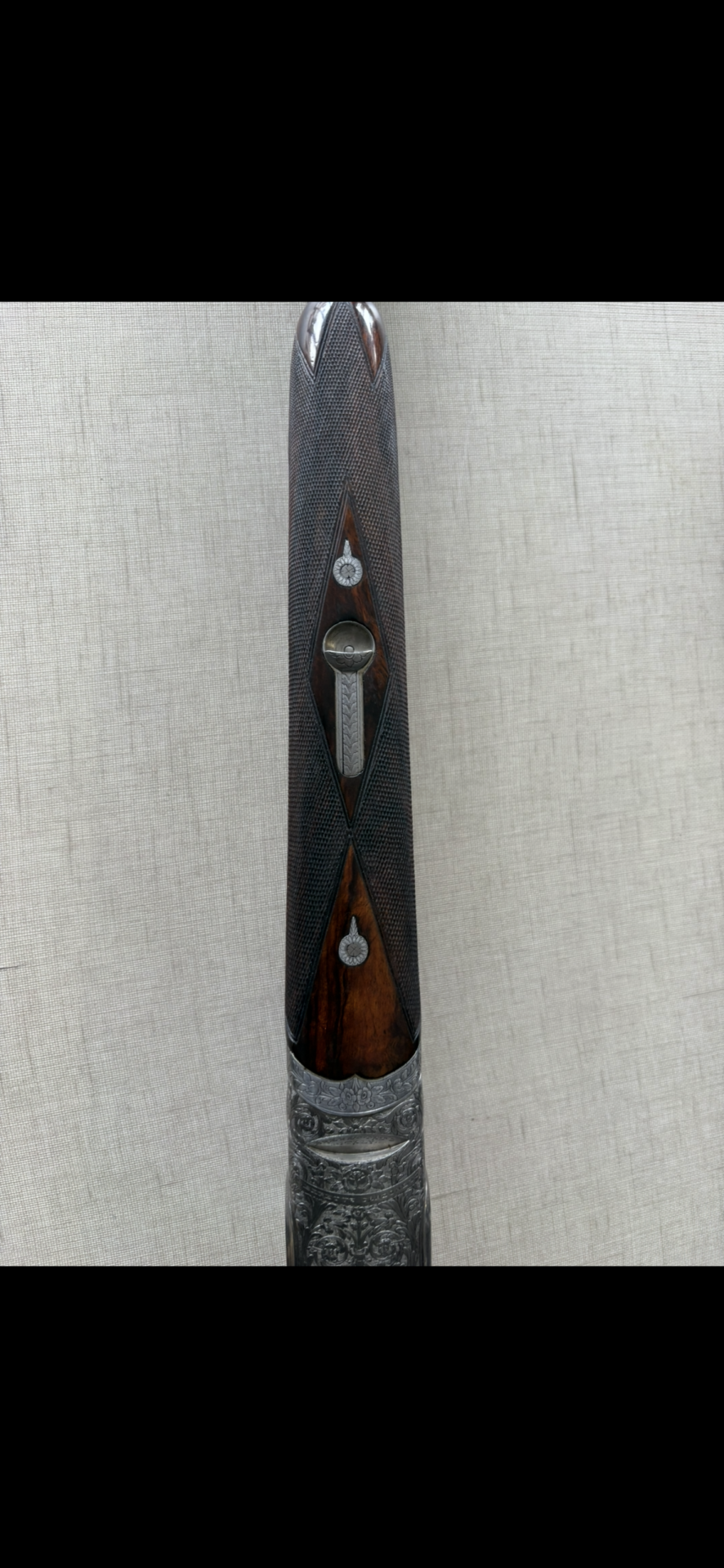 Espingarda com caixa gravada em metal prateado e madeira escura ao fundo bege