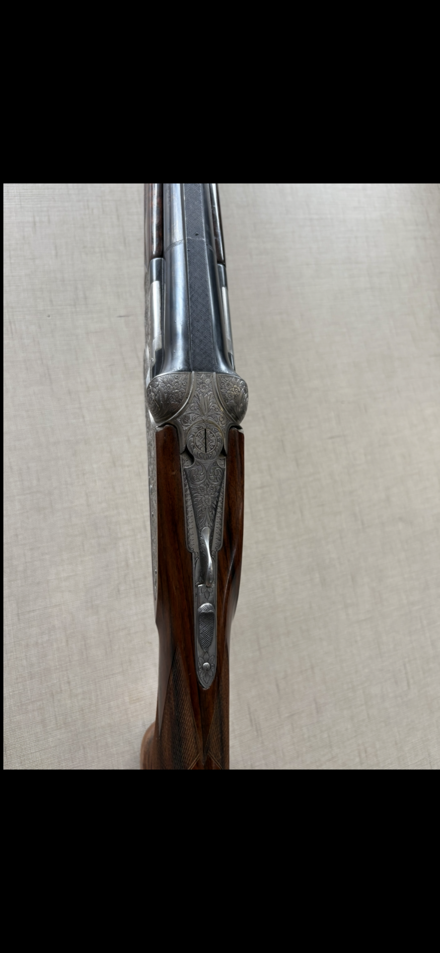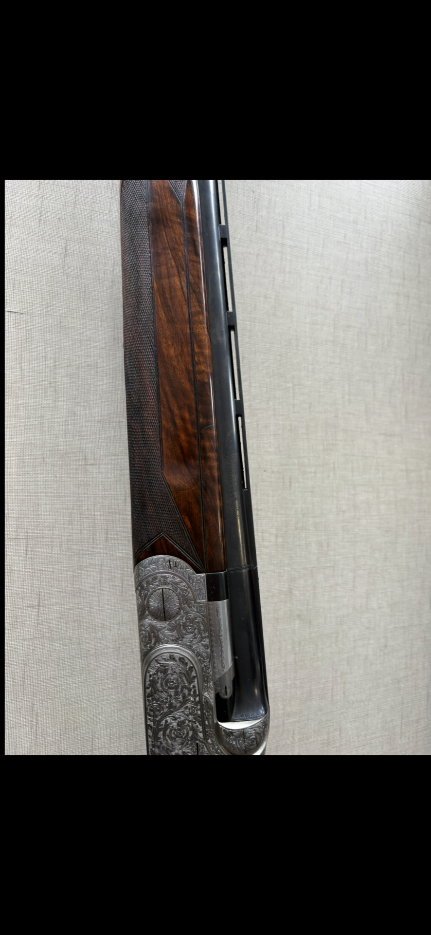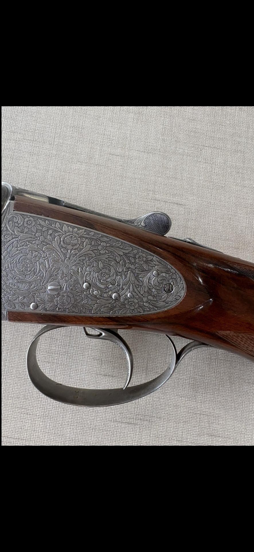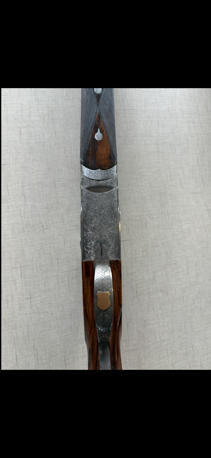 Espingarda com caixa gravada em metal prateado e madeira escura ao fundo bege