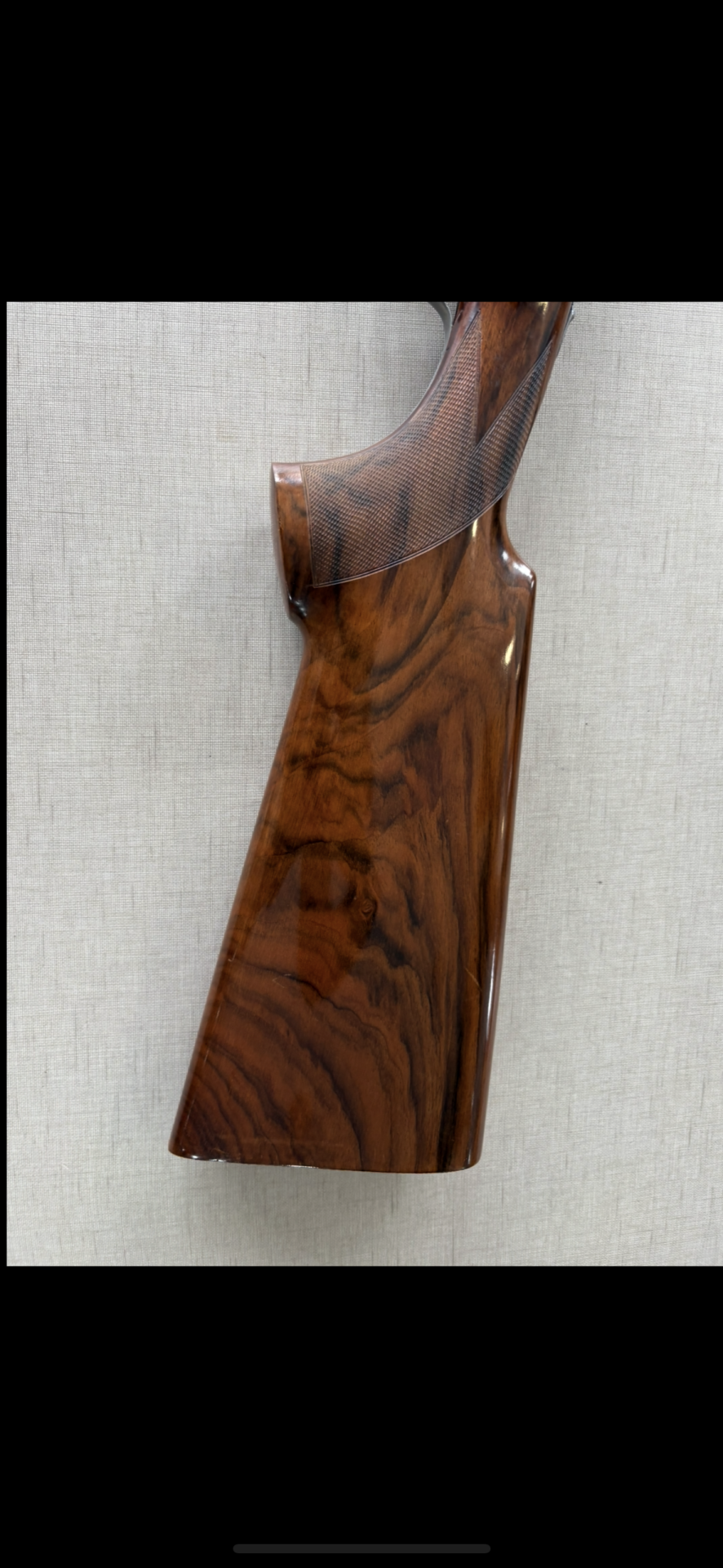 Coronha de espingarda em madeira polida com textura no punho.