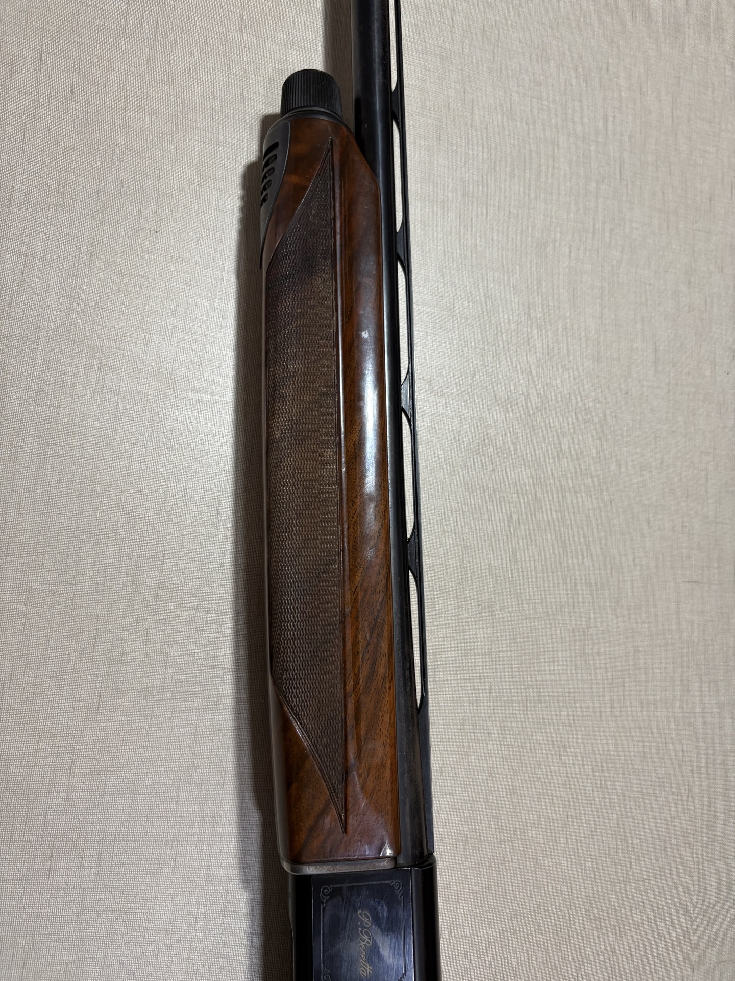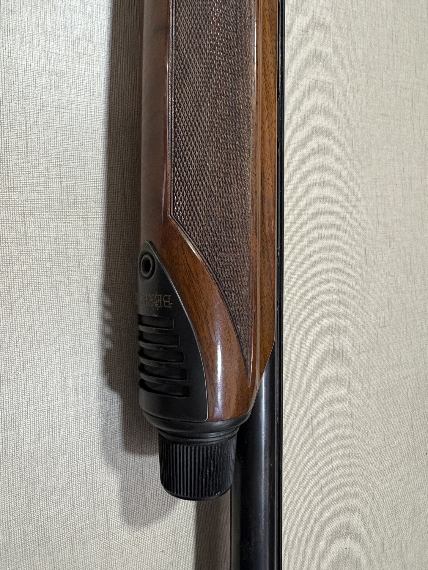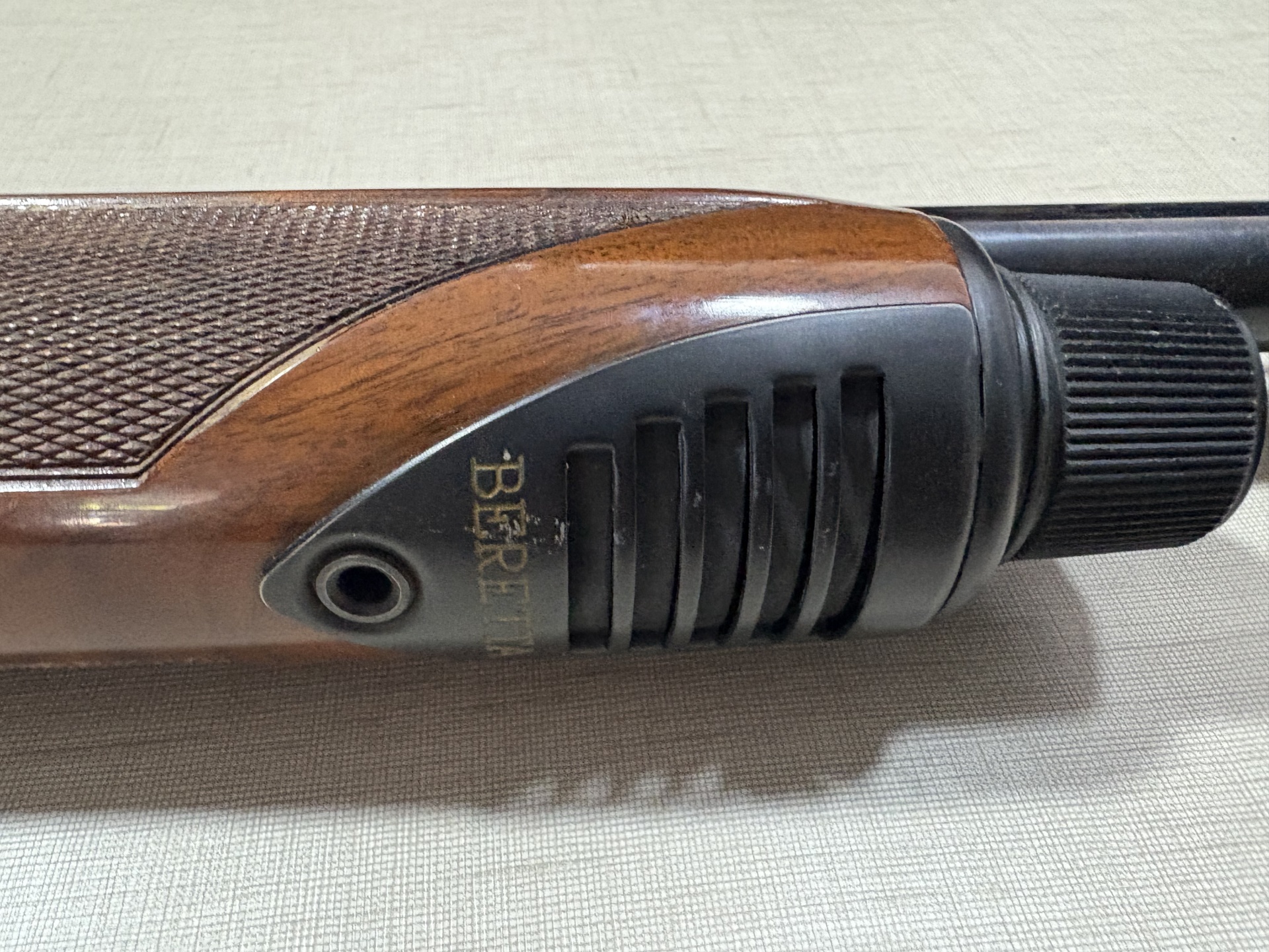 Parte de empunhadura de espingarda de madeira com detalhe preto e texto BERETTA