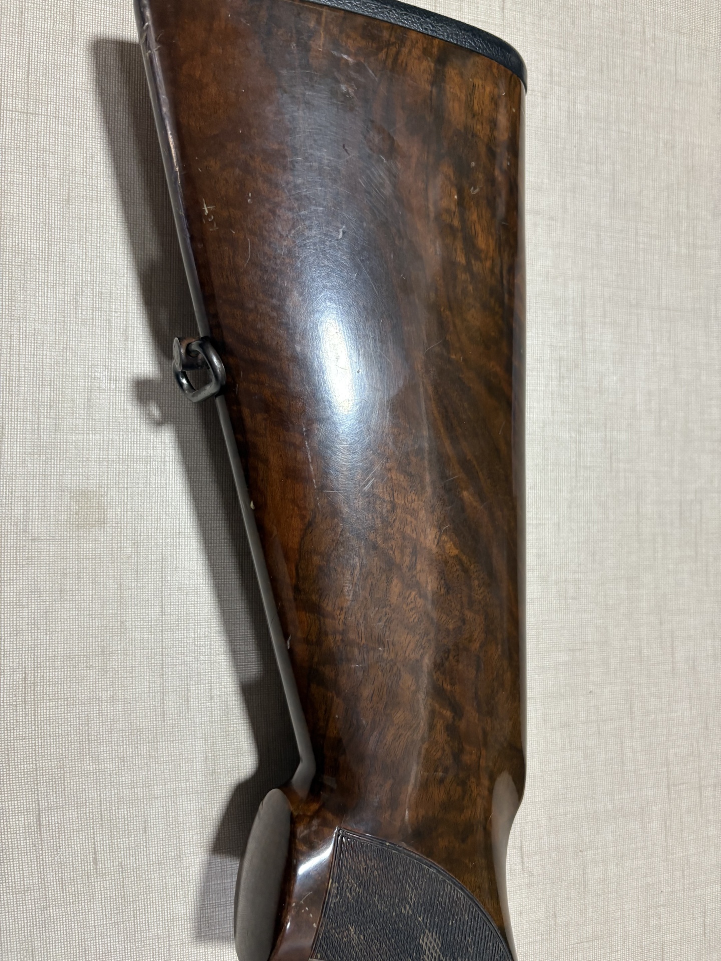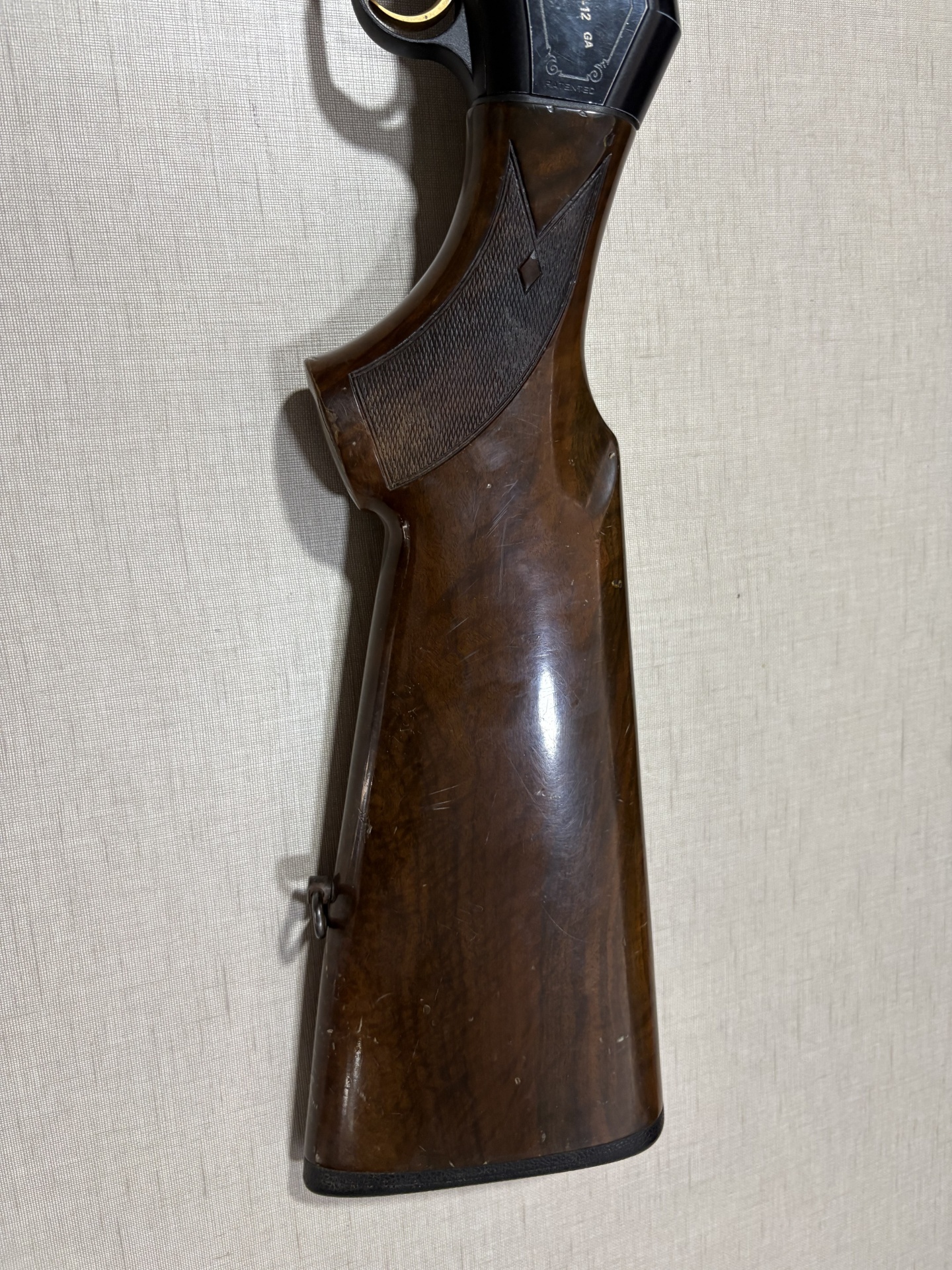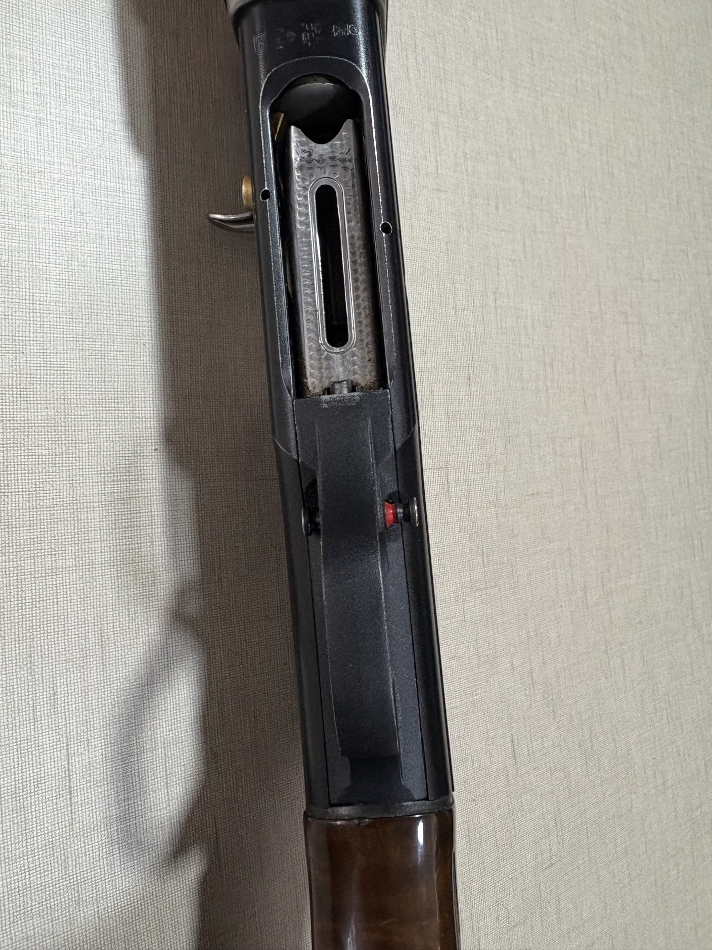 Parte de empunhadura de espingarda de madeira com detalhe preto e texto BERETTA