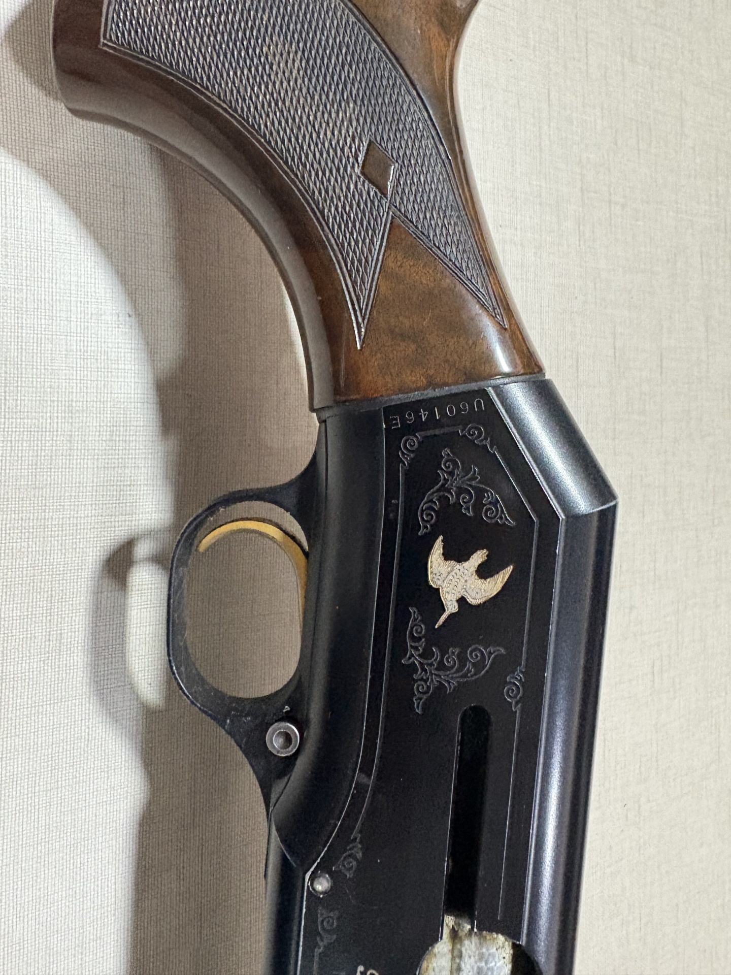 Parte de arma de fogo com cabo madeira castanha e corpo metálico preto com gravura dourada