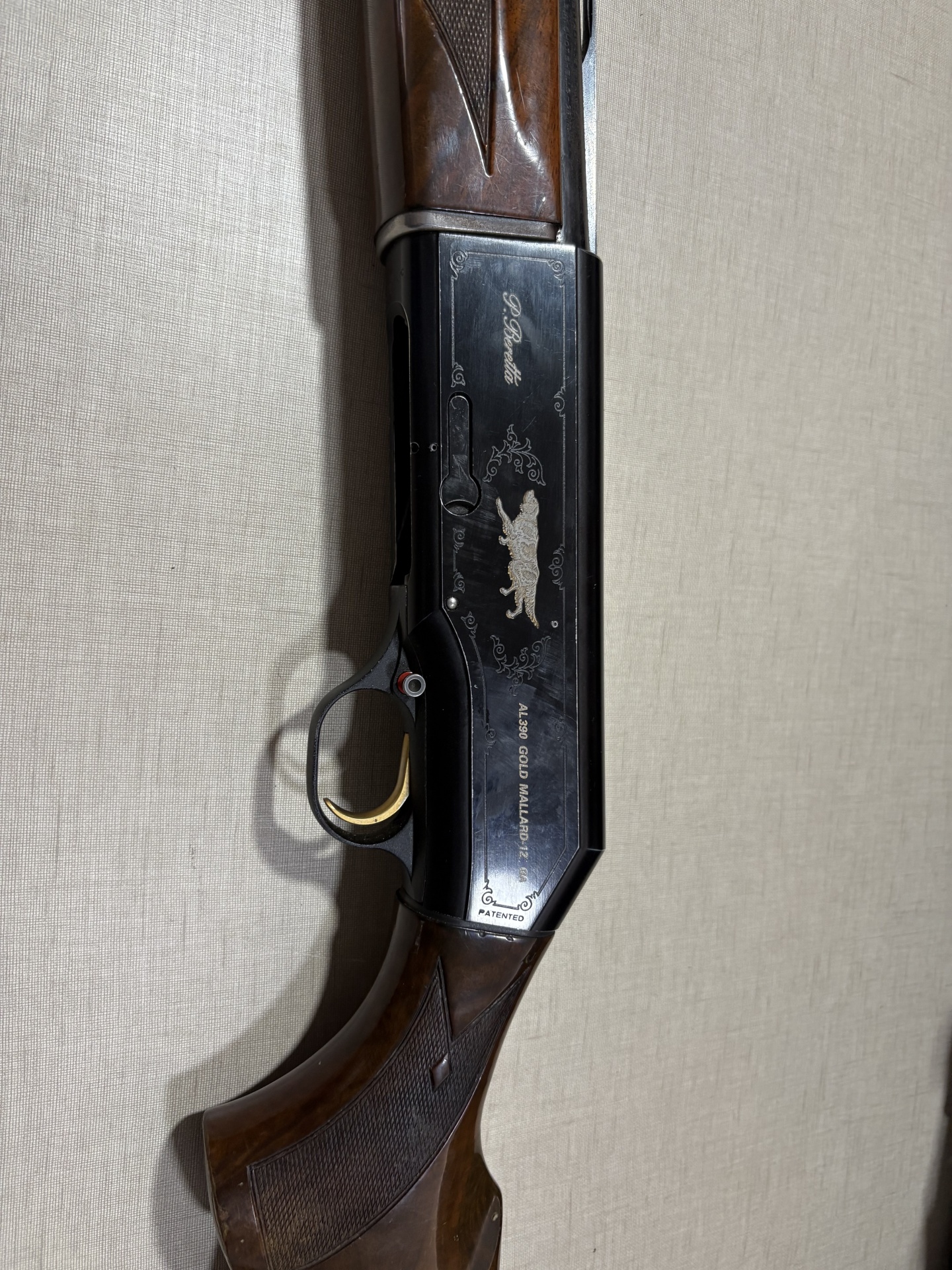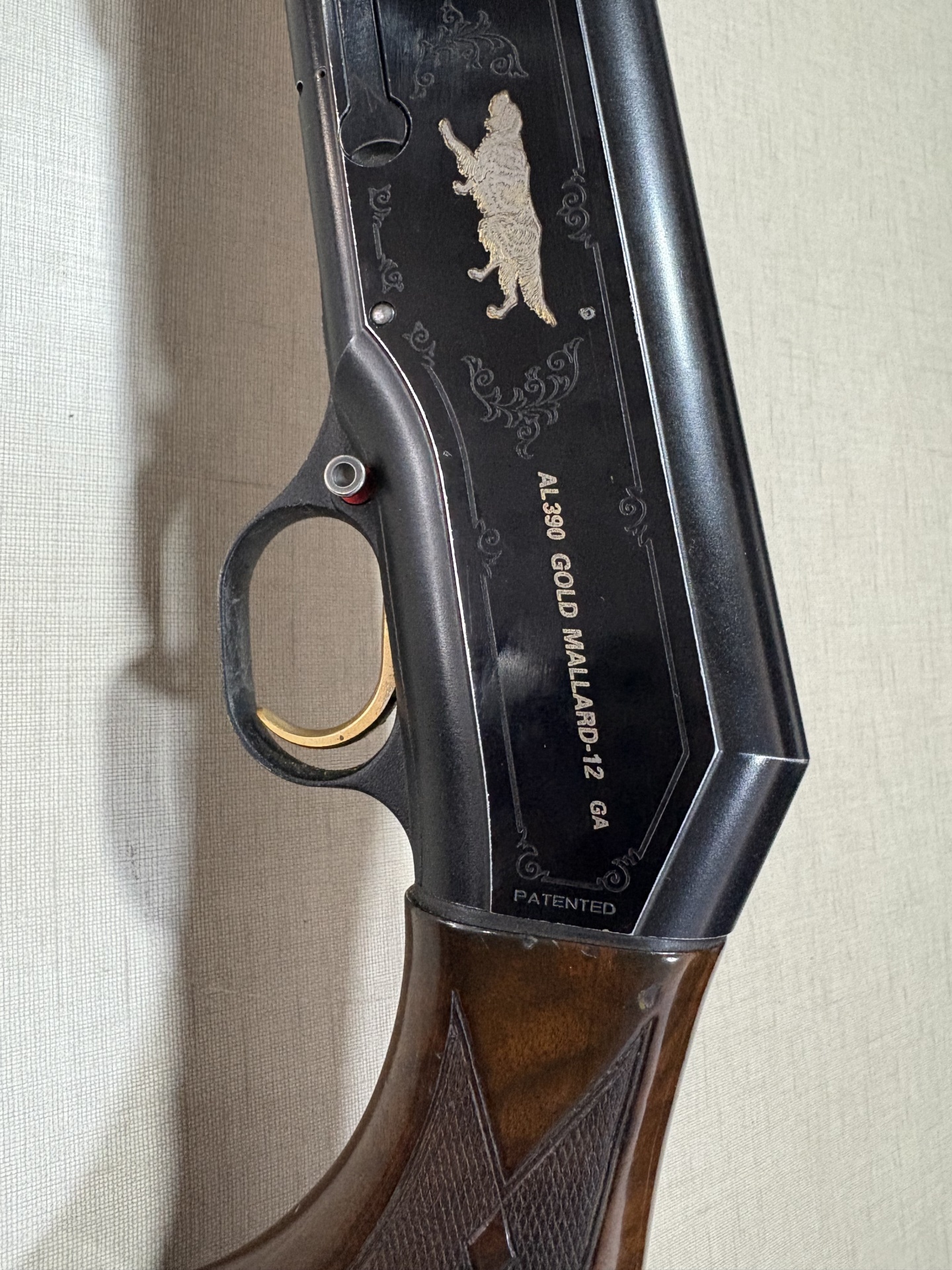 Espingarda preta com gravação de cão dourado e detalhes em madeira
