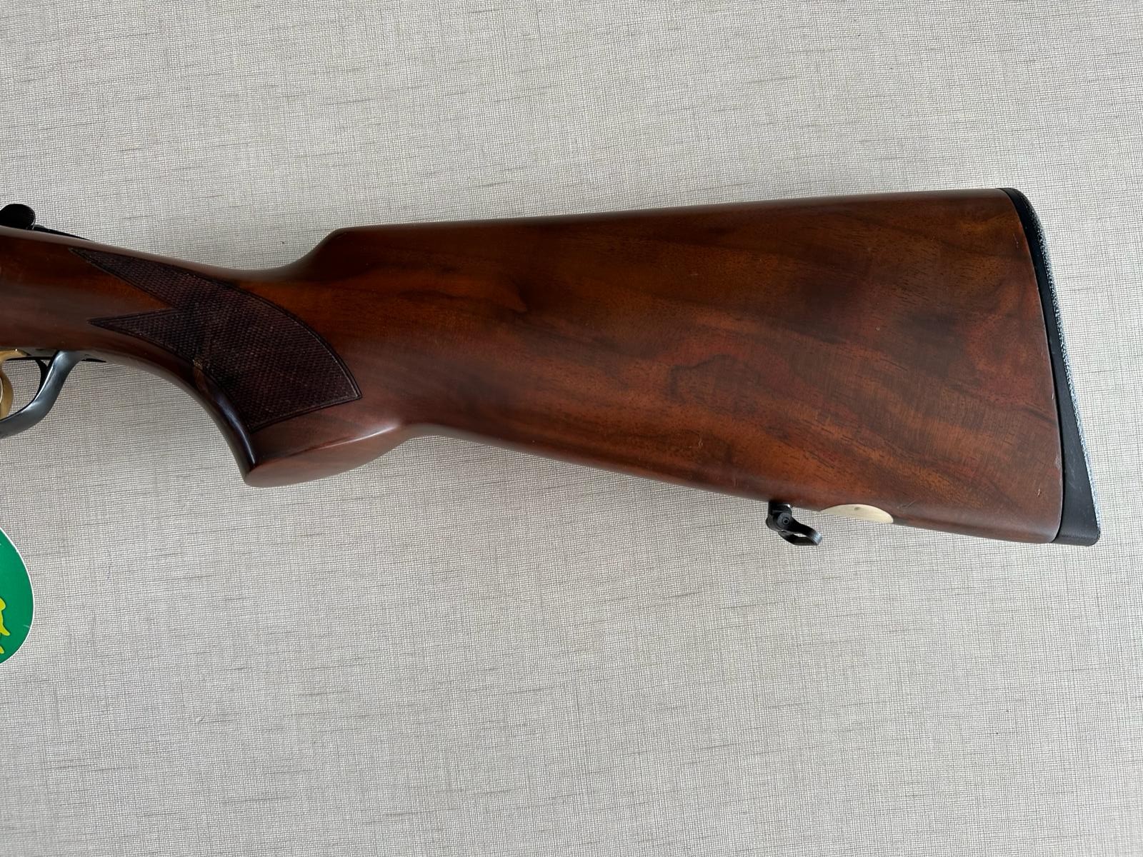 Espingarda de madeira e metal com gravações douradas e etiqueta verde de identificação.