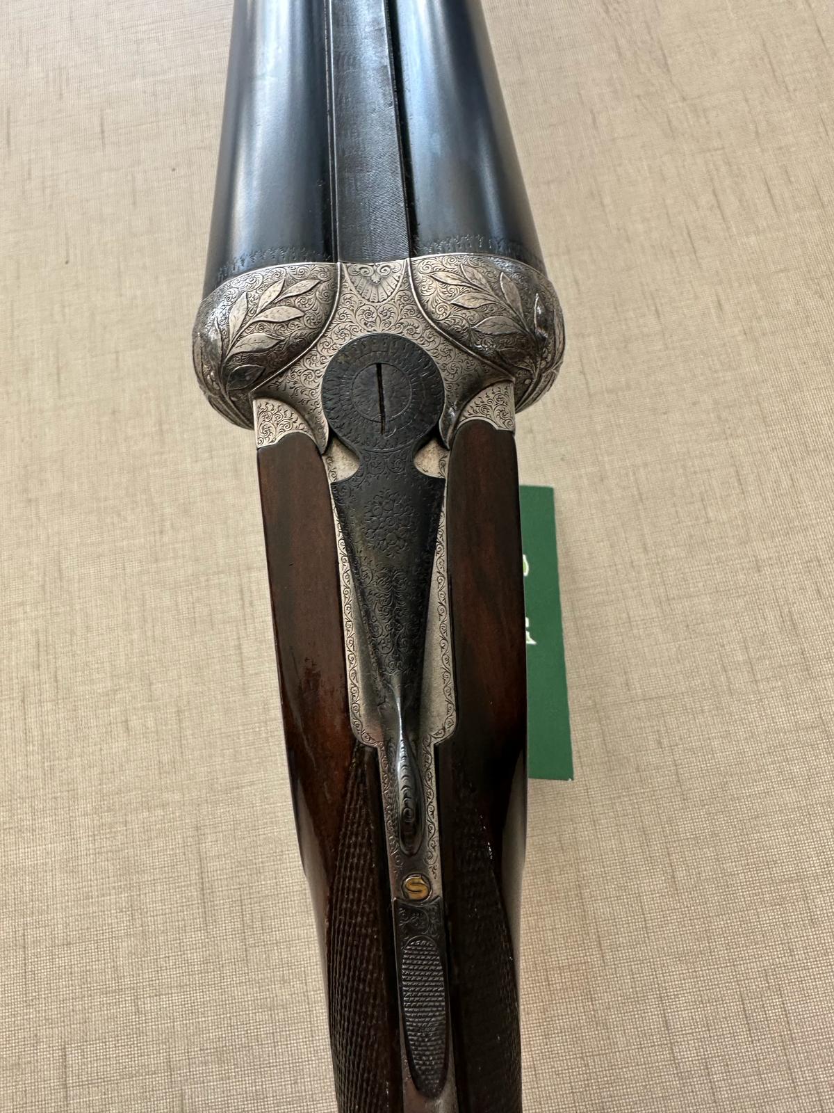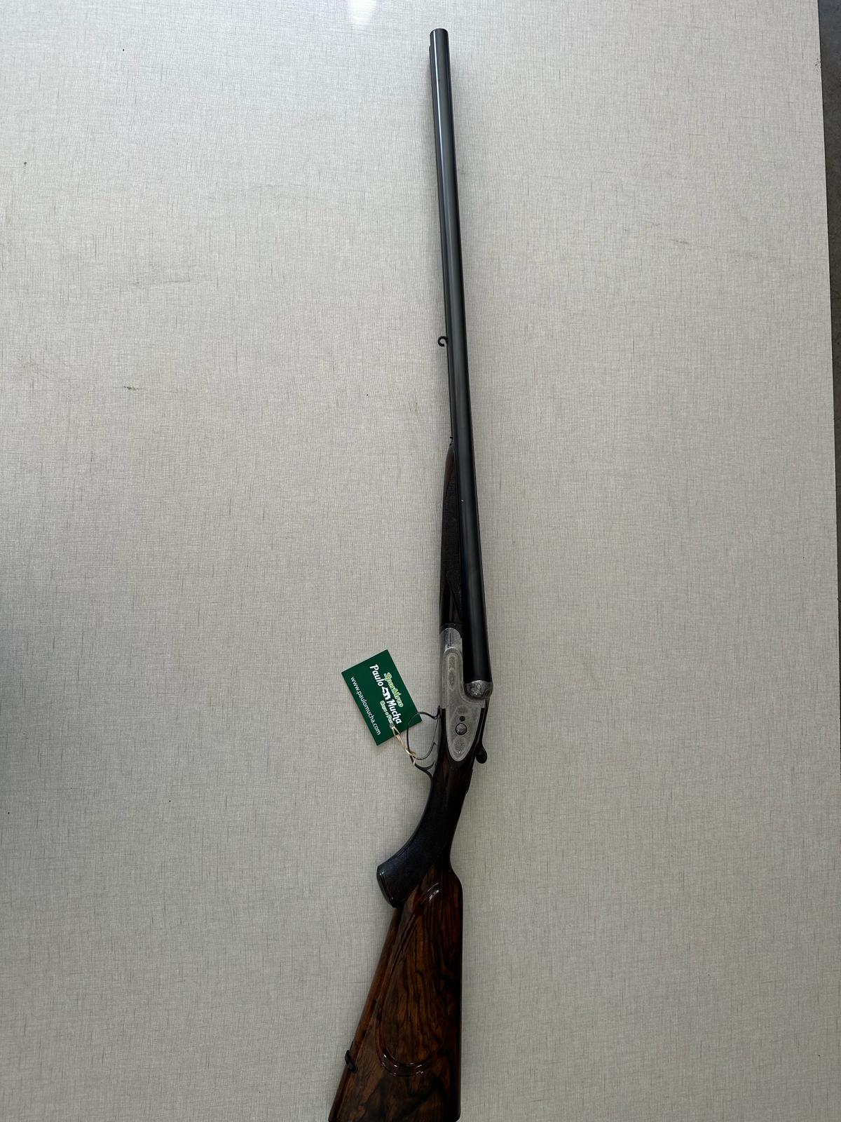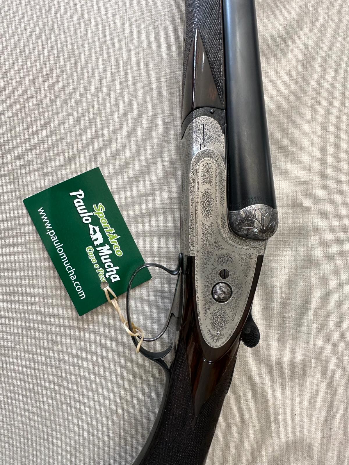 Espingarda de caça sobreposta com madeira e metal prateado gravado e etiqueta verde da marca