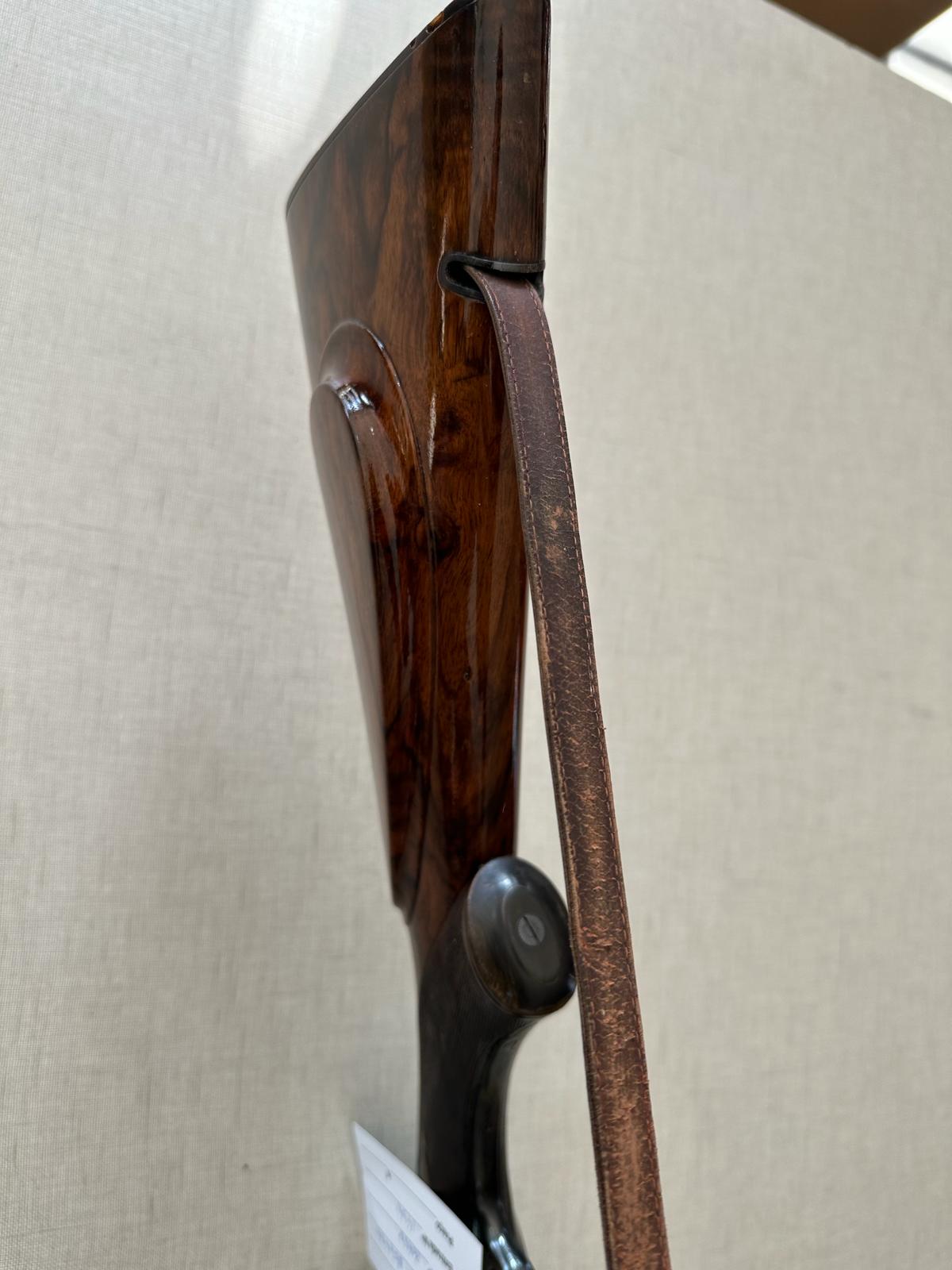Espingarda com madeira castanha polida e couro texturado
