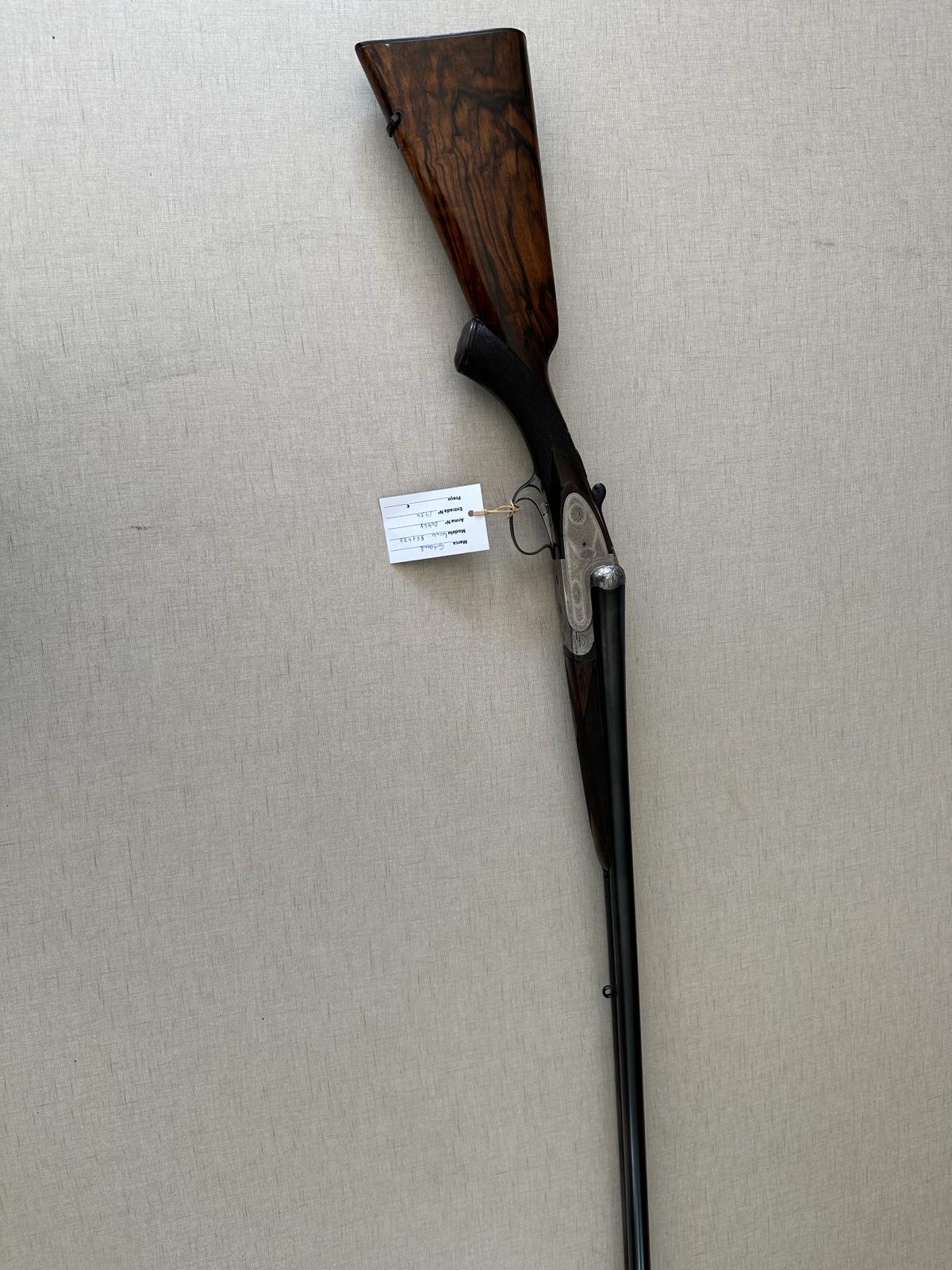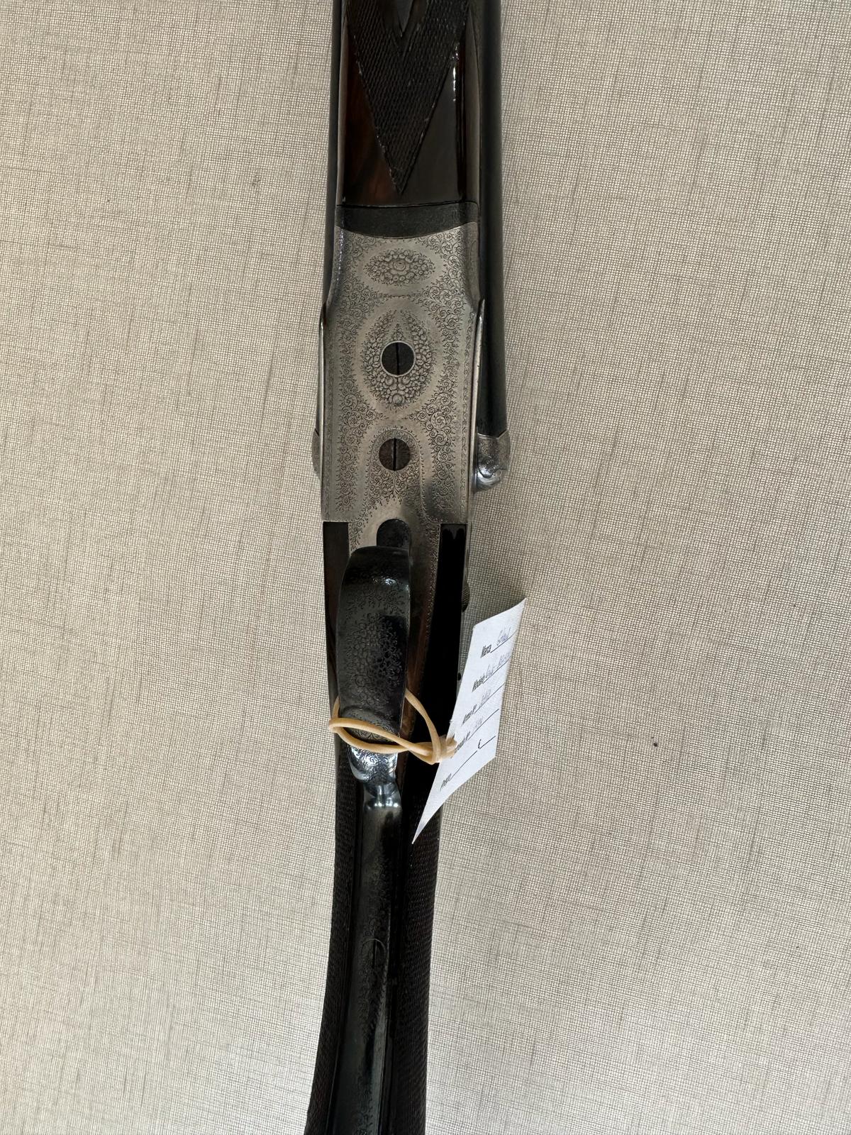 Espingarda de canos paralelos com coronha de madeira castanha e etiqueta verde