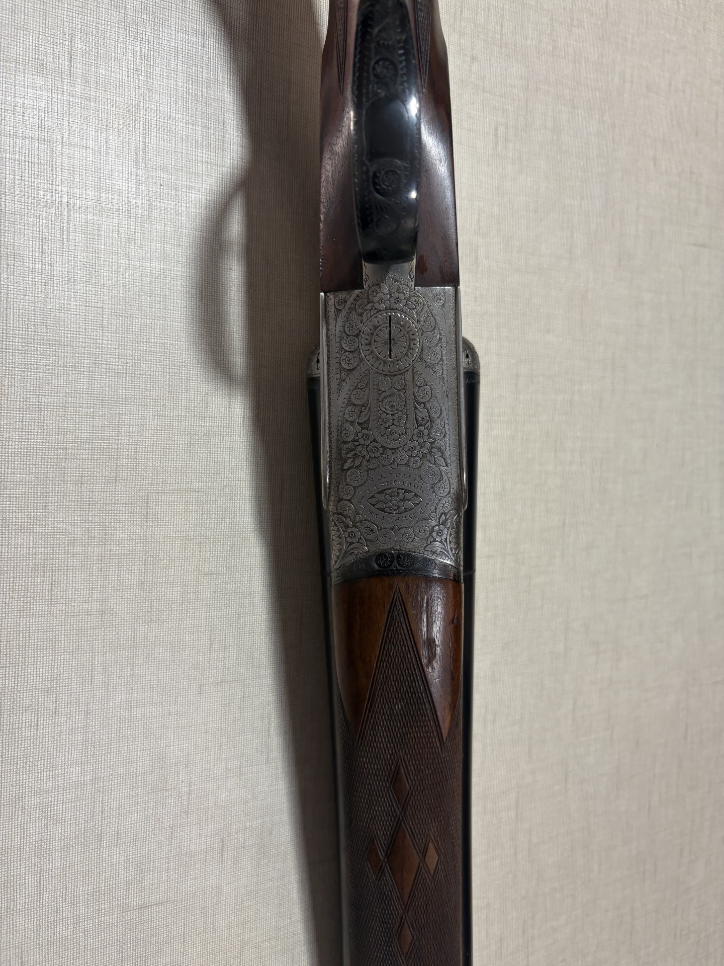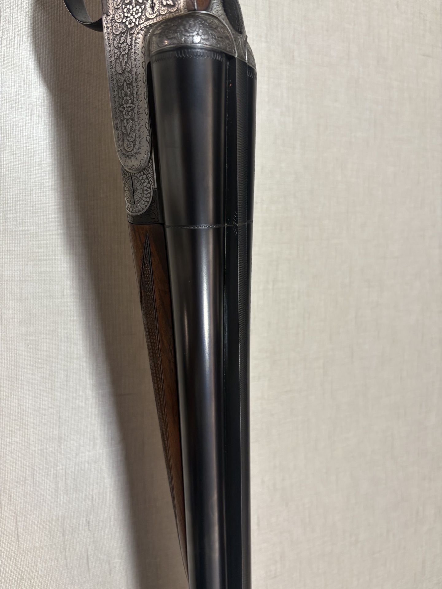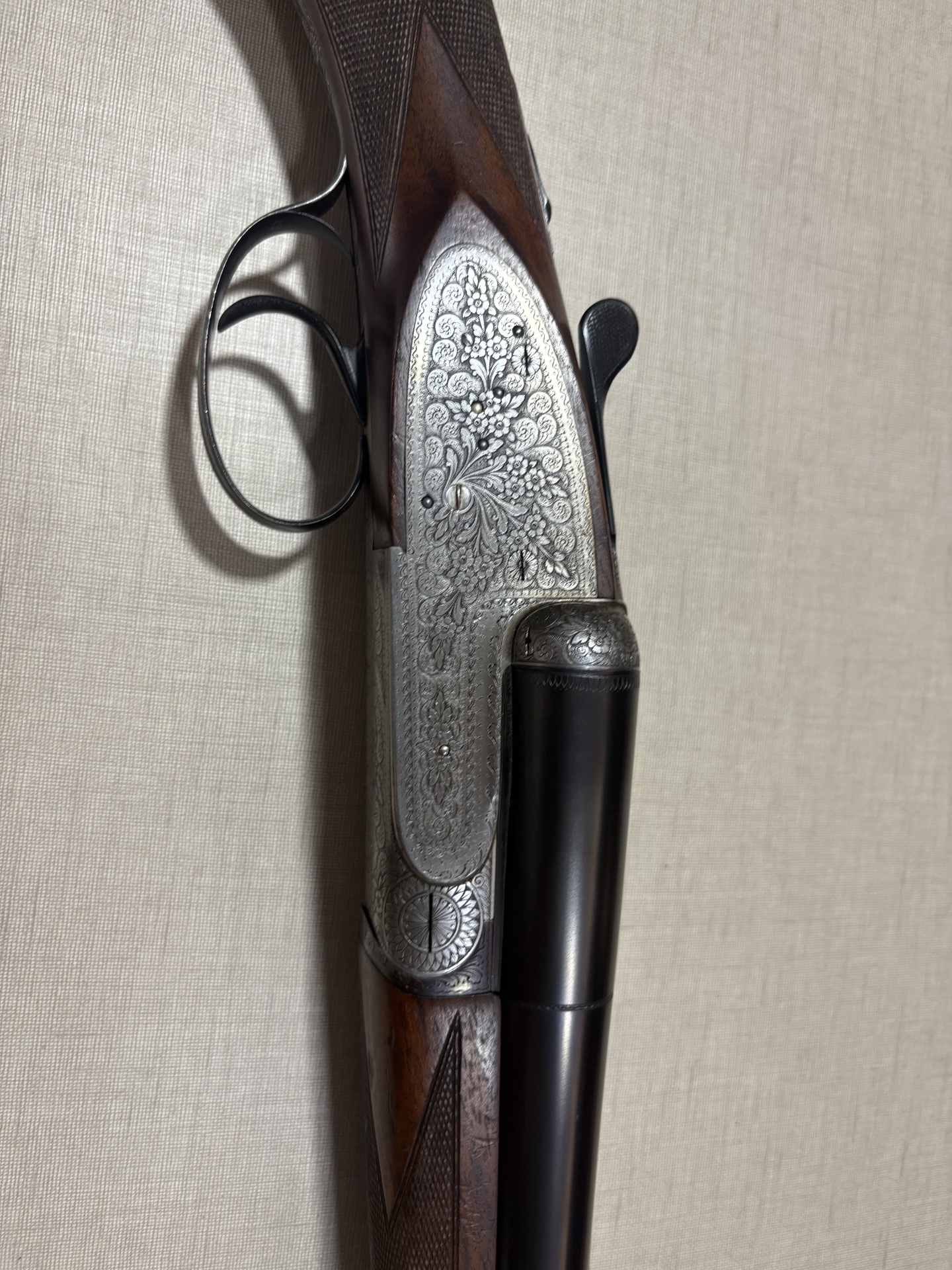 Espingarda dupla de caça com madeira escura e metais gravados em fundo bege.