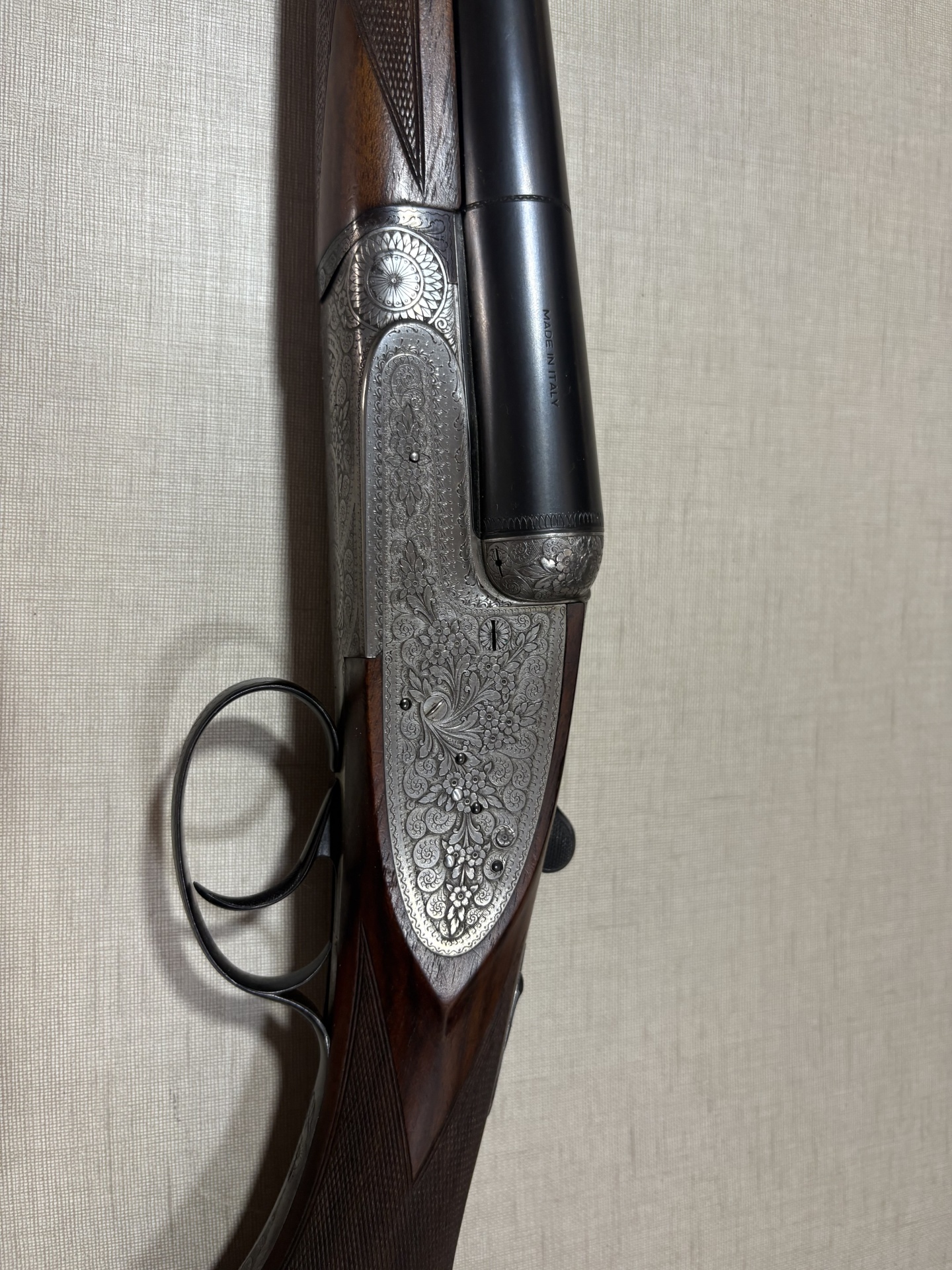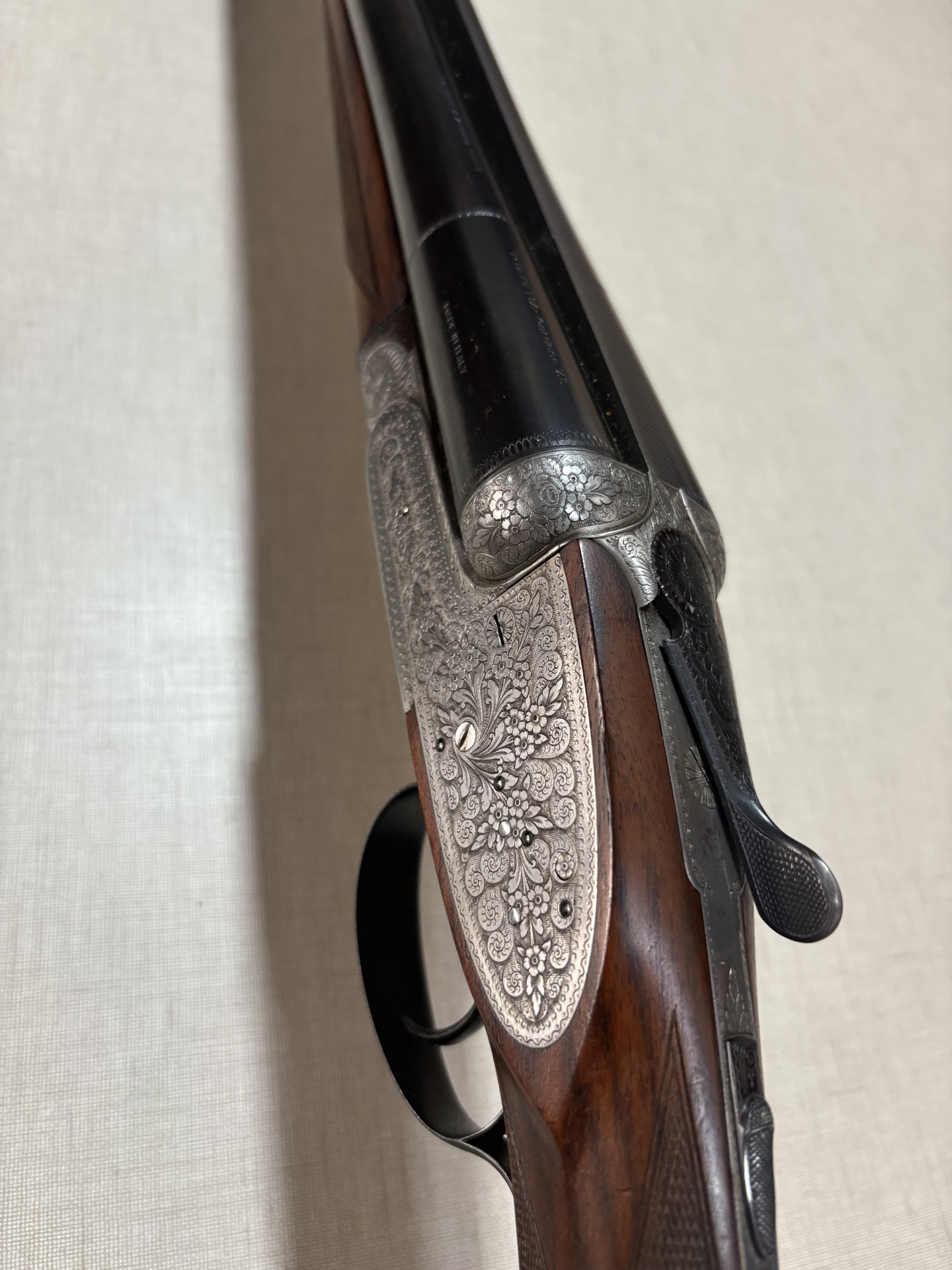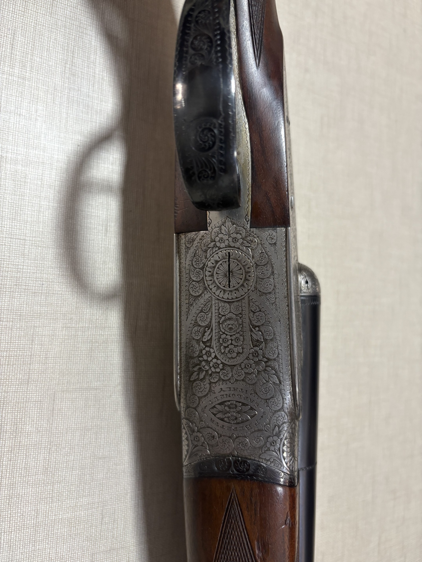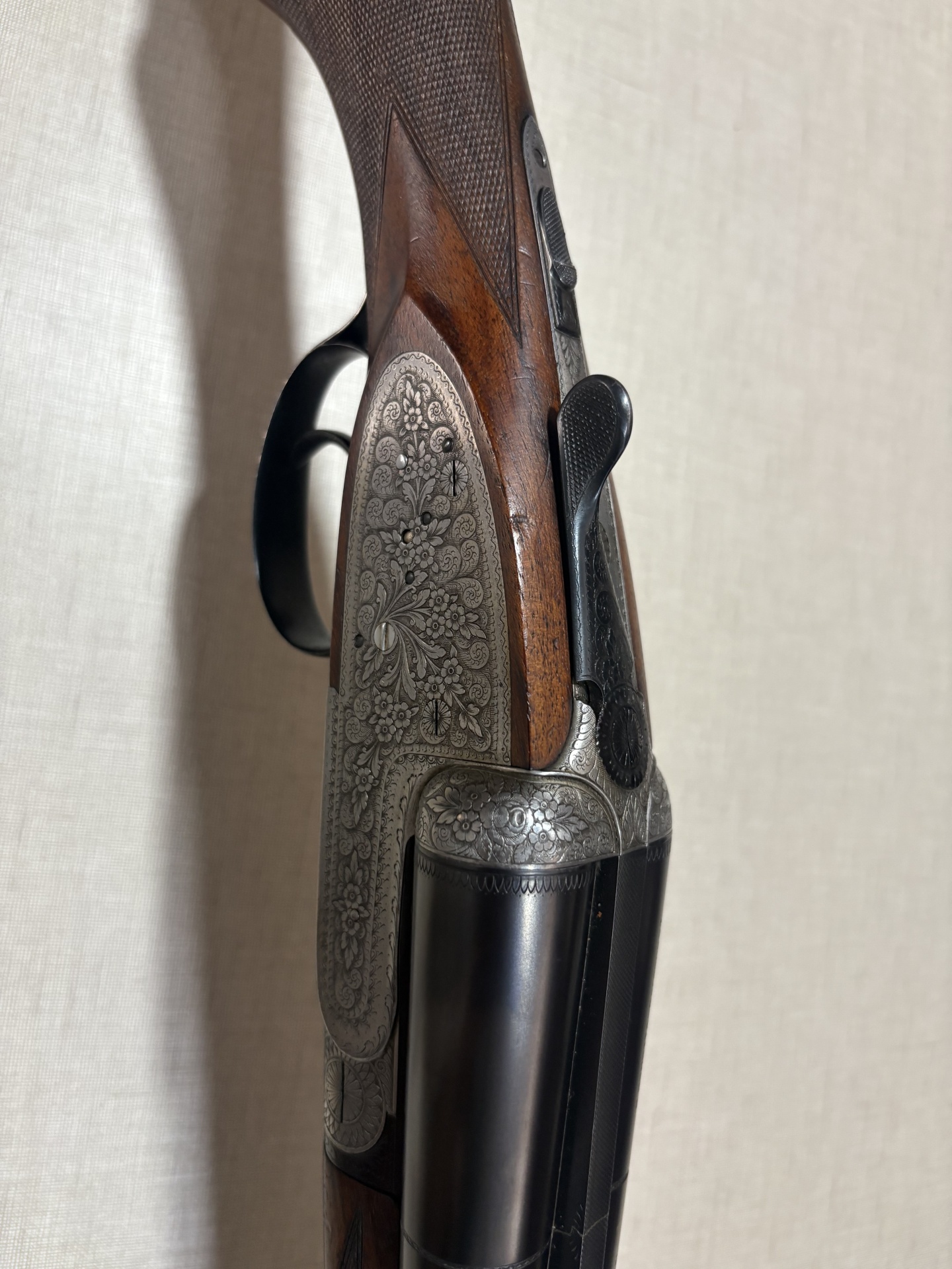 Espingarda dupla de caça com madeira escura e metais gravados em fundo bege.