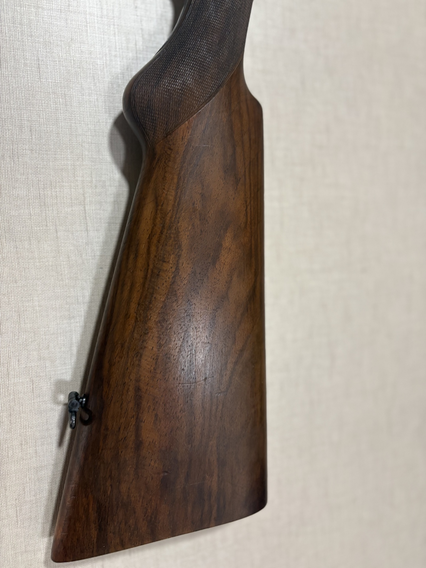 Coronha de espingarda em madeira castanho escuro com textura quadriculada no topo