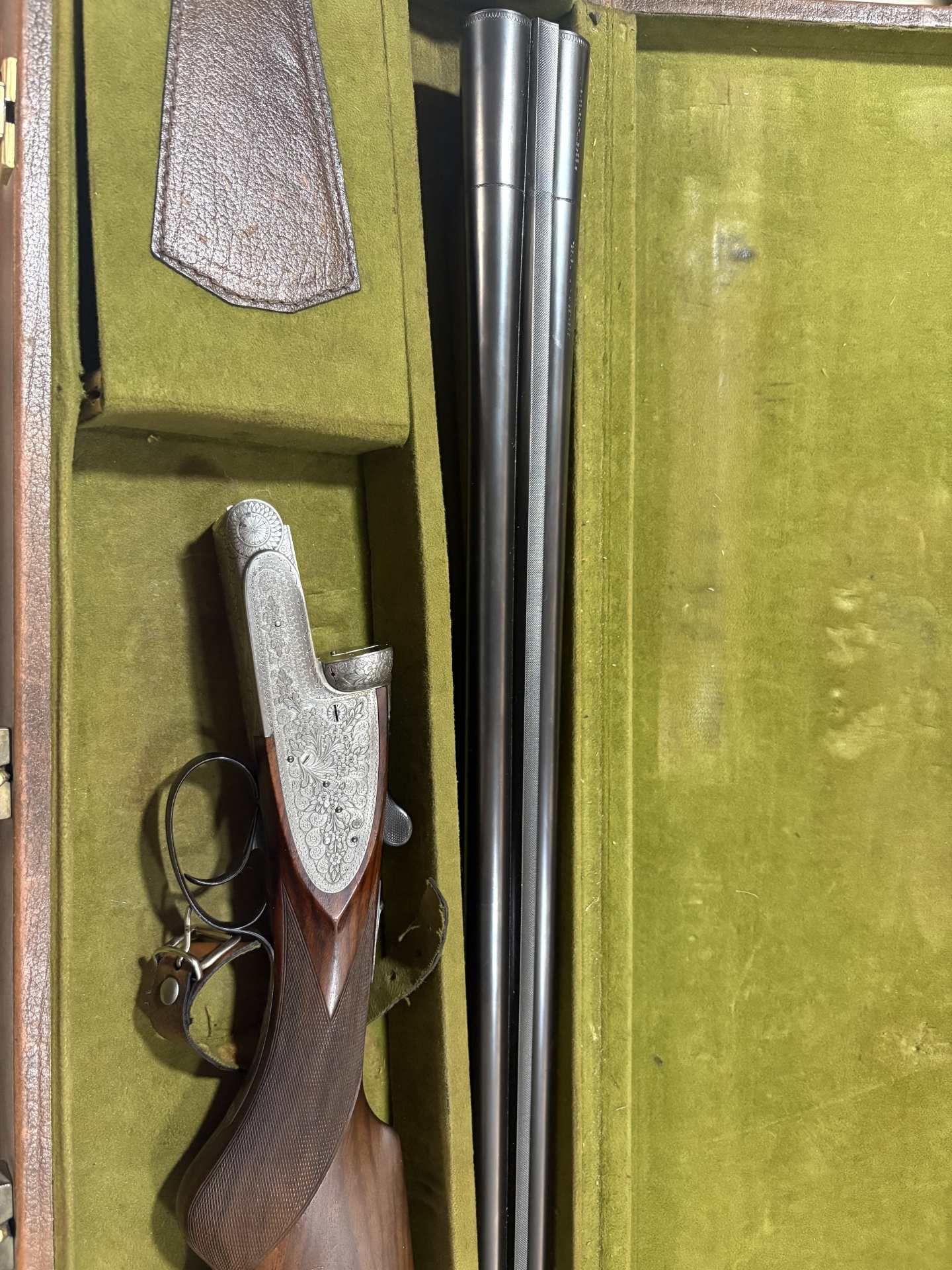 Espingarda de caça de canos duplos em estojo verde de veludo