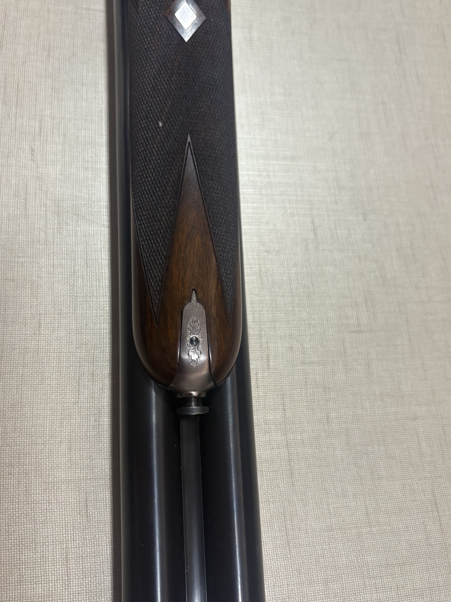 Detalhe inferior de coronha em madeira escura com metal prateado gravado em cano duplo negro