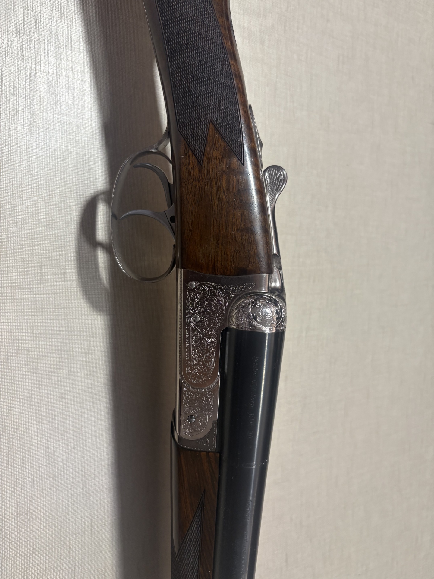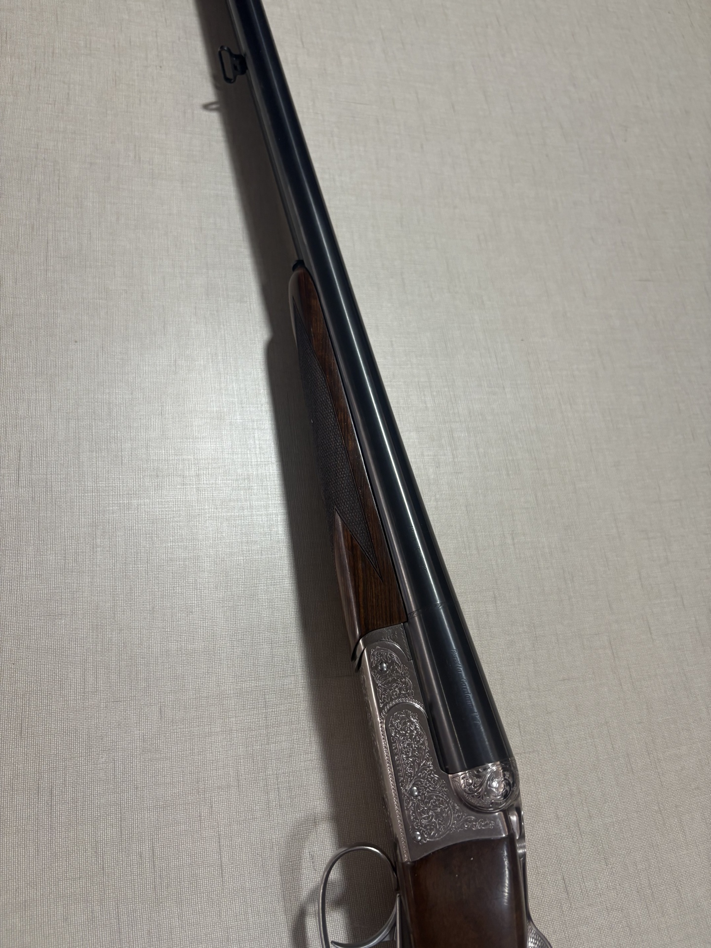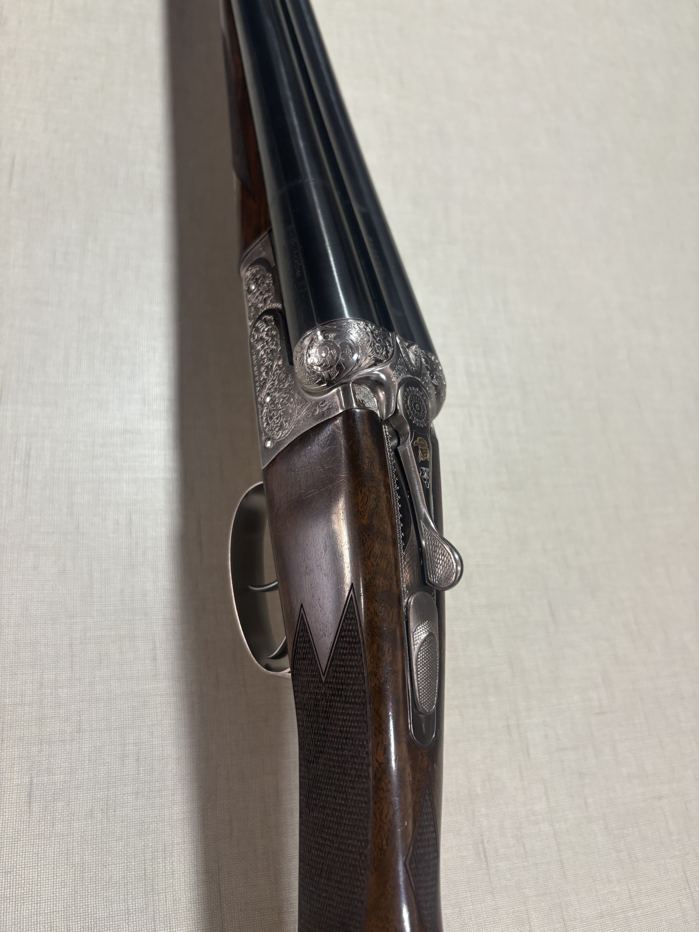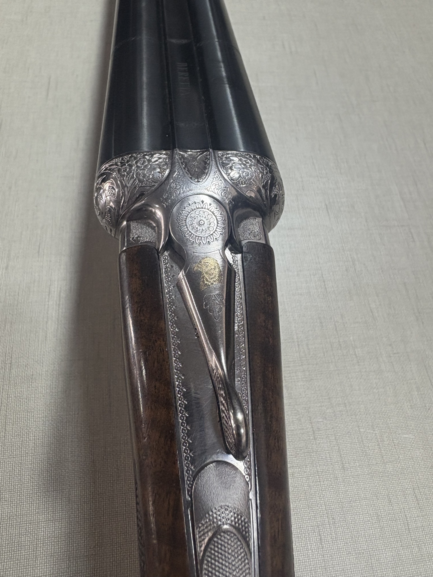 Espingarda de caça com madeira e aço gravado sobre fundo bege.