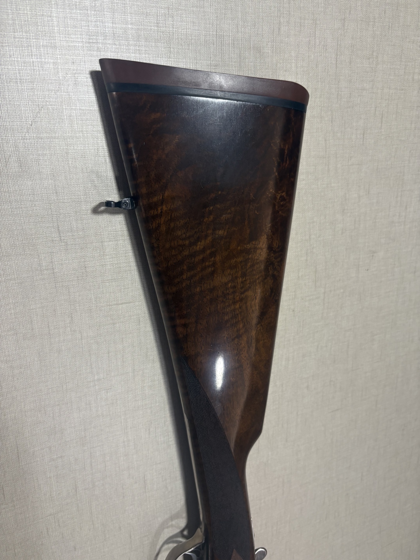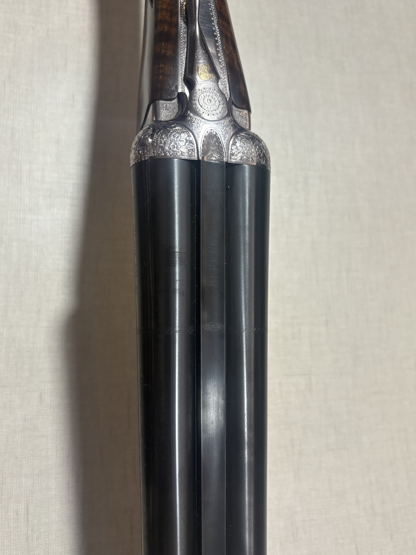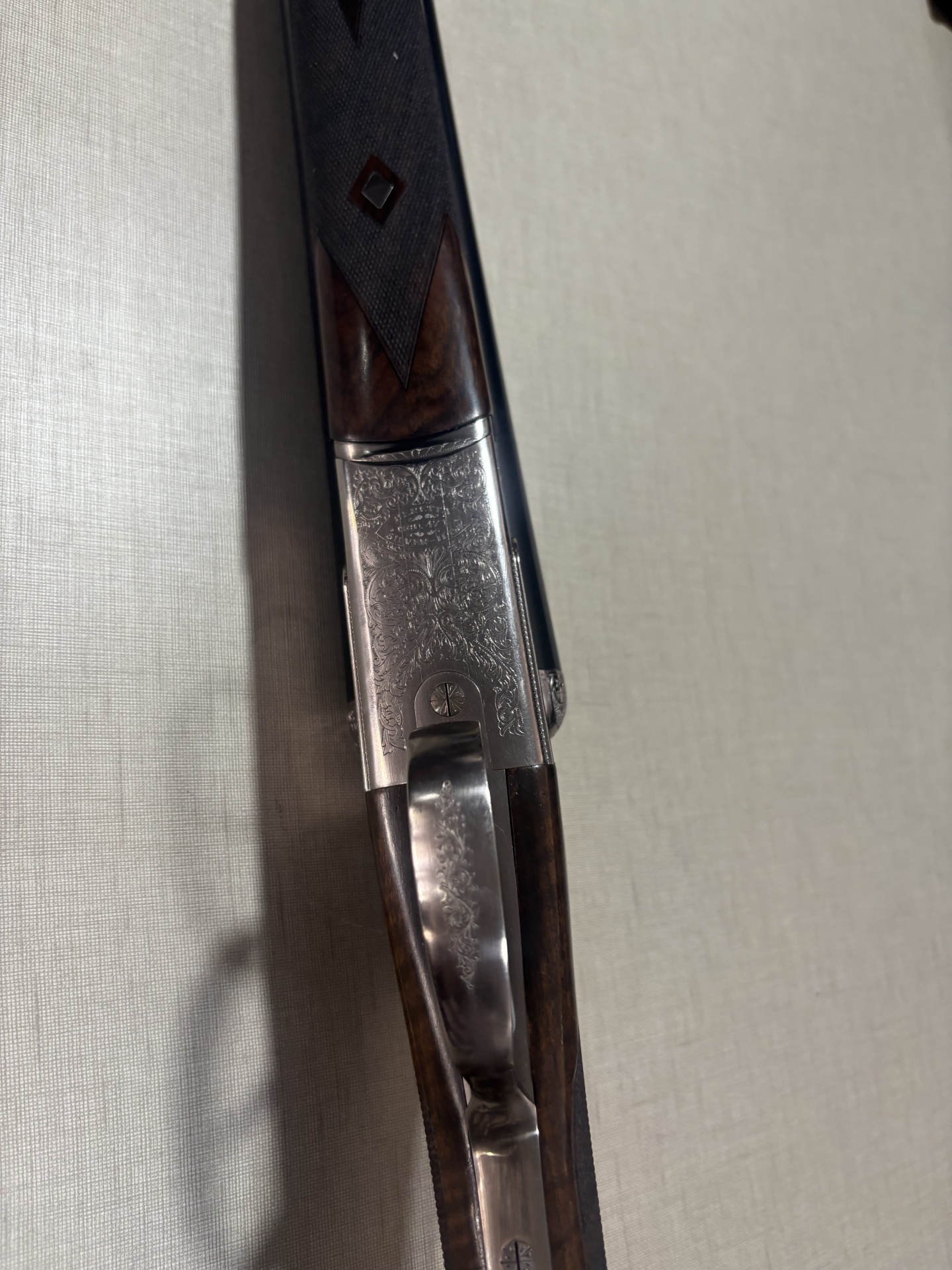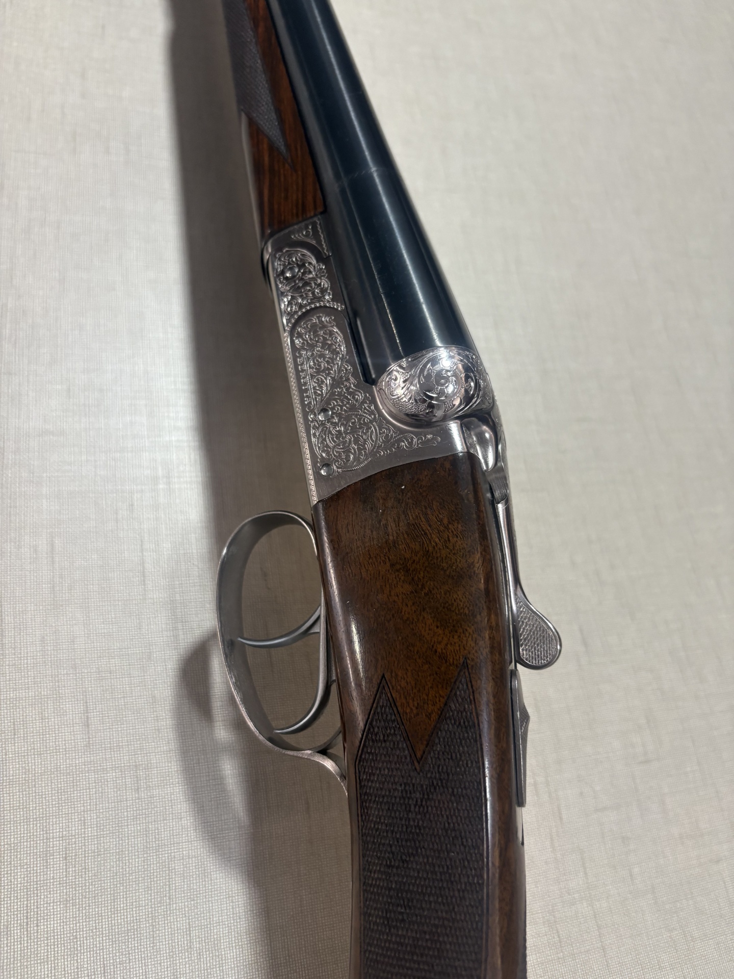 Espingarda de caça com madeira e aço gravado sobre fundo bege.