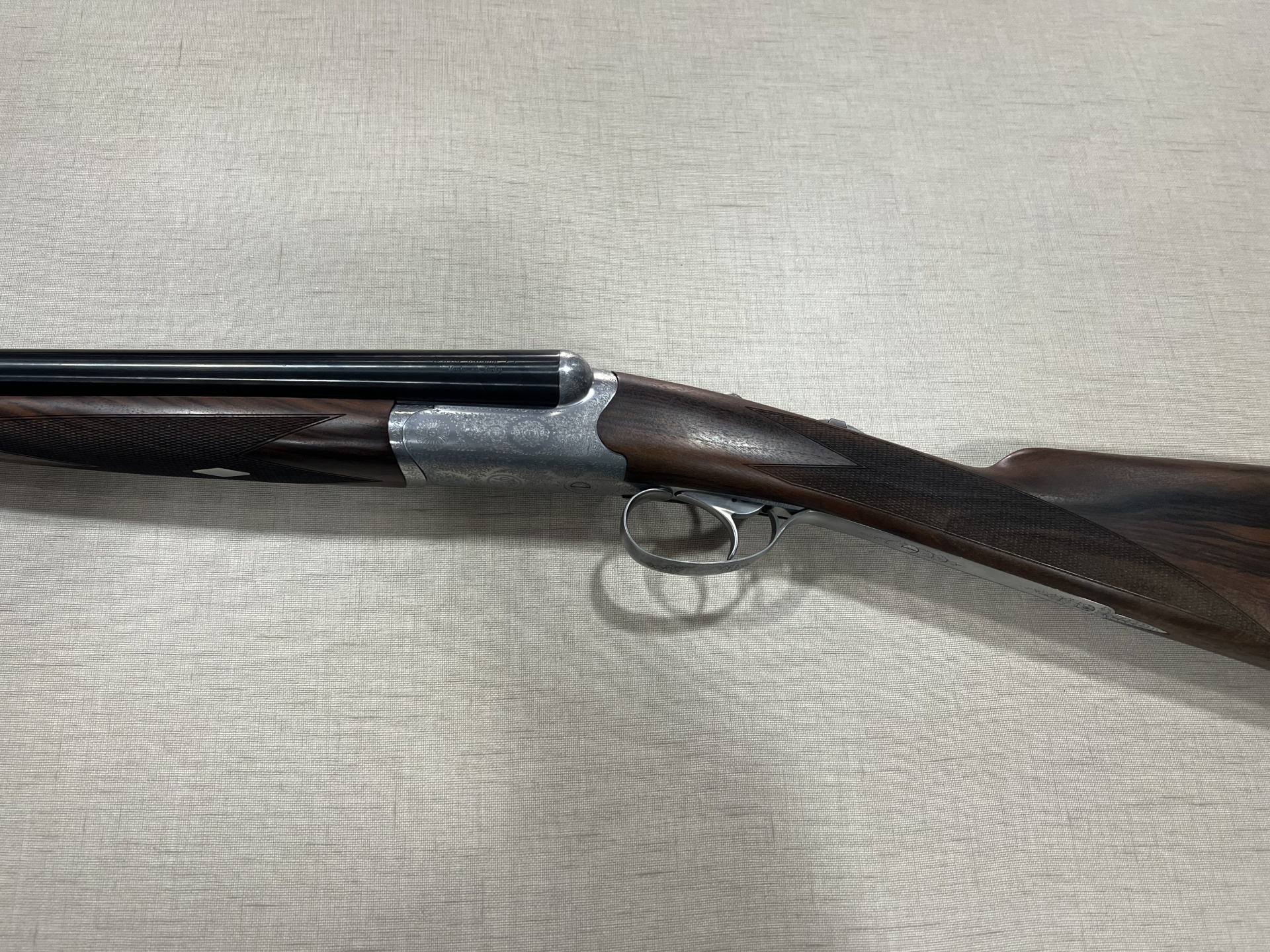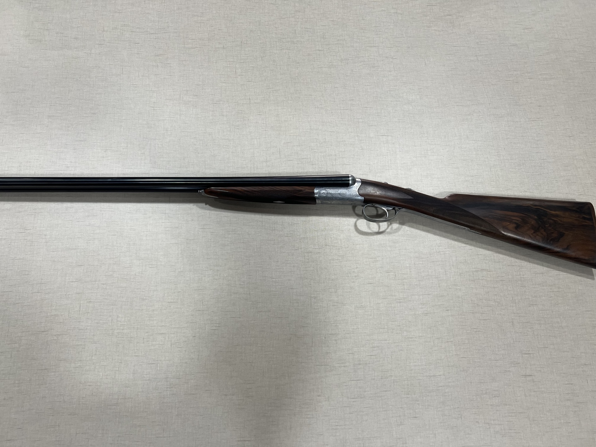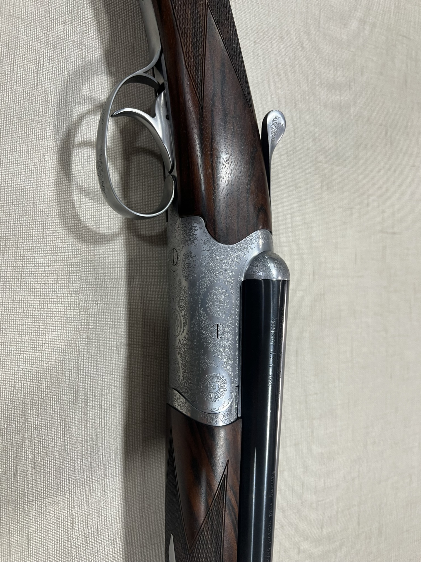 Espingarda de canos paralelos com punho em madeira e partes metálicas gravadas