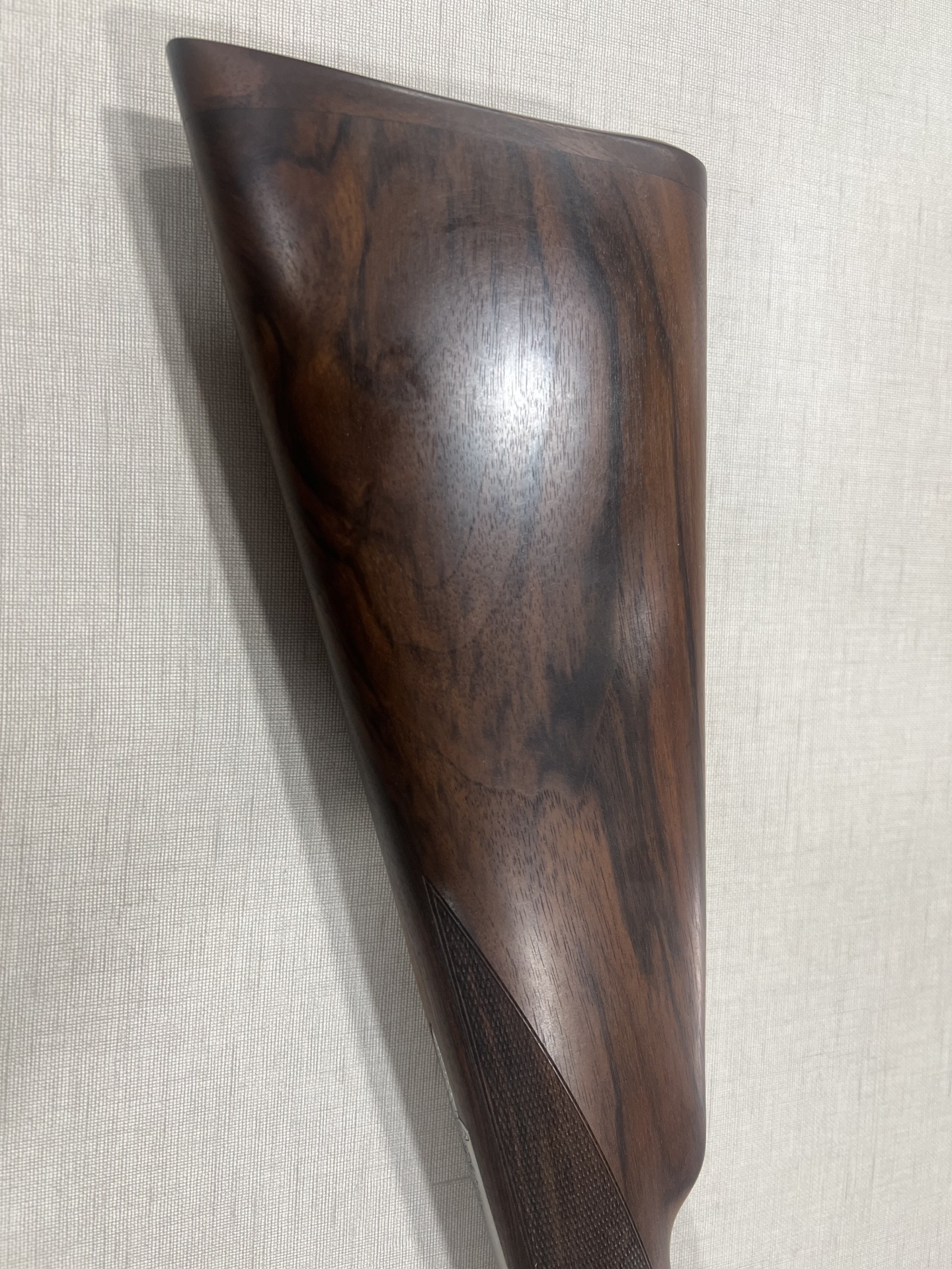 Espingarda com canos laterais e empunhadura em madeira escura com detalhes gravados