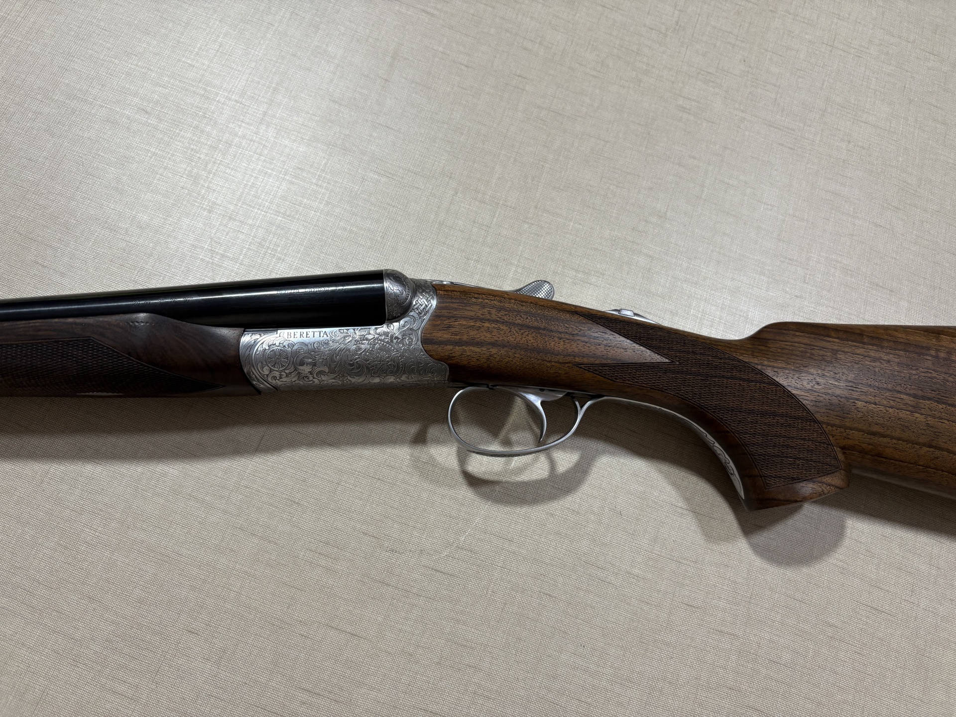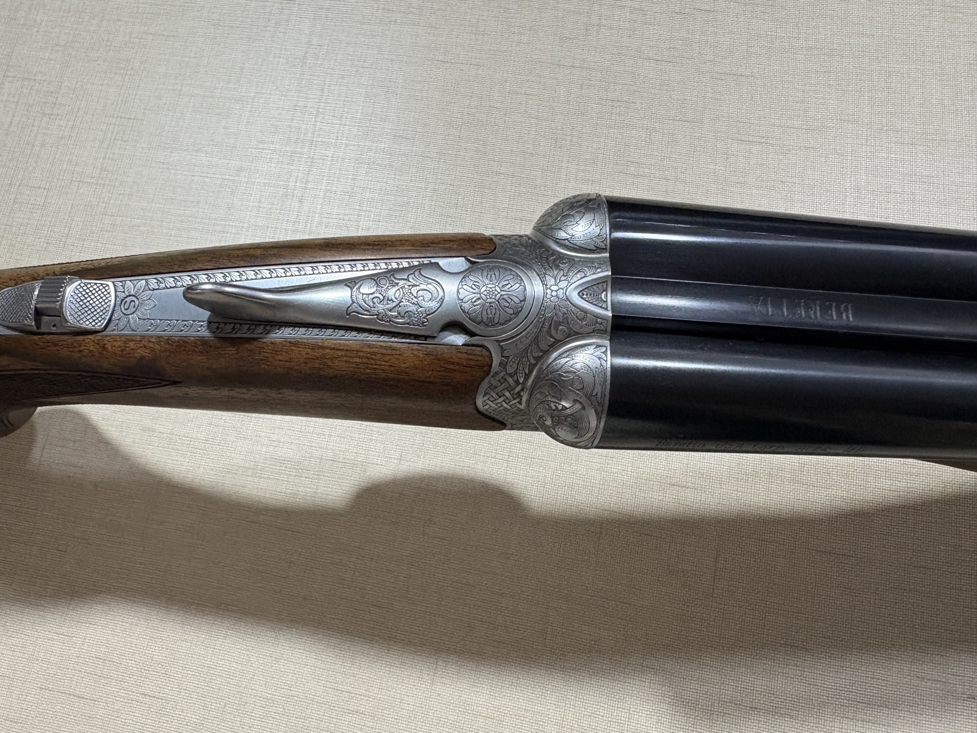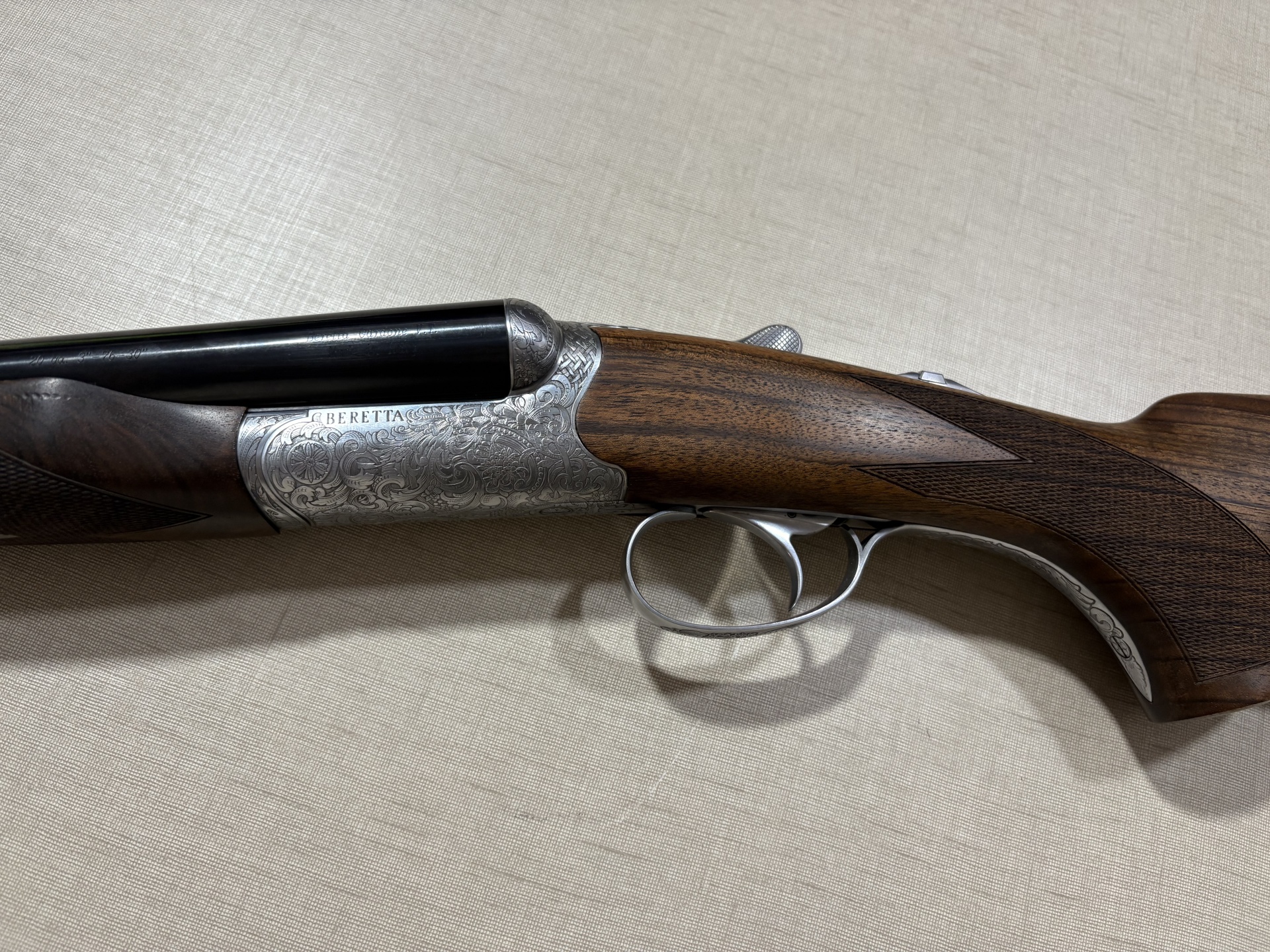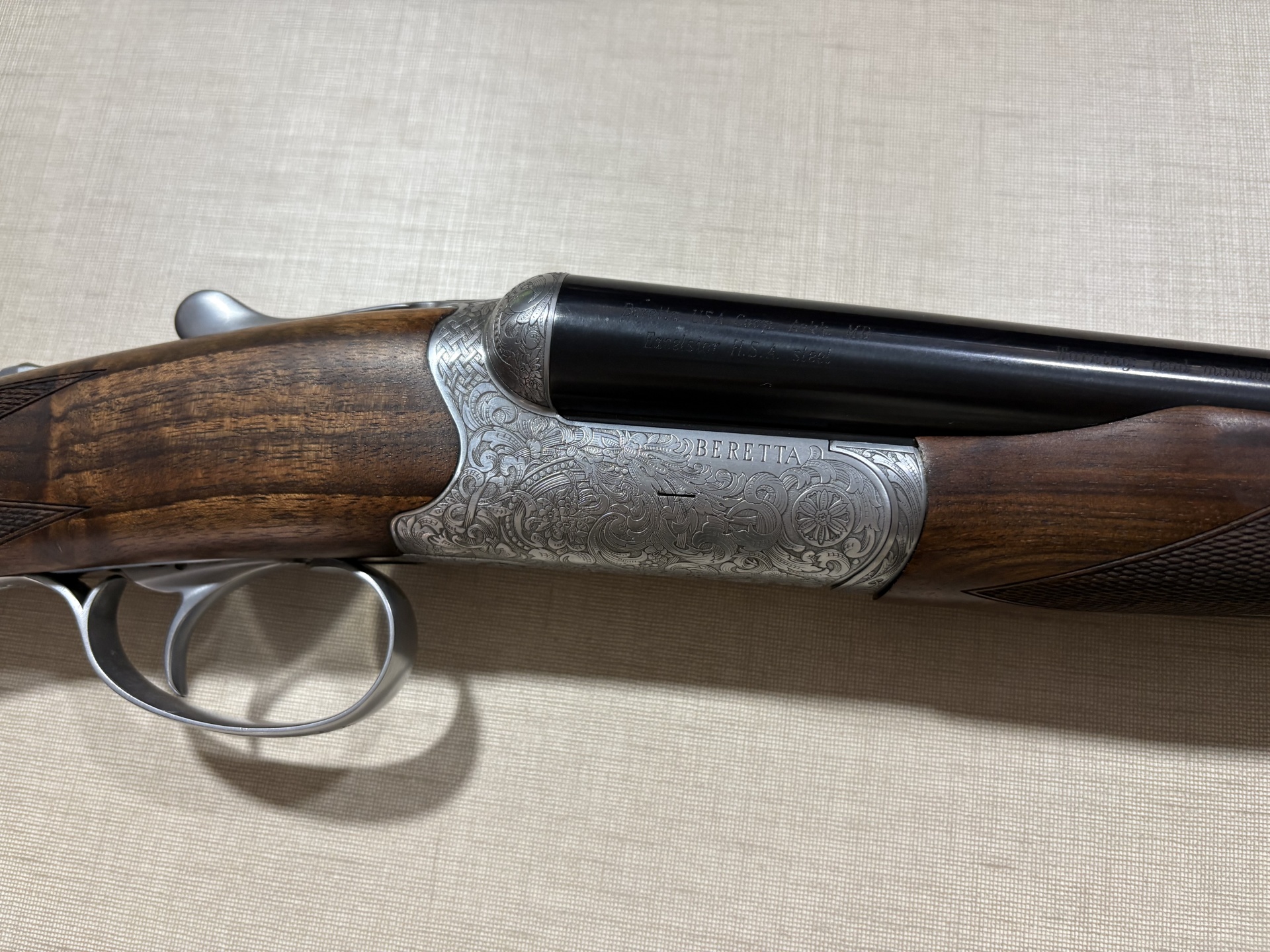 Espingarda dupla Beretta com caixa prateada gravada, canos pretos e madeira escura entalhada