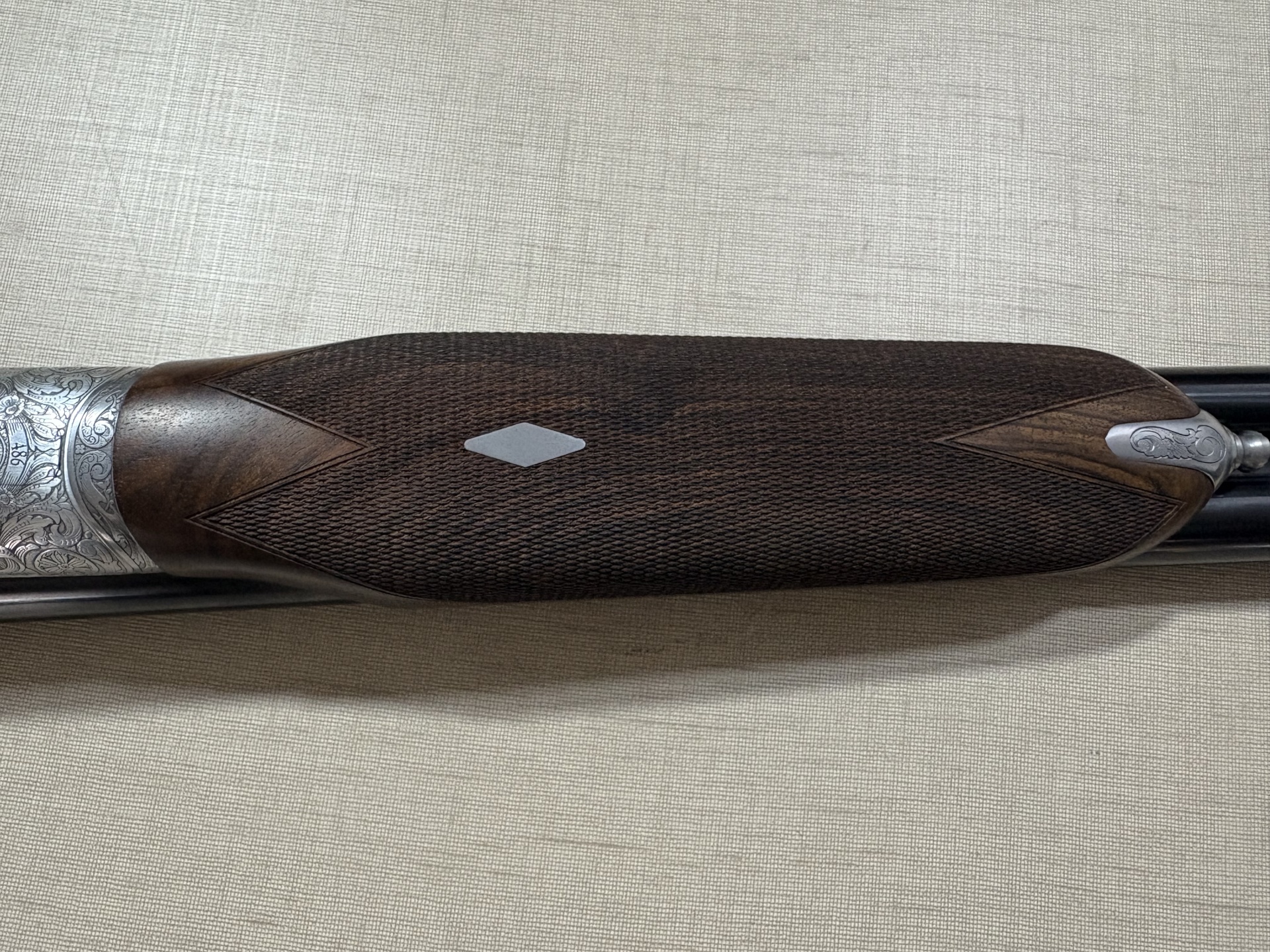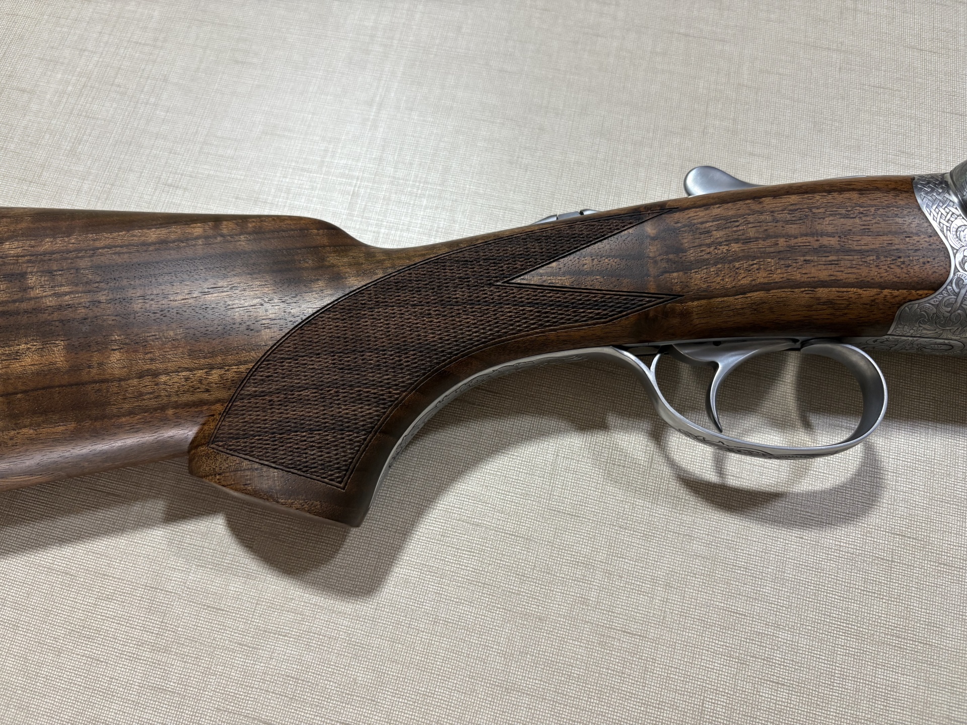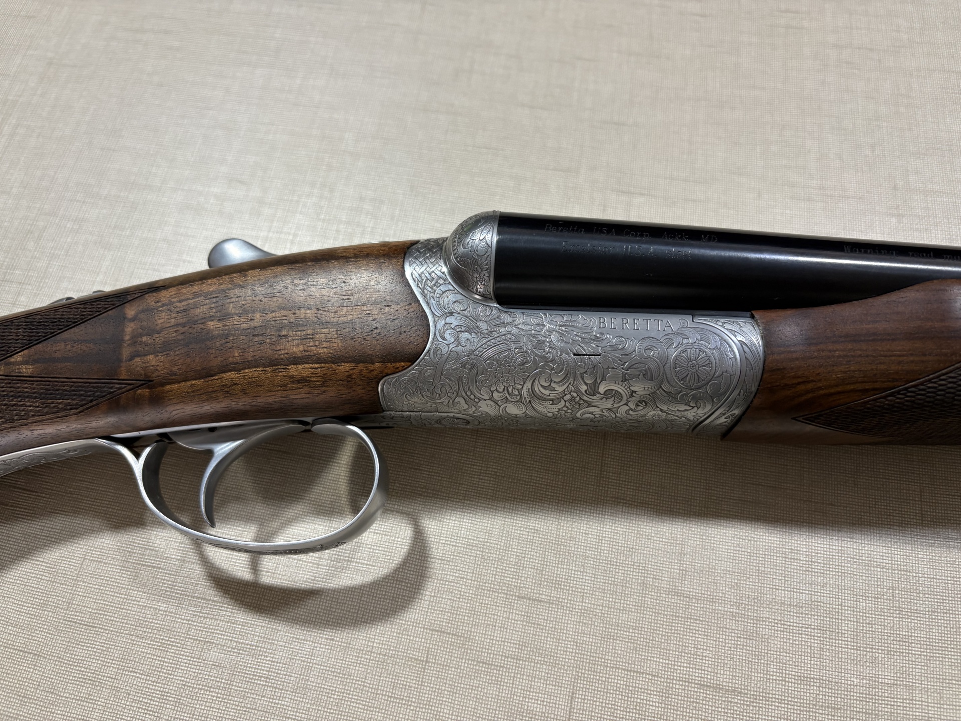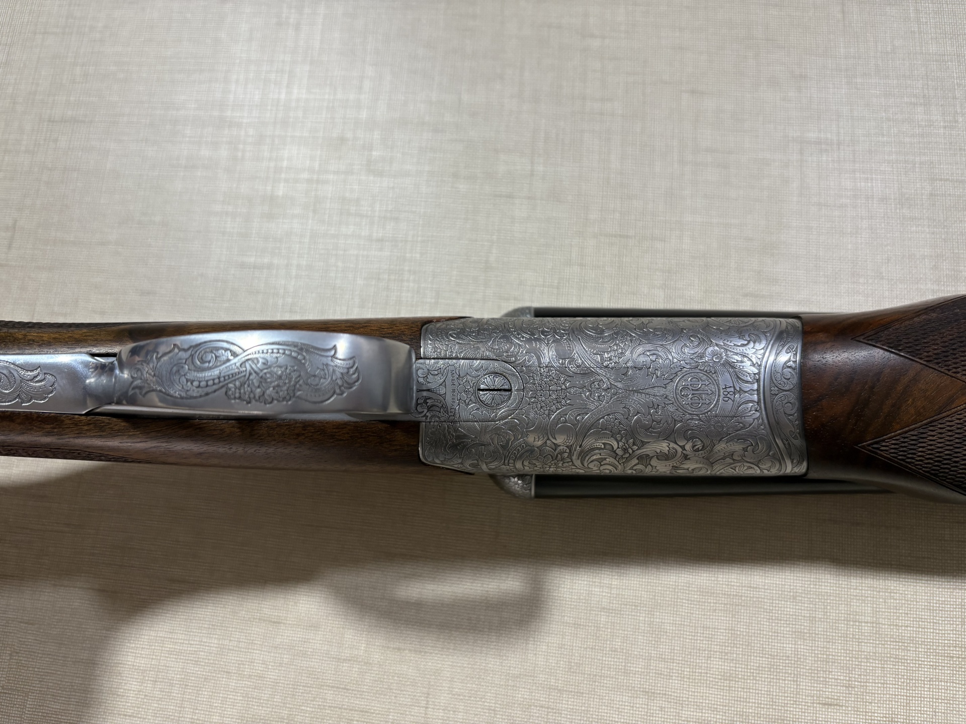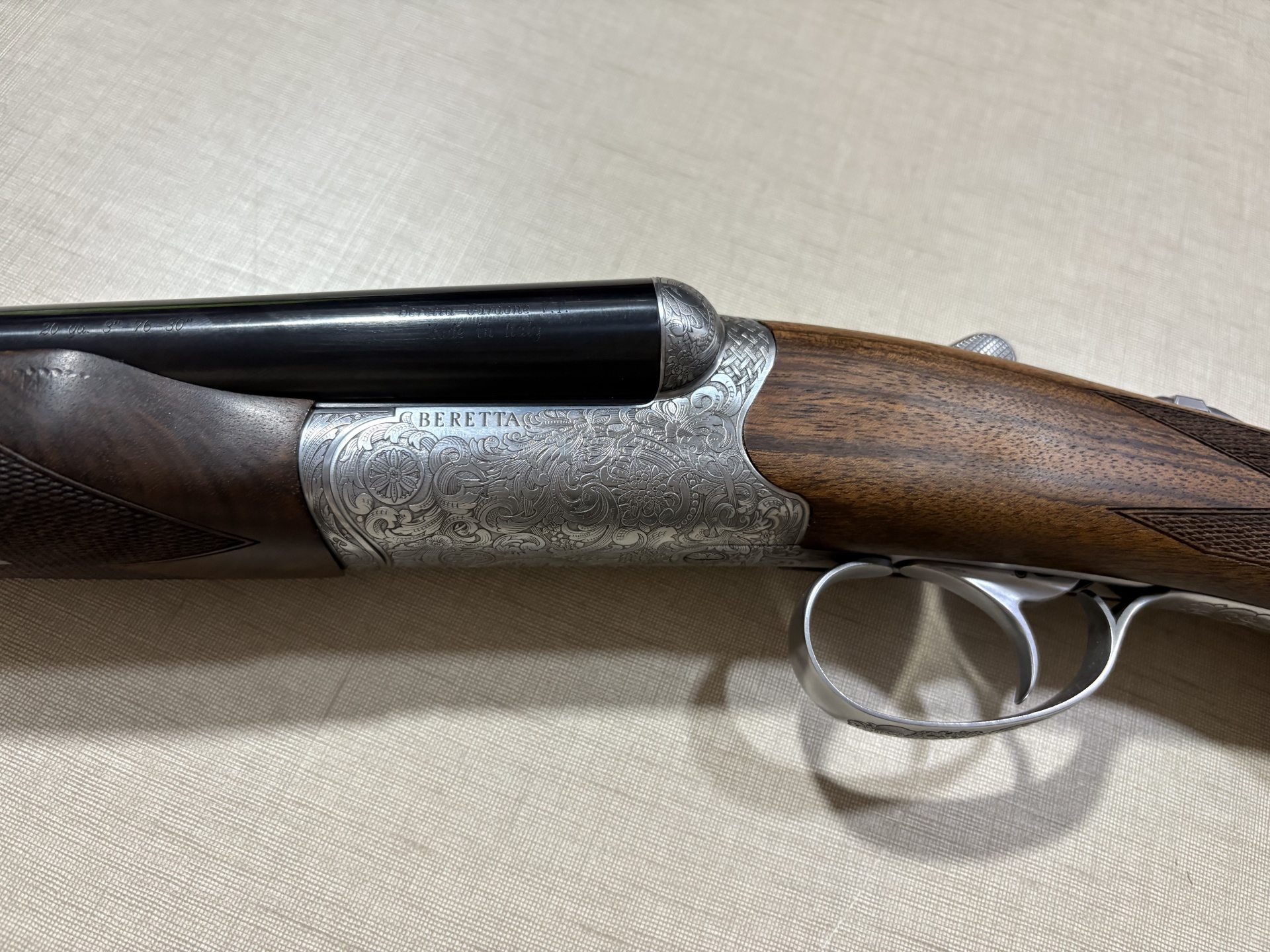 Espingarda dupla Beretta com caixa prateada gravada, canos pretos e madeira escura entalhada