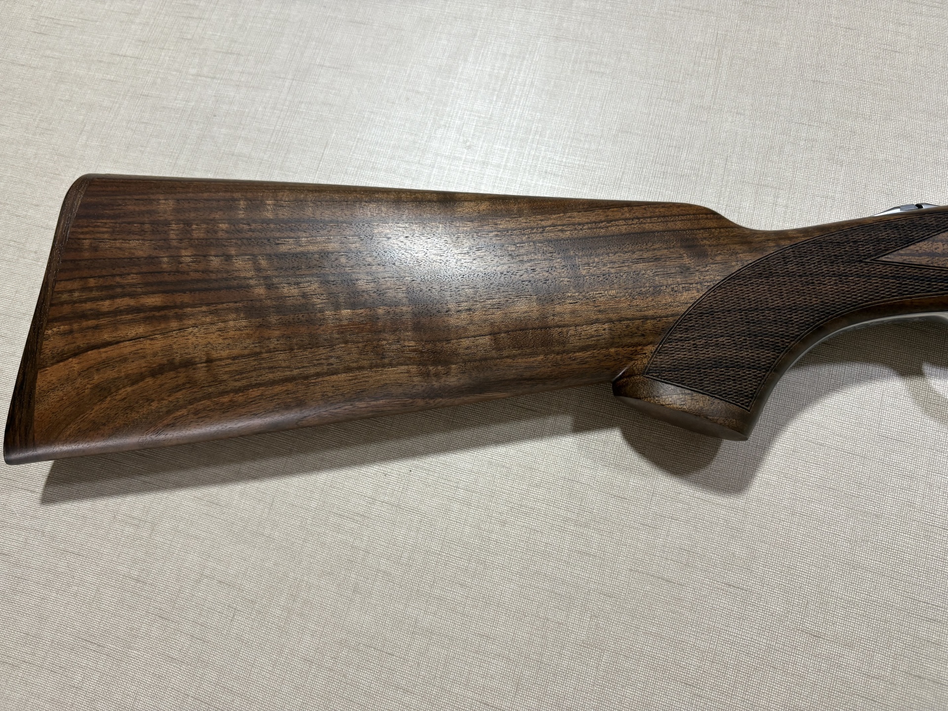 Espingarda Beretta com madeira castanha e metal prateado gravado em fundo claro