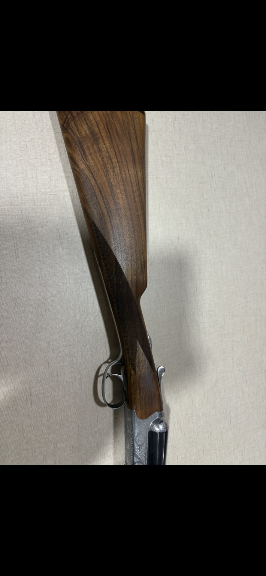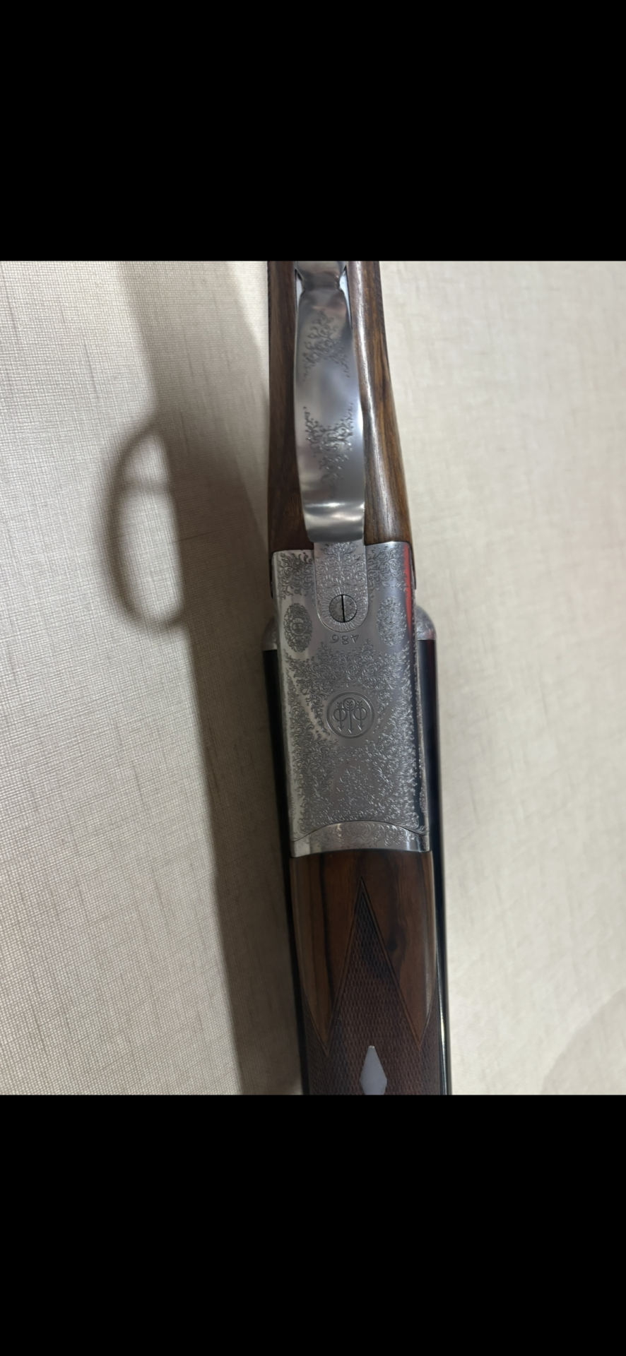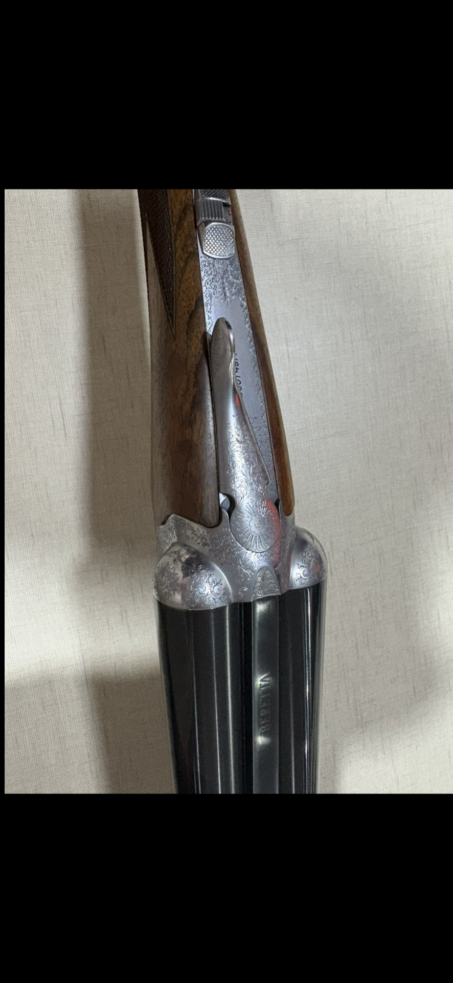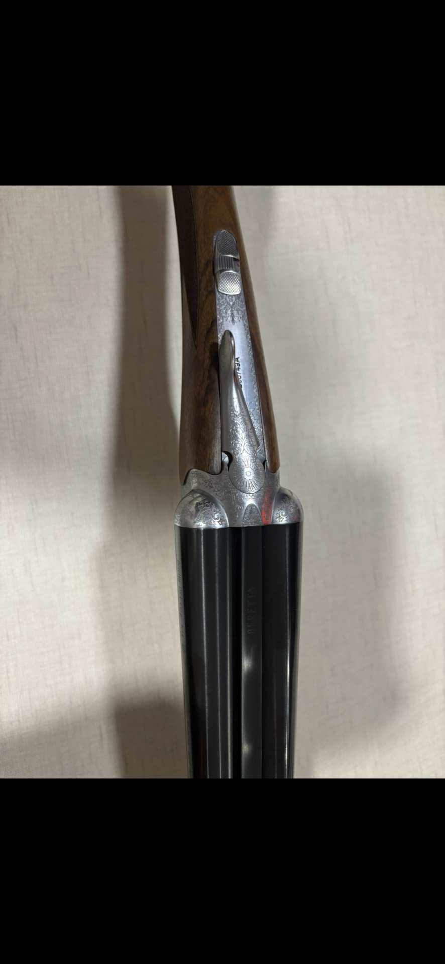 Espingarda dupla Beretta com coronha em madeira castanha e canos pretos