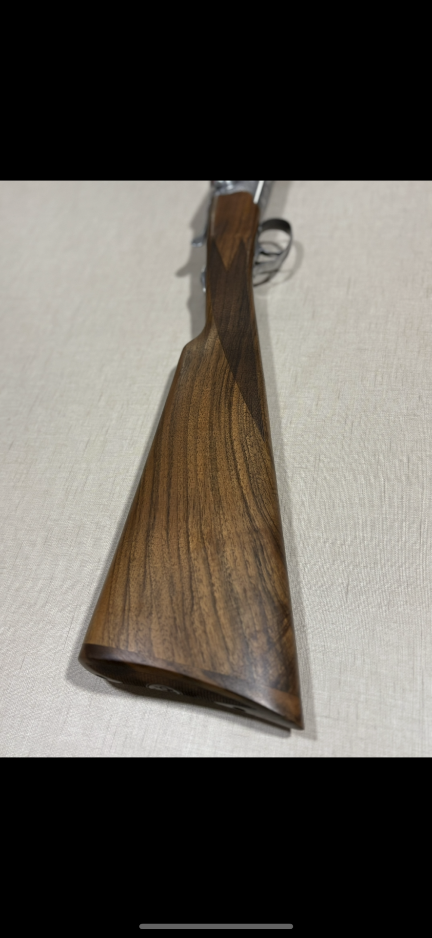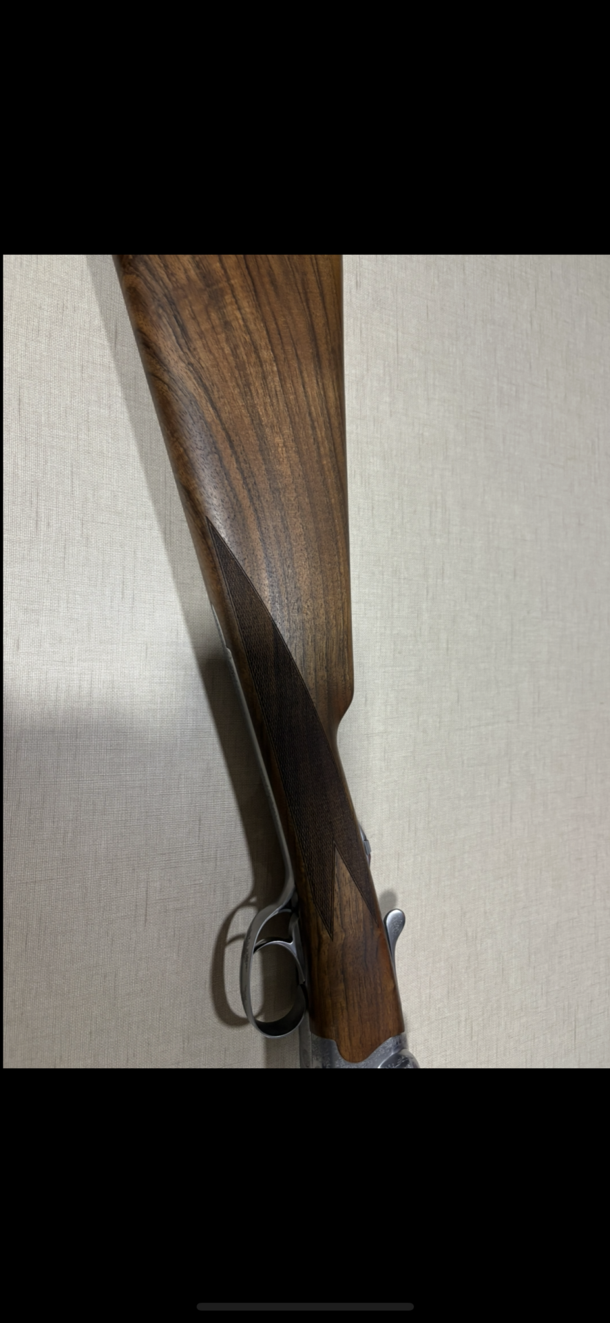 Parte traseira e gatilho de espingarda com coronha em madeira castanha e detalhes metálicos