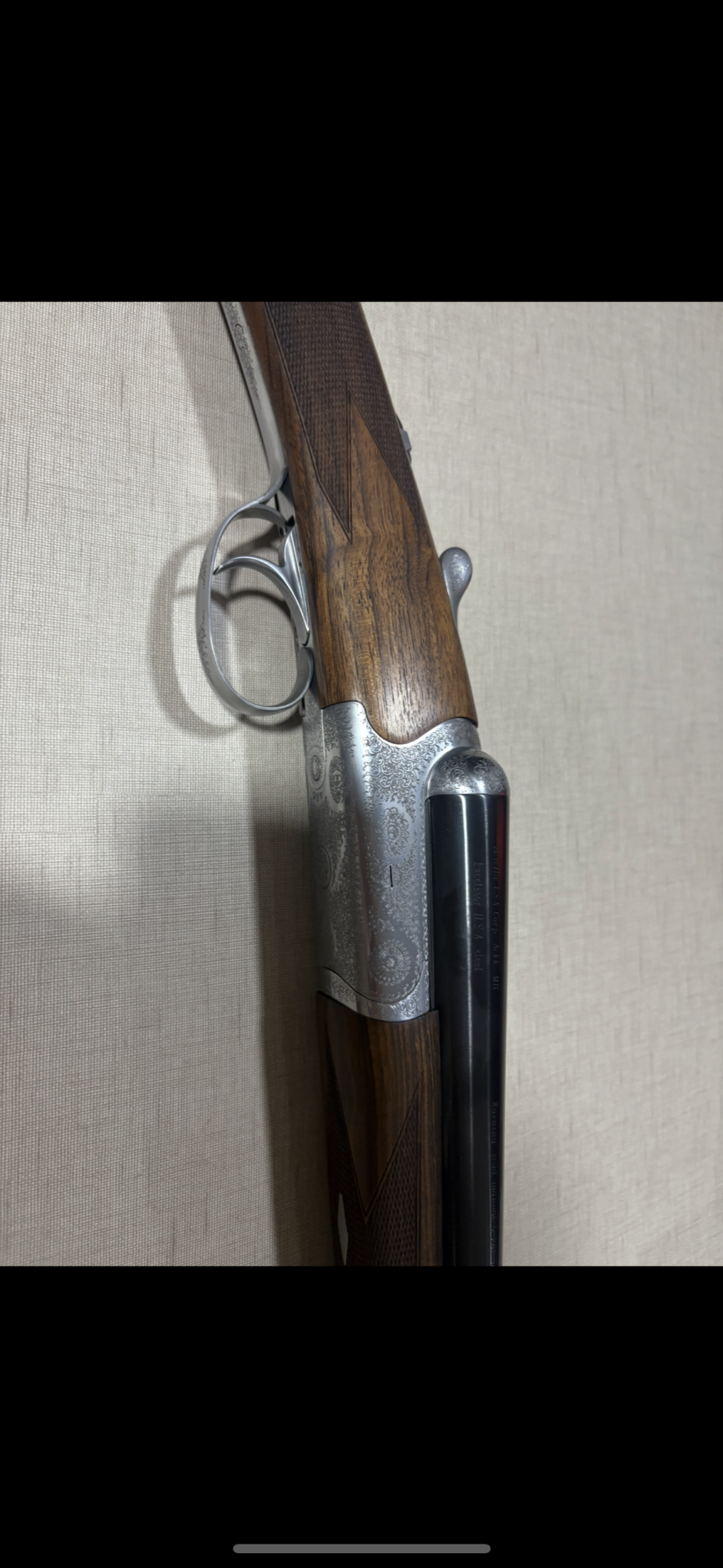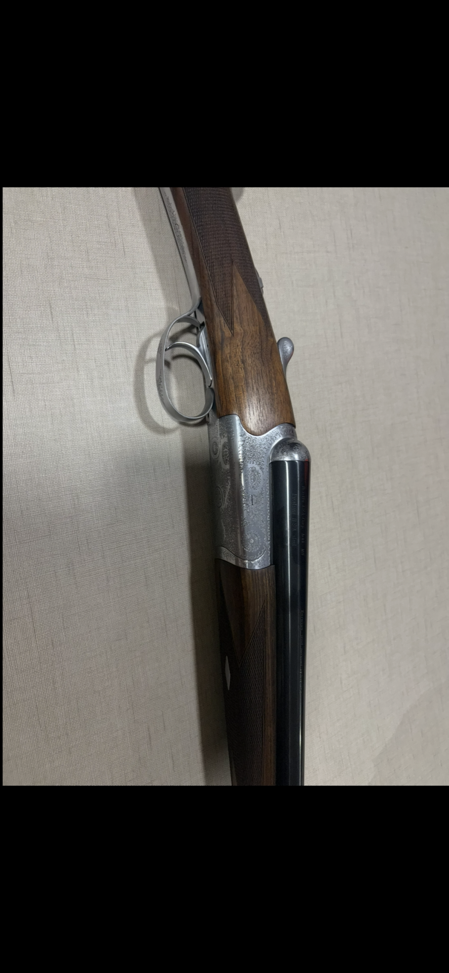 Espingarda de canos duplos com coronha em madeira escura e partes metálicas gravadas