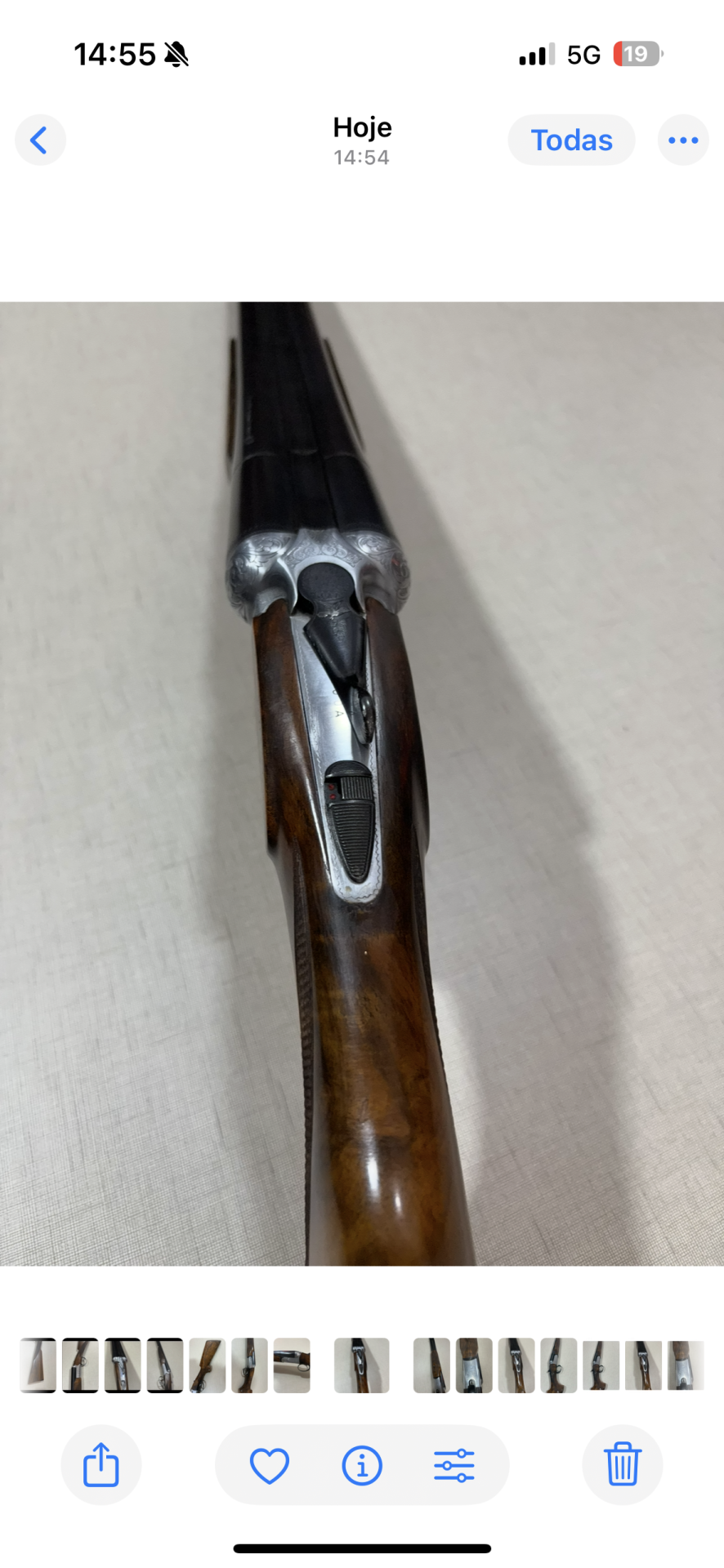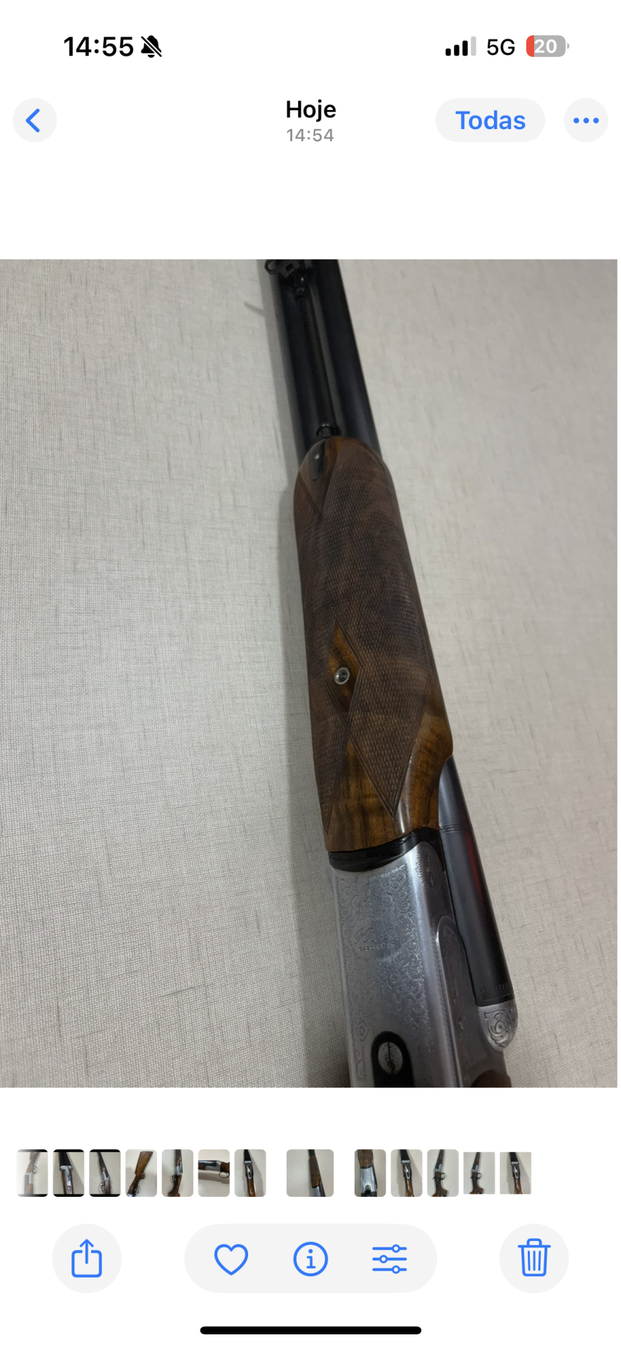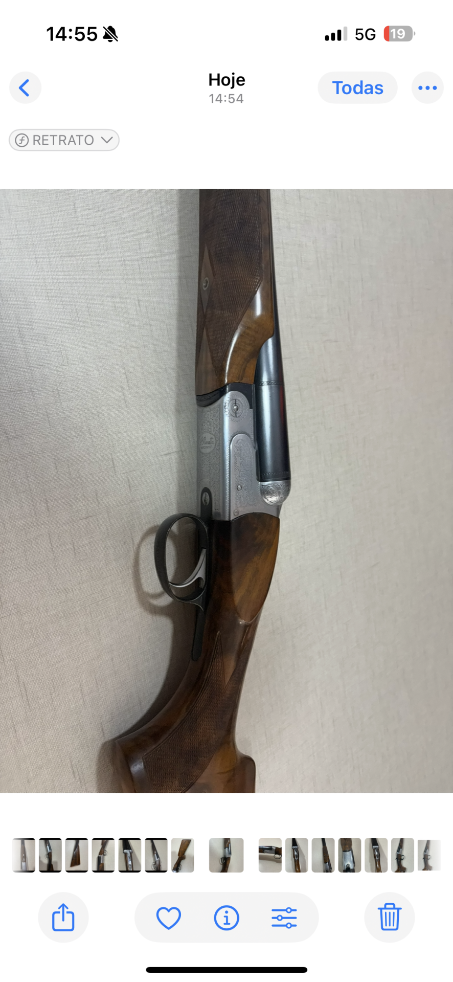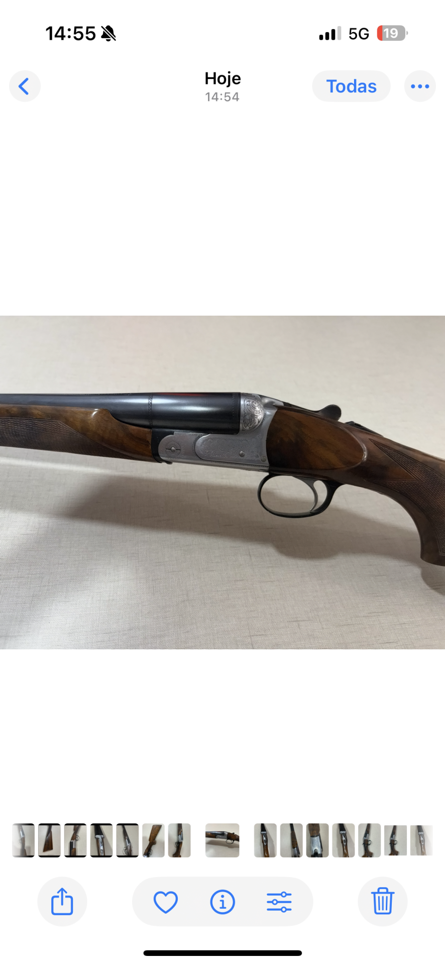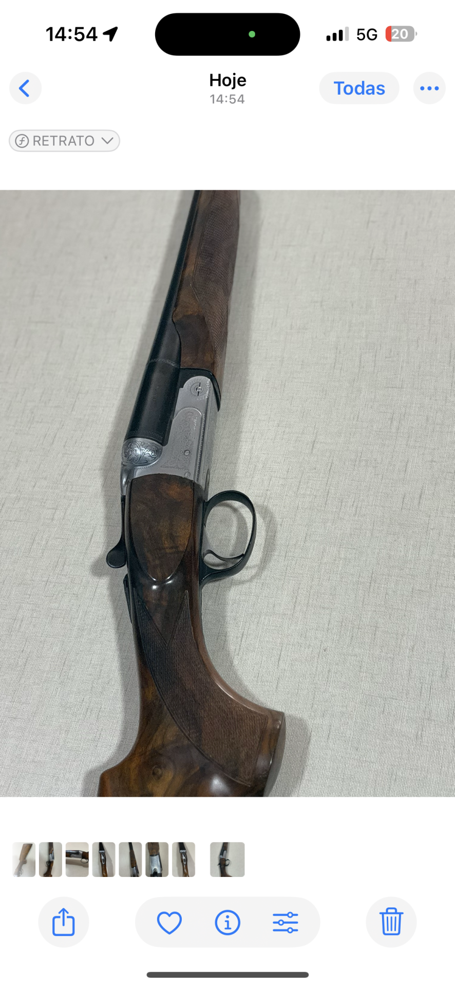 Espingarda de canos duplos com madeira polida e detalhes metálicos gravados