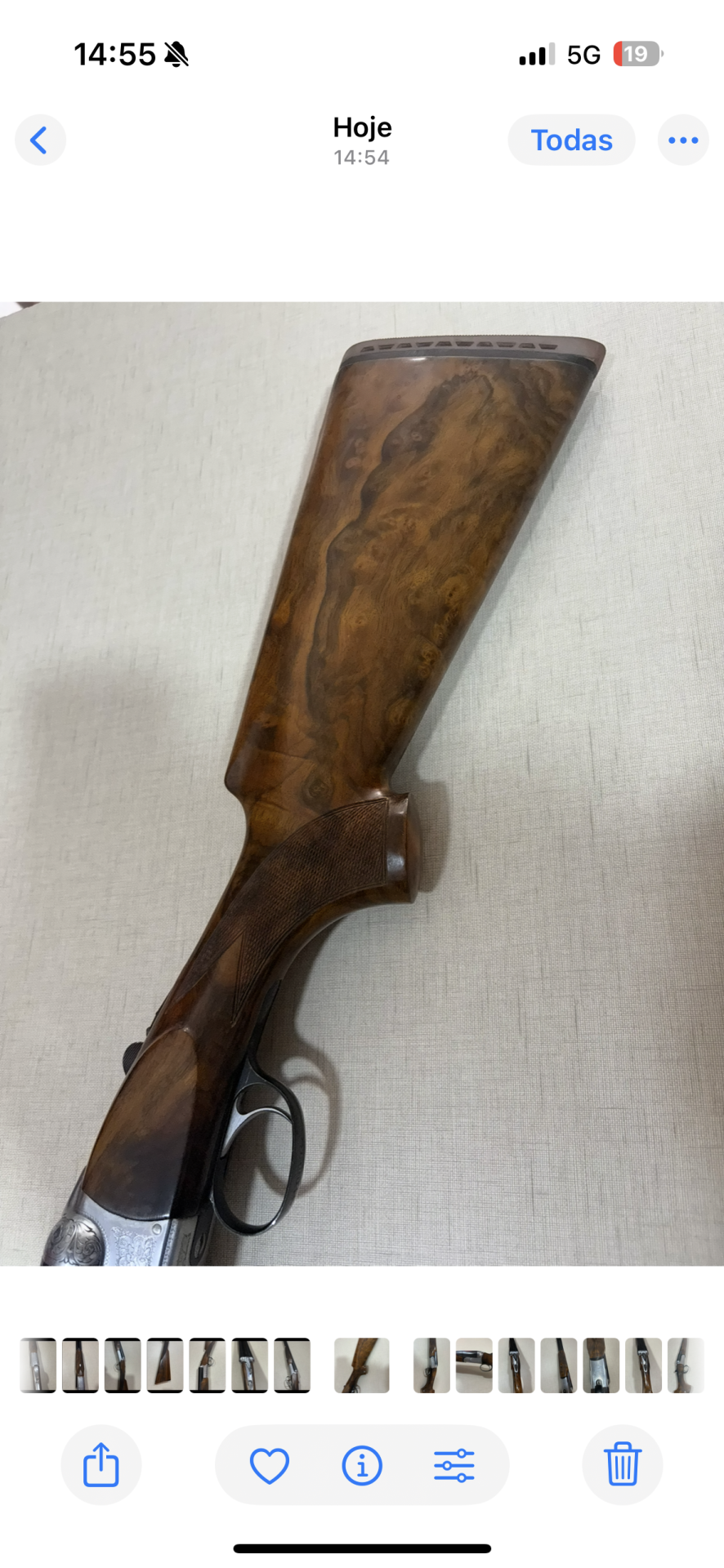 Coronha de espingarda em madeira castanha com detalhes em metal num fundo cinza.