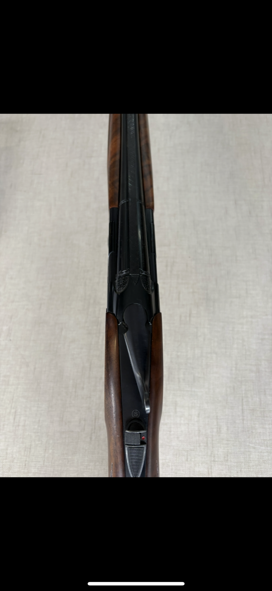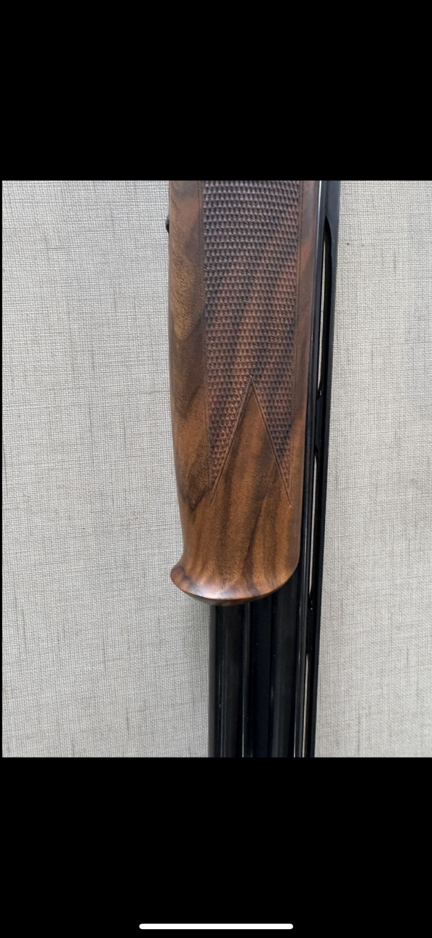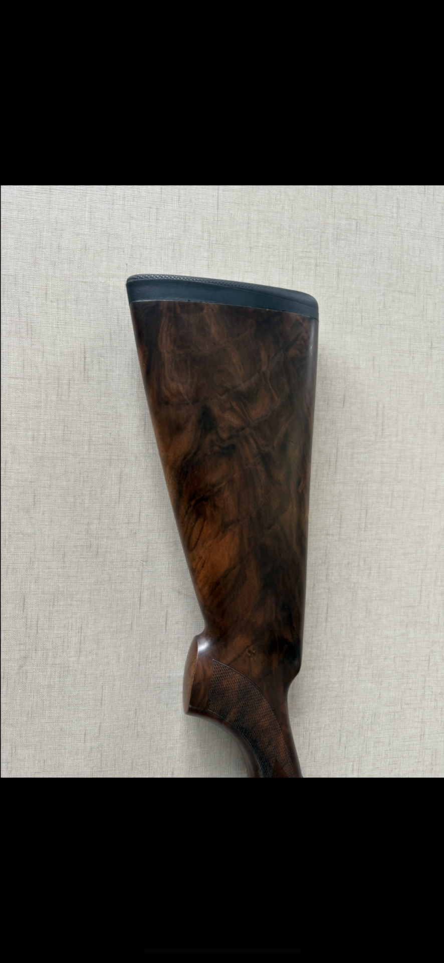 Espingarda de caça com madeira castanha e metal preto, com gravação Beretta
