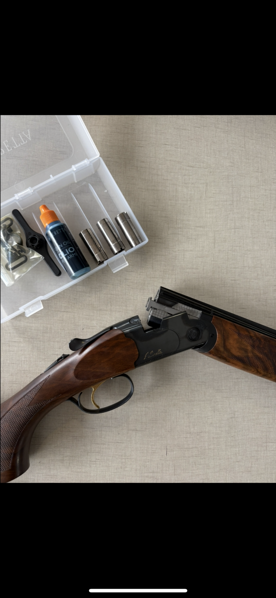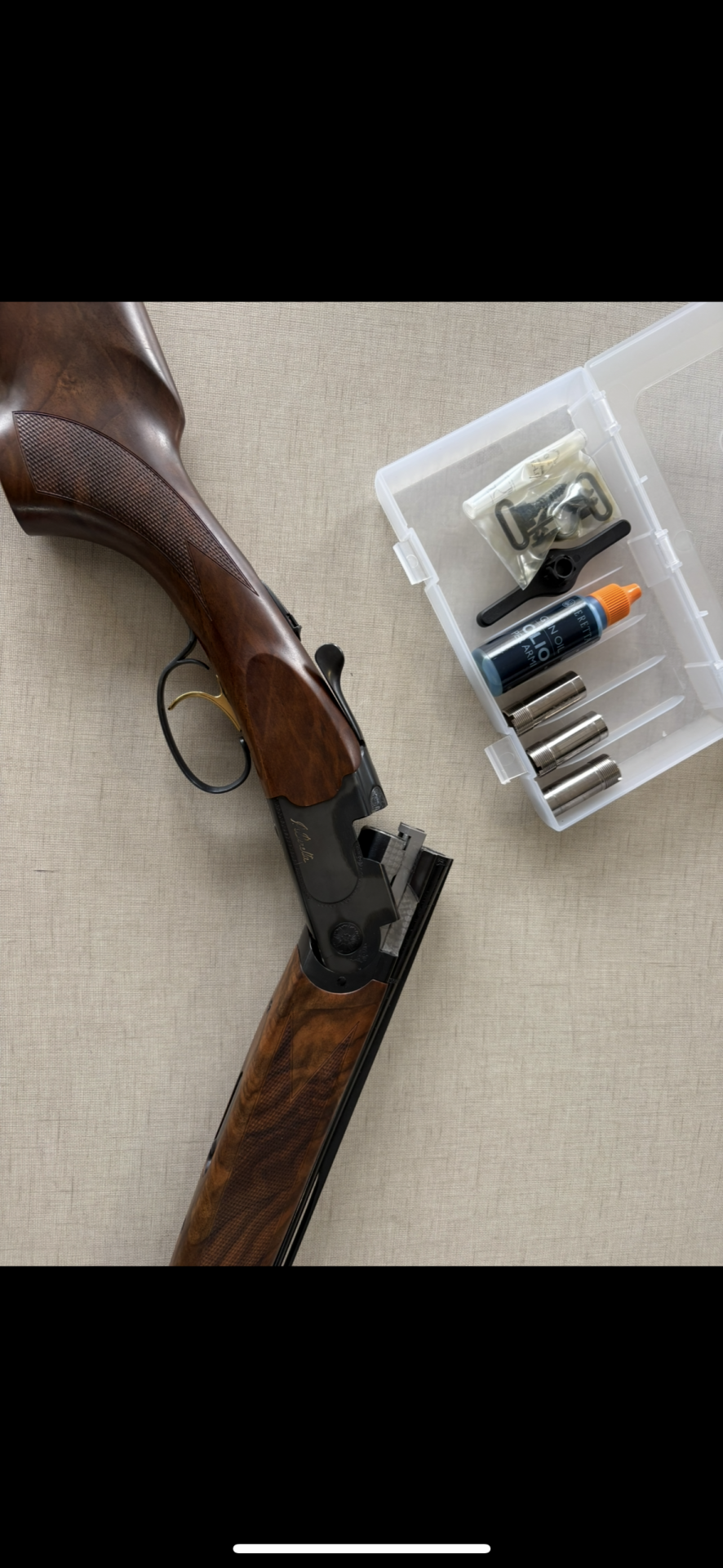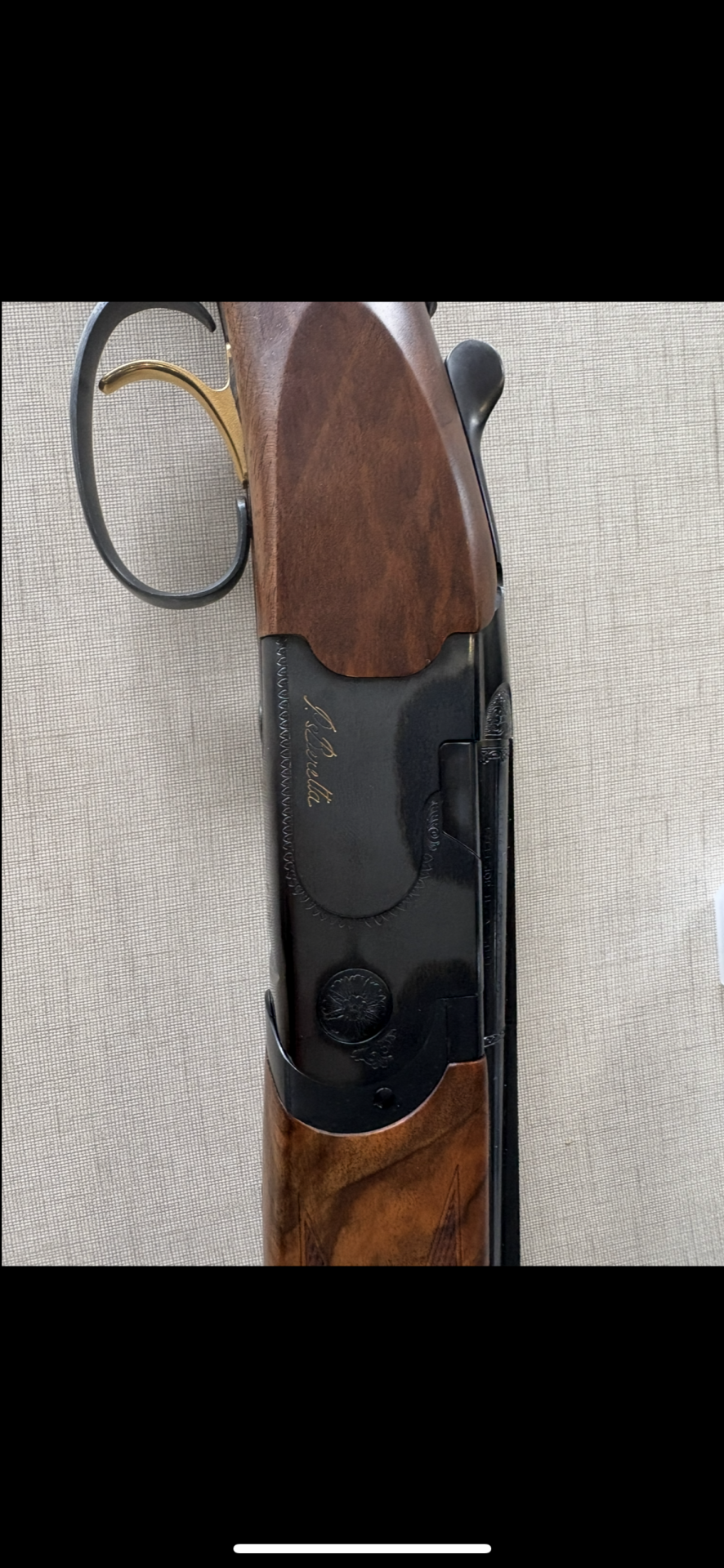 Espingarda de caça em madeira castanha com gatilho dourado e caixa de plástico BERETTA ao lado