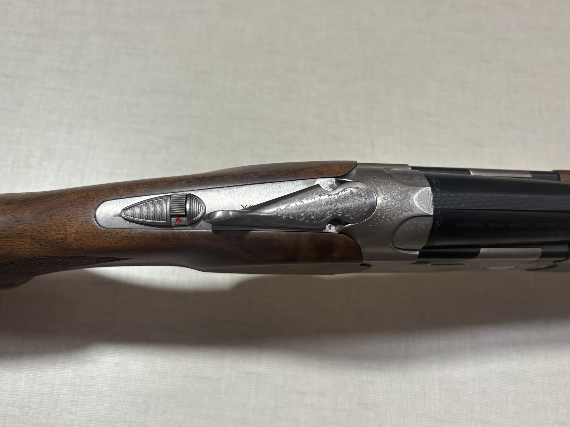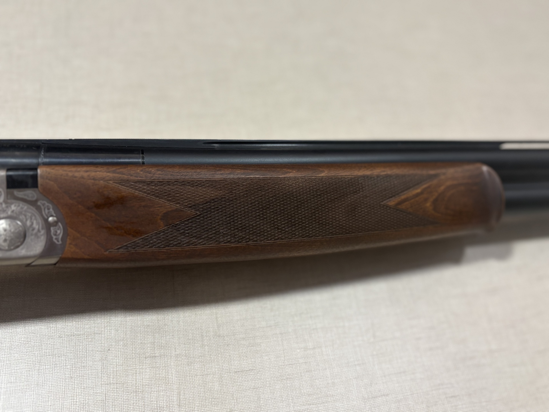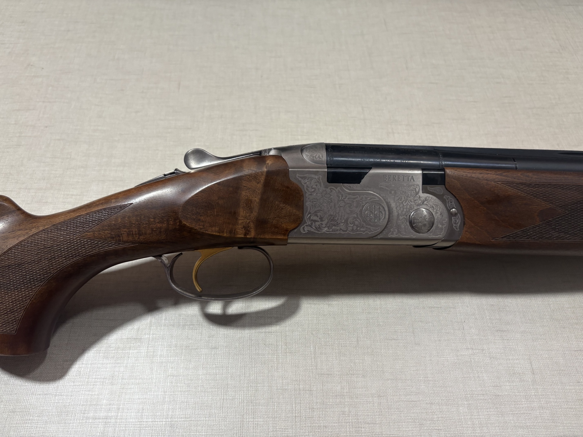 Espingarda de caça Beretta com coronha de madeira castanha e corpo metálico gravado.