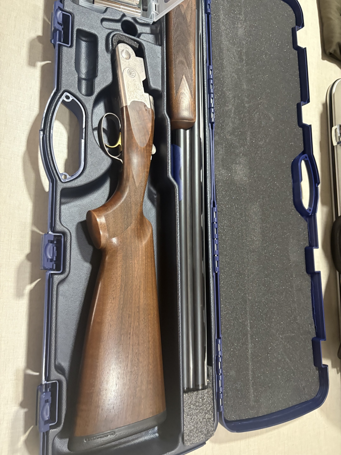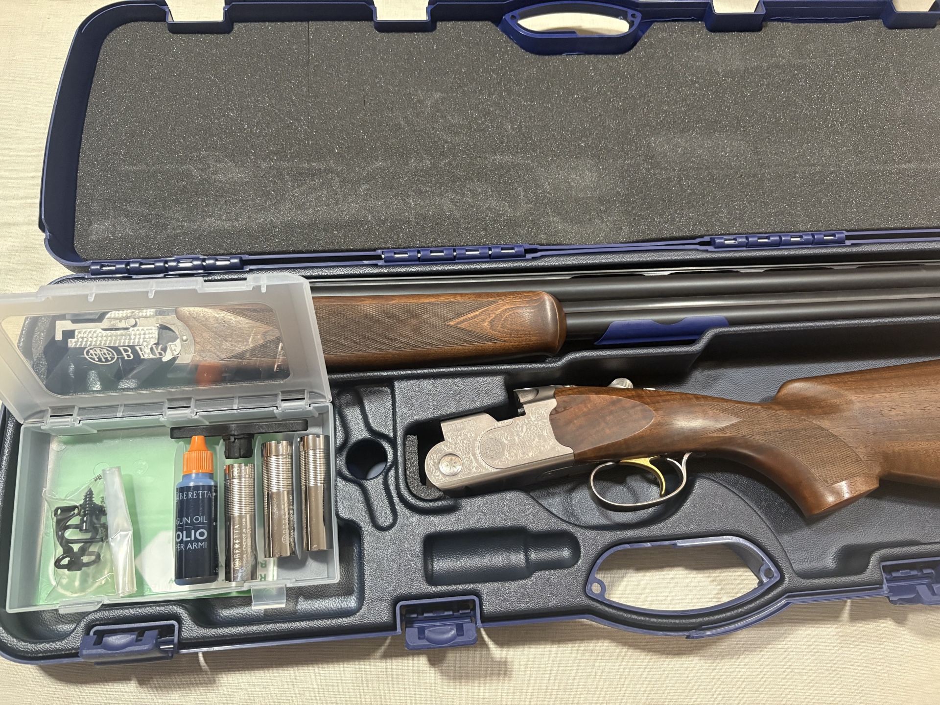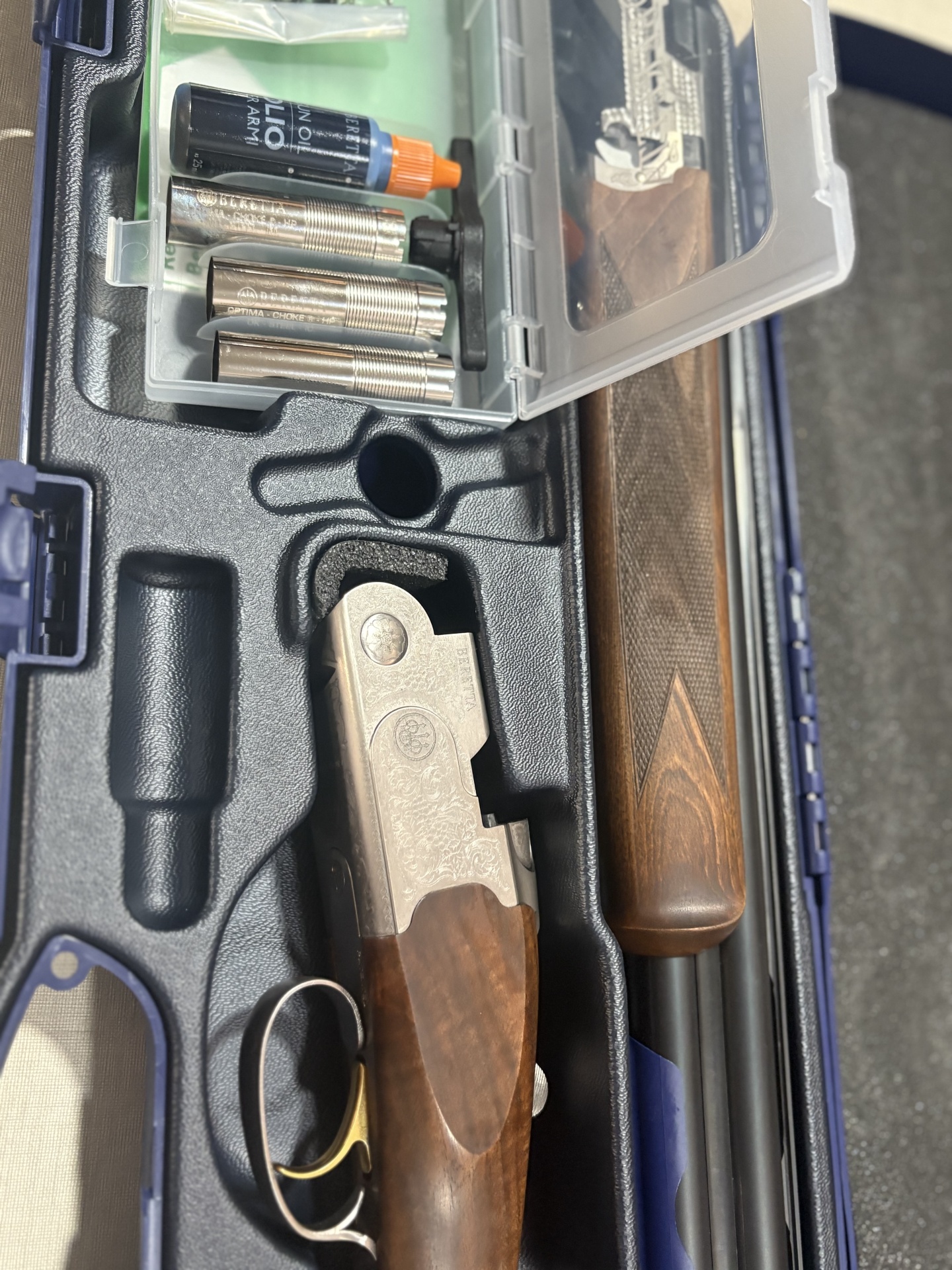 Espingarda Beretta de madeira e metal dentro de estojo azul com acessórios